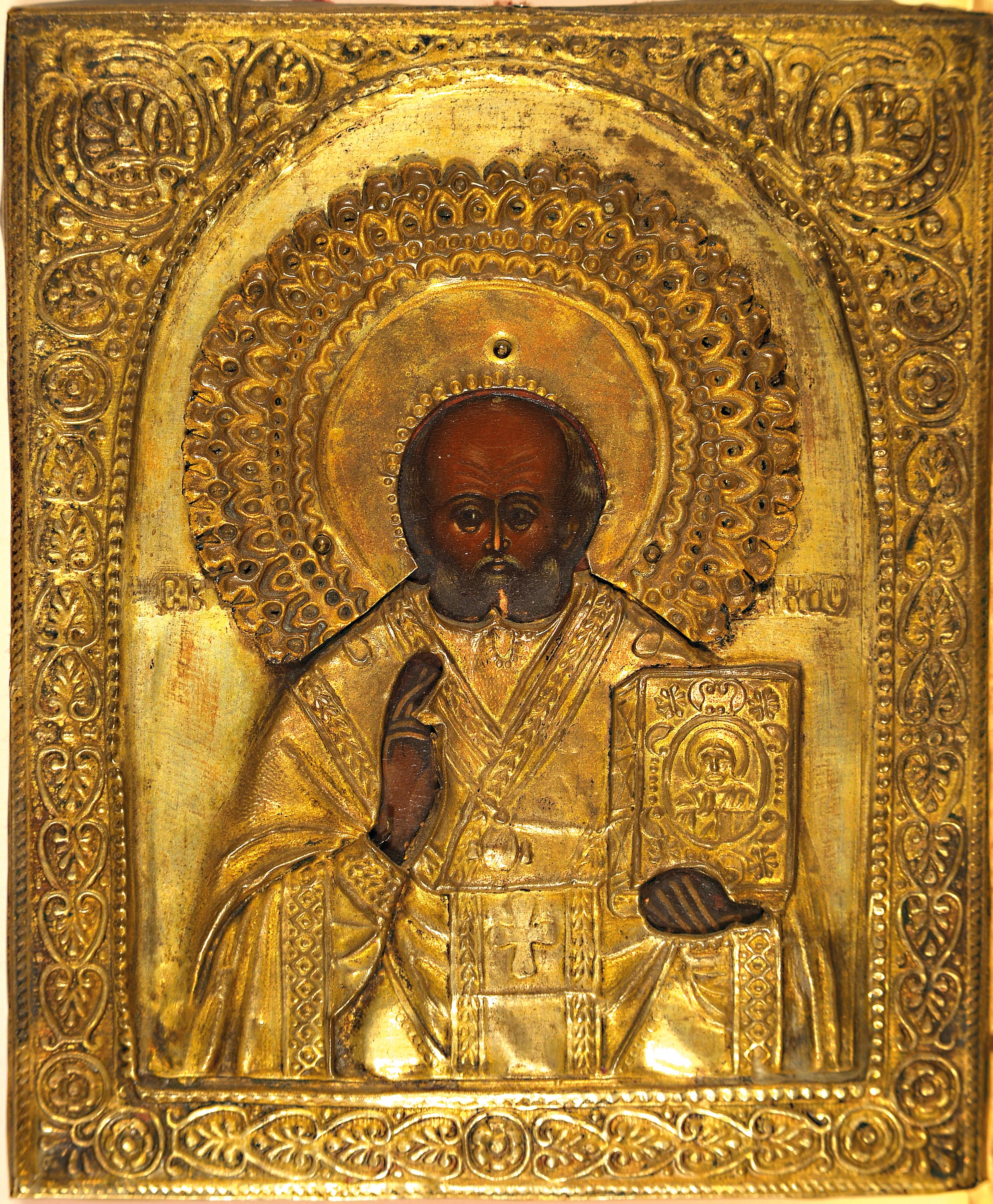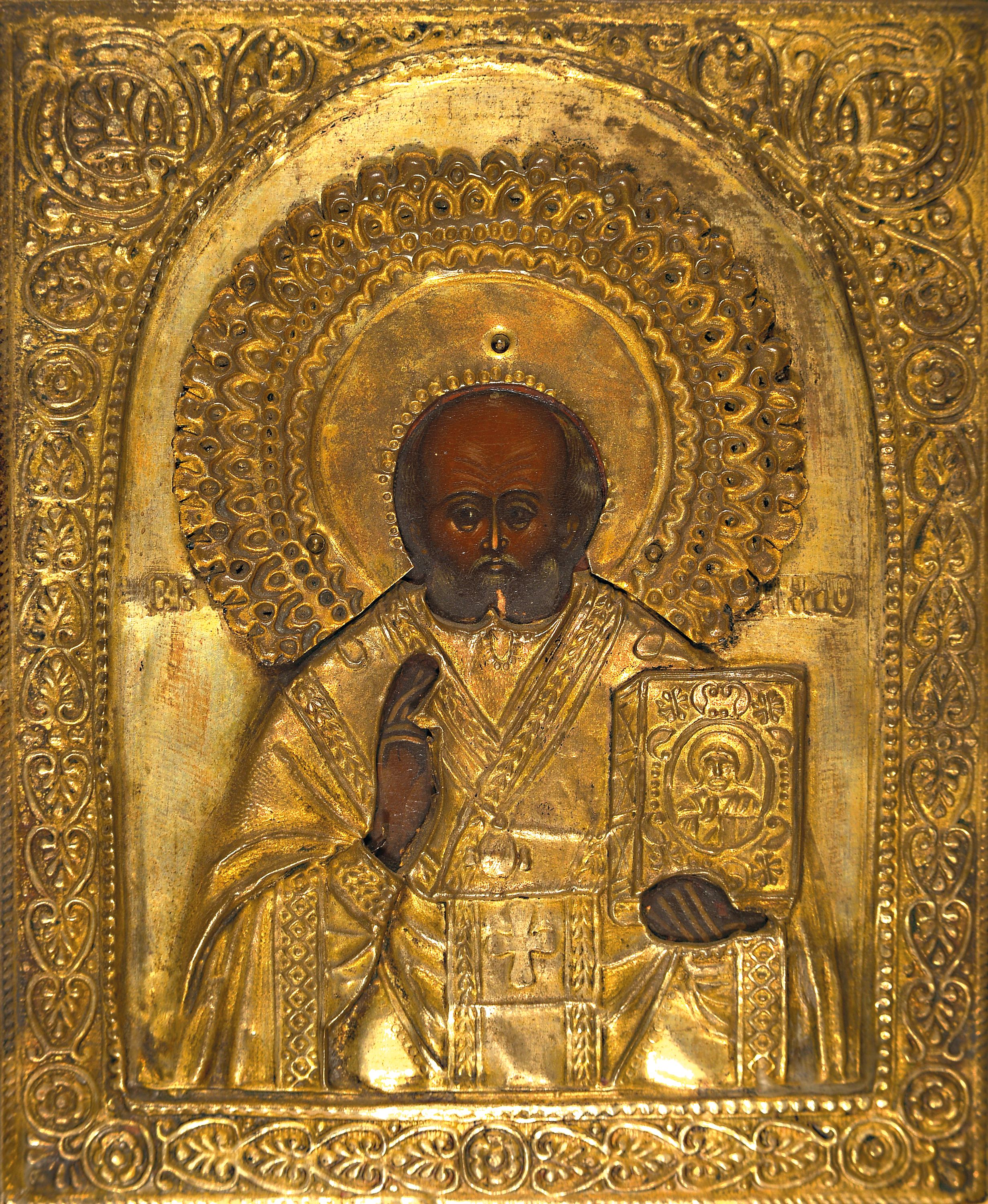 Kleine Ikone, Russland, Ende 19. Jh., Hl. Nikolaus, Tempera auf Holz, geprägtes