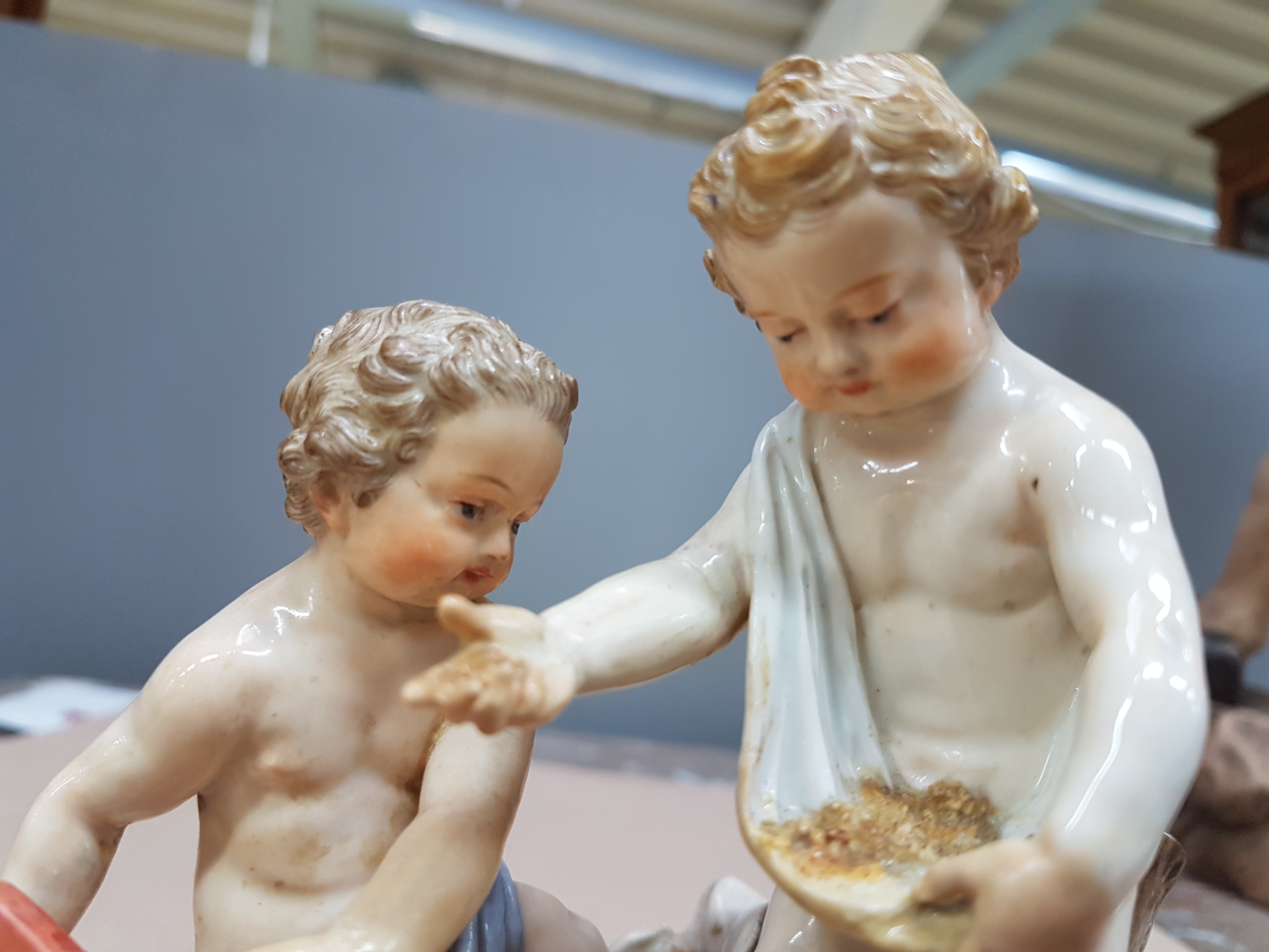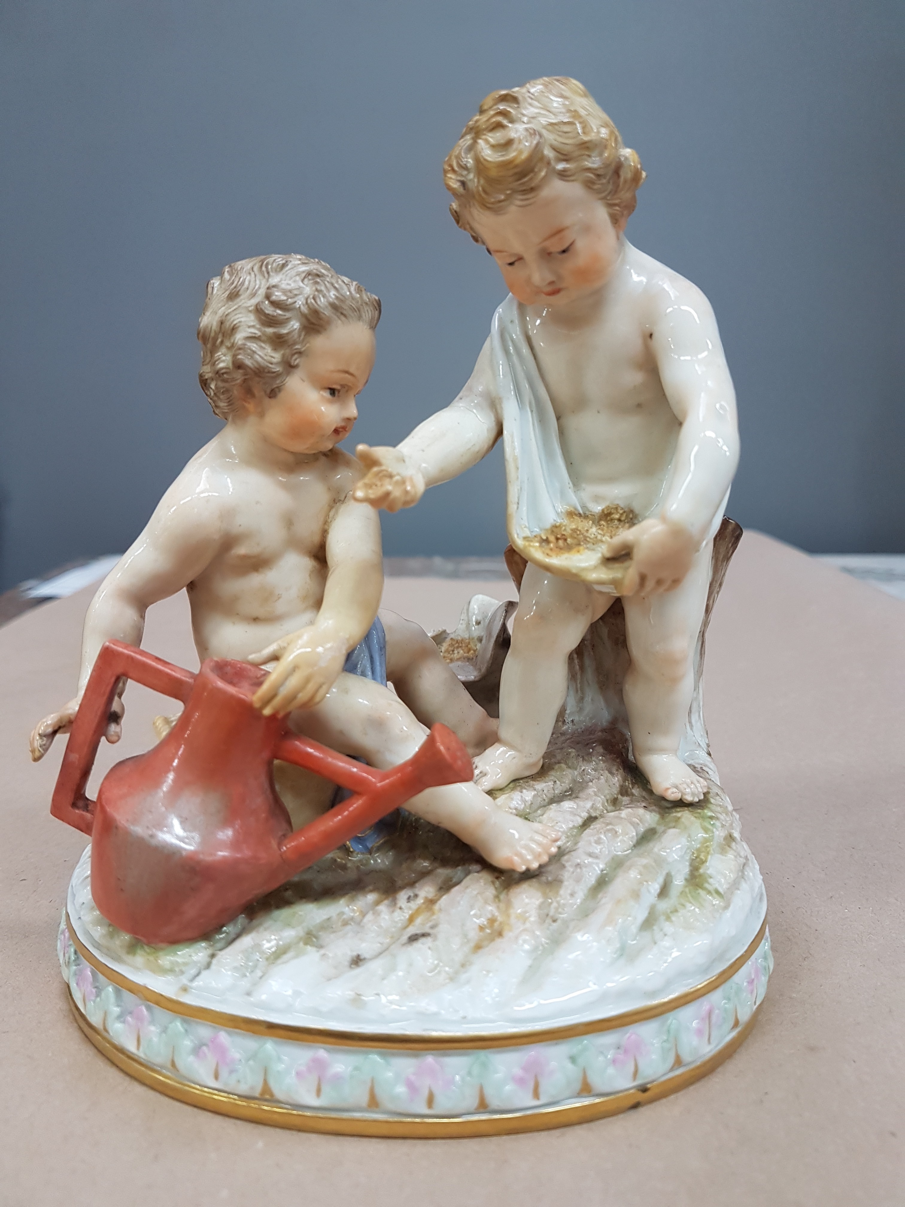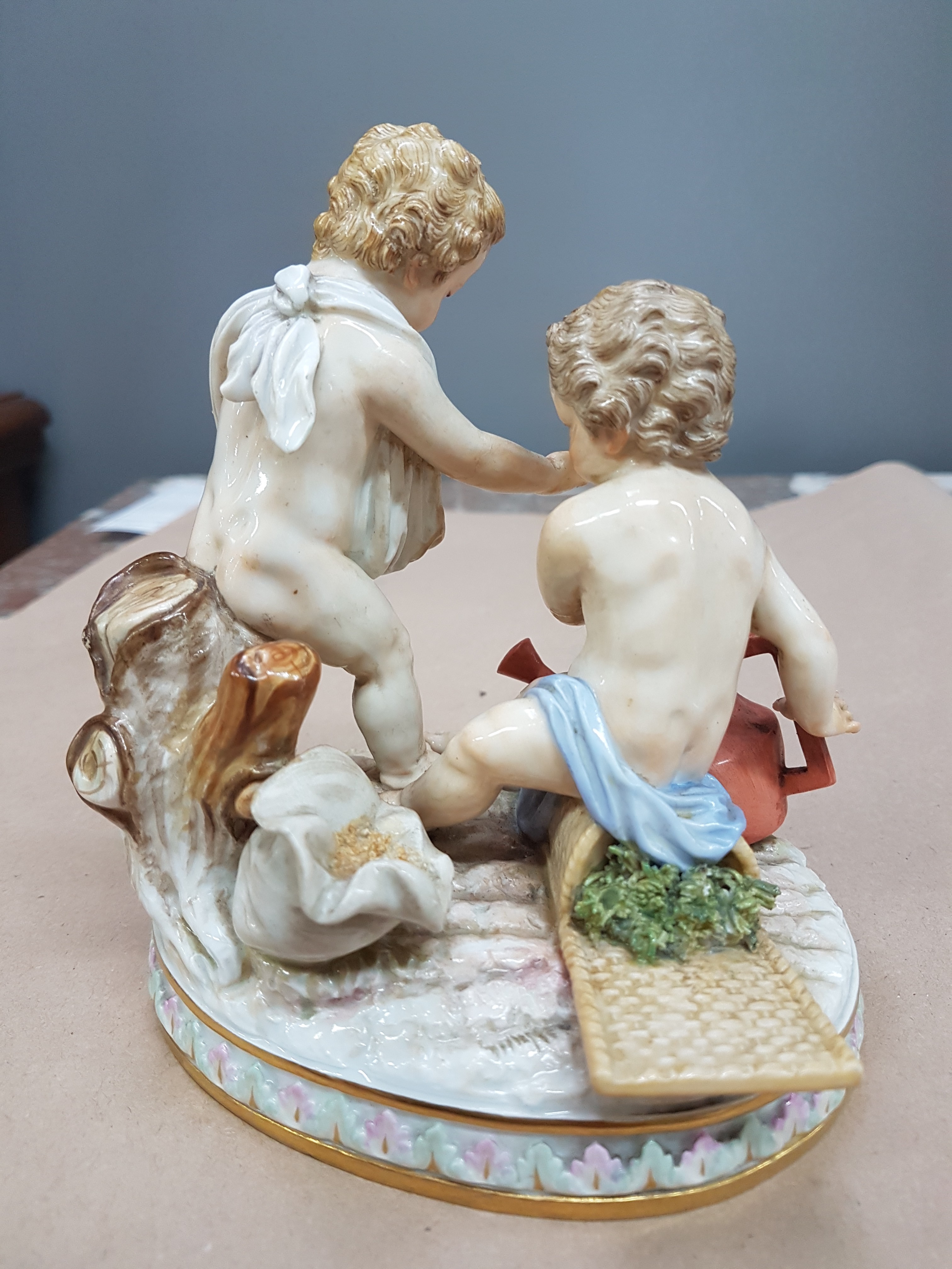 Ackerbau, Modellnr. C 44, zwei stehende Amoretten auf ovalem Sockel, beim Säen und