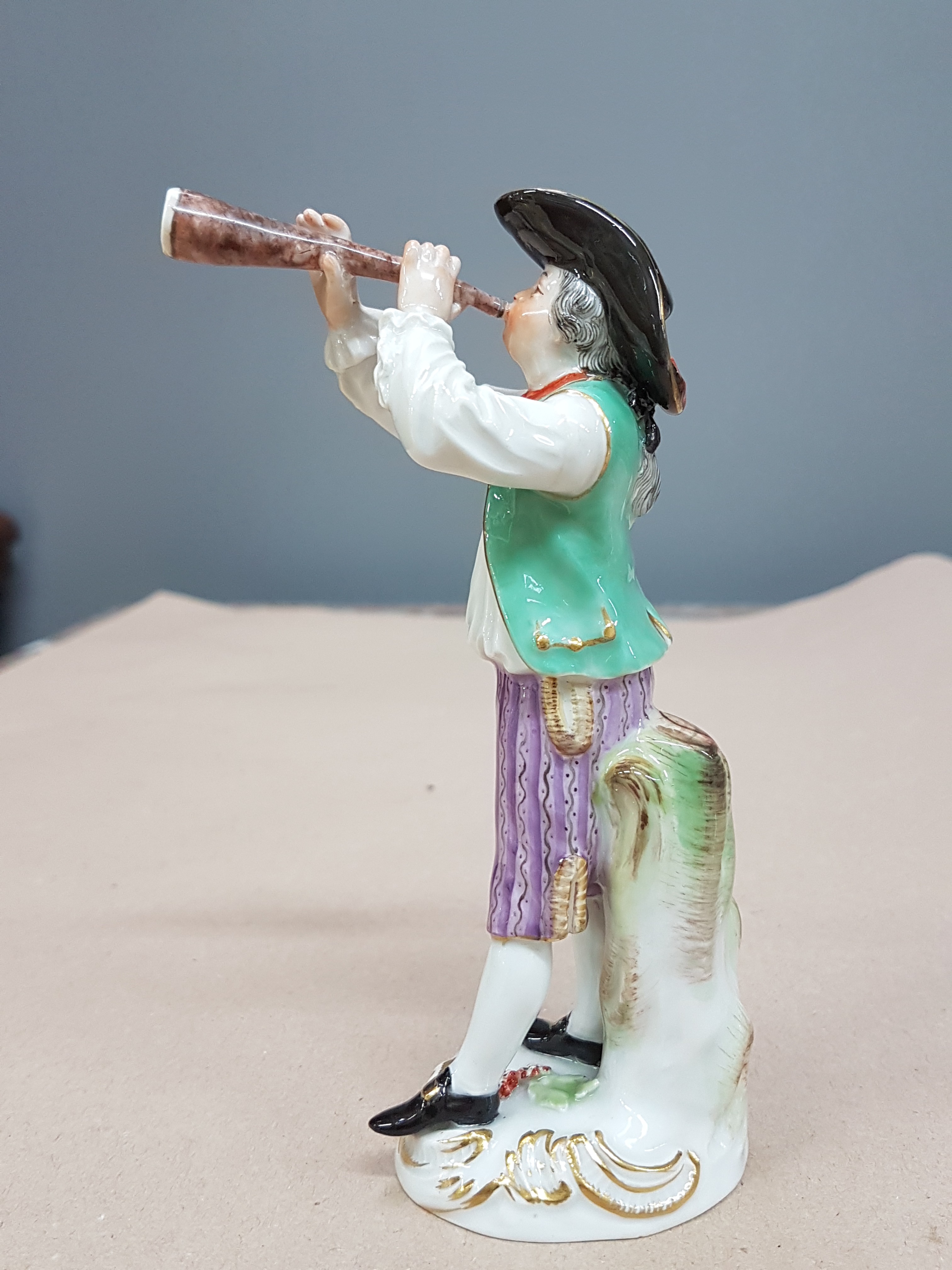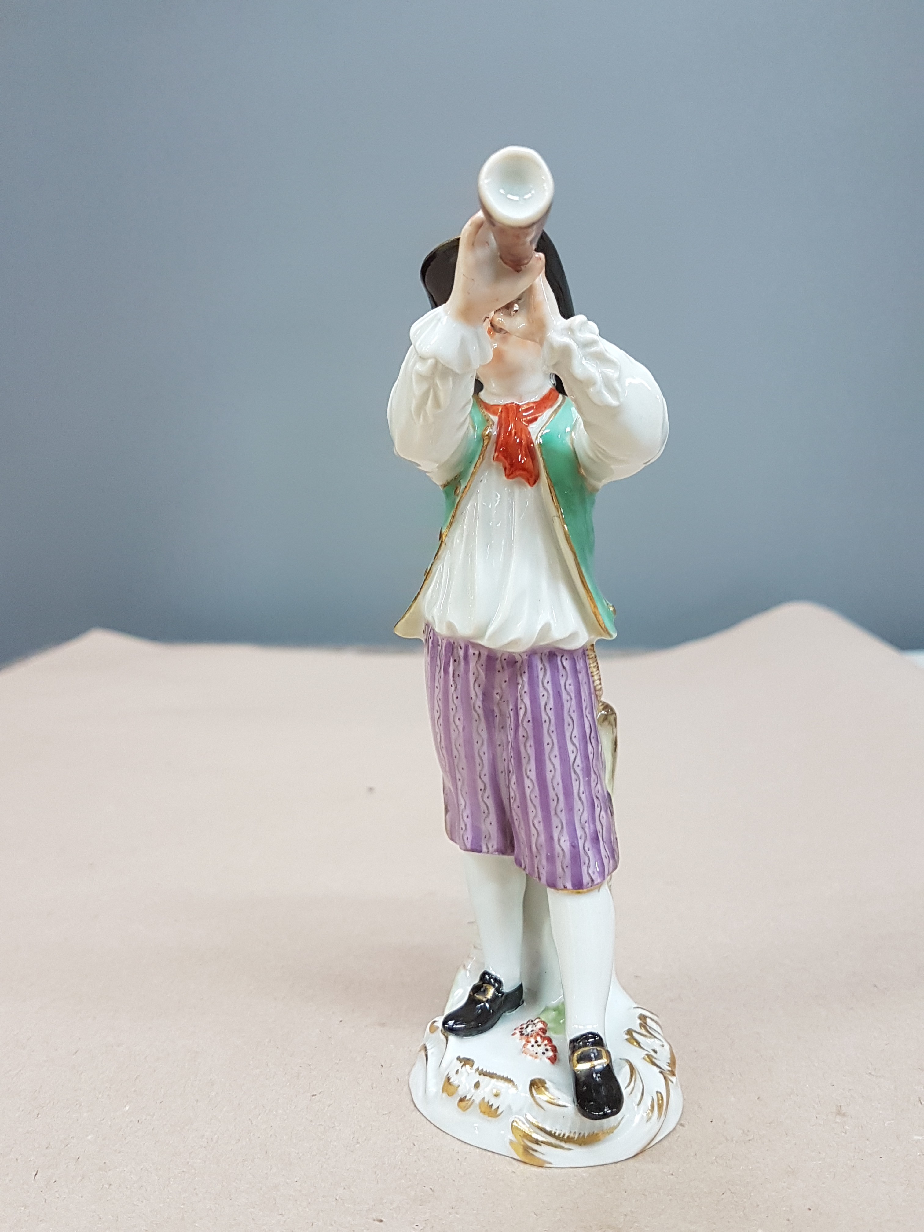 Cris de Paris, Ausrufer mit Horn, bunt bemalt, Goldstaffage, H. ca. 14 cm
