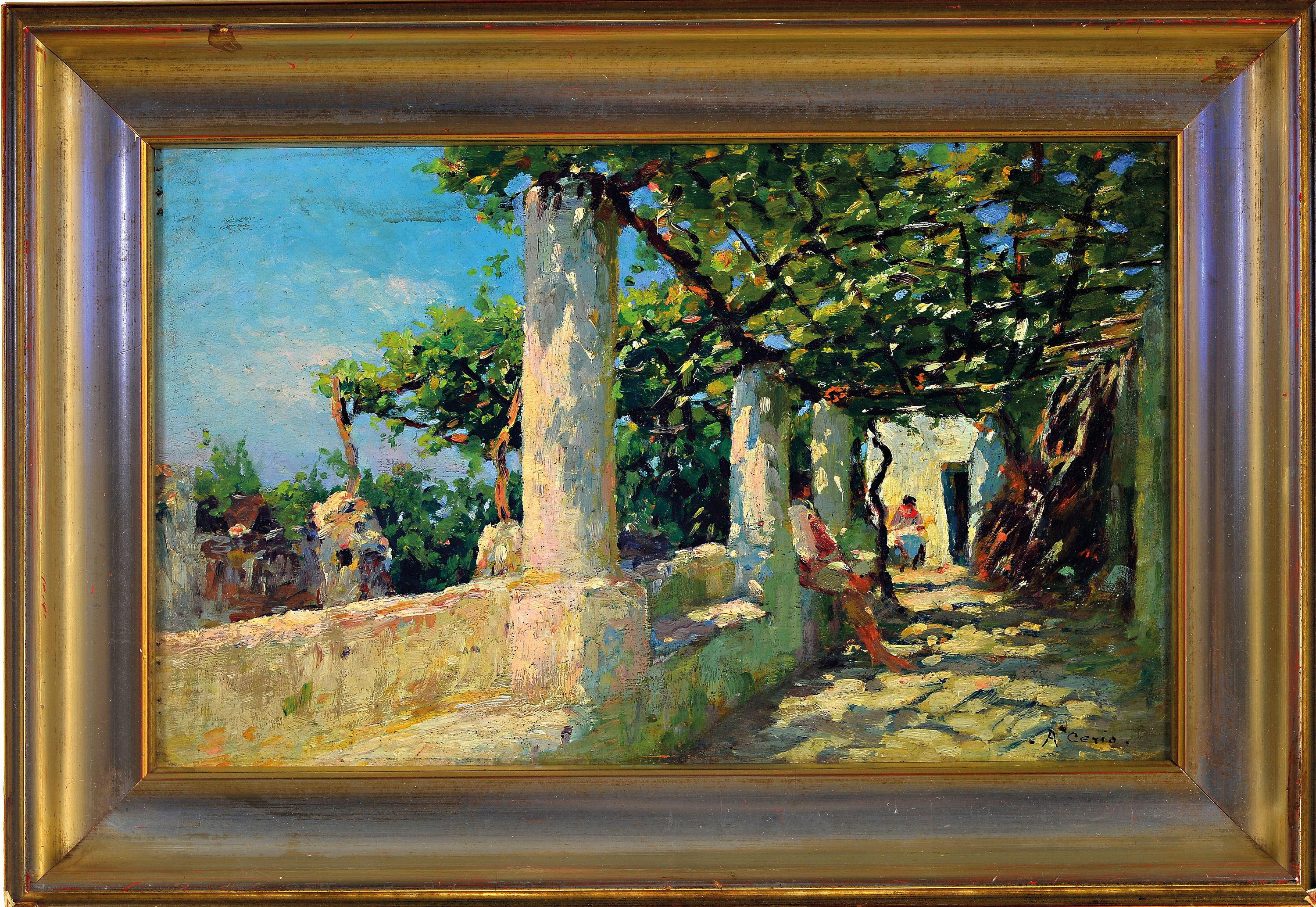 Arturo Cerio, 1868-1931, Italy, people on a shaded terrace, oil/wood, signed lower