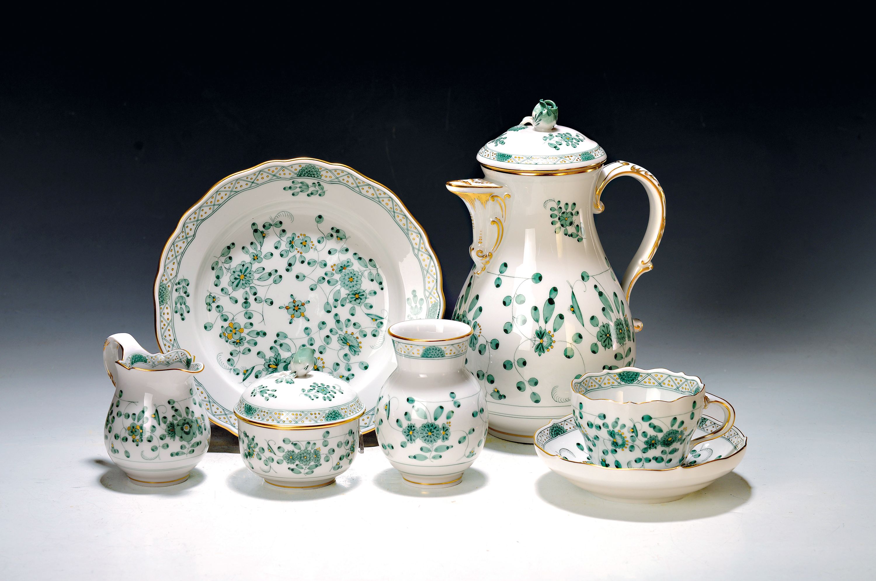 Kaffeeservice für 12 Personen, indisch grün, Meissen, nach 1945, 1.Wahl, Porzellan,