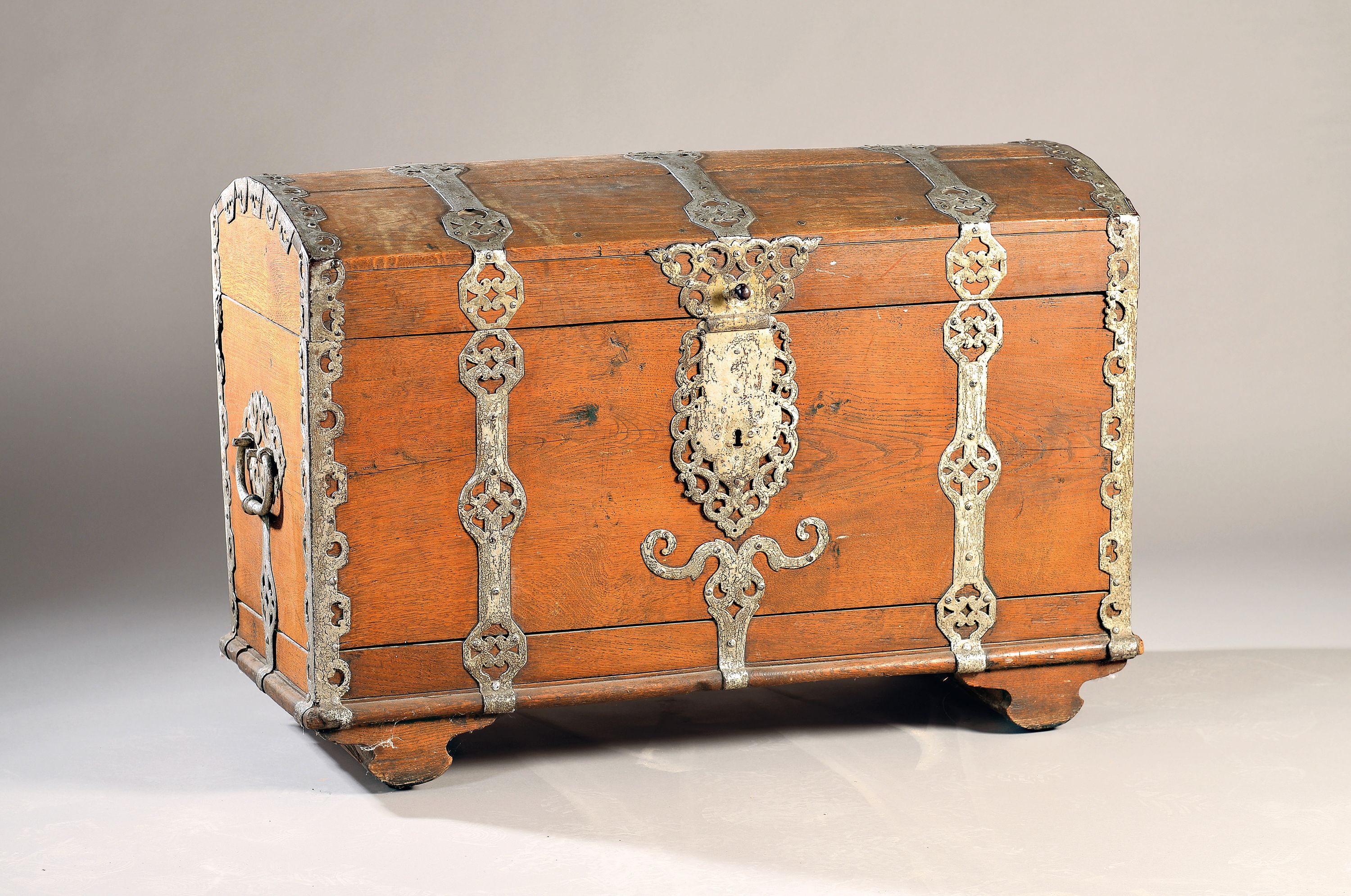 Buckeltruhe, deutsch, ausgehendes 18.Jh., Eiche, Eisenbeschlag, 1 Schlüssel, EZ