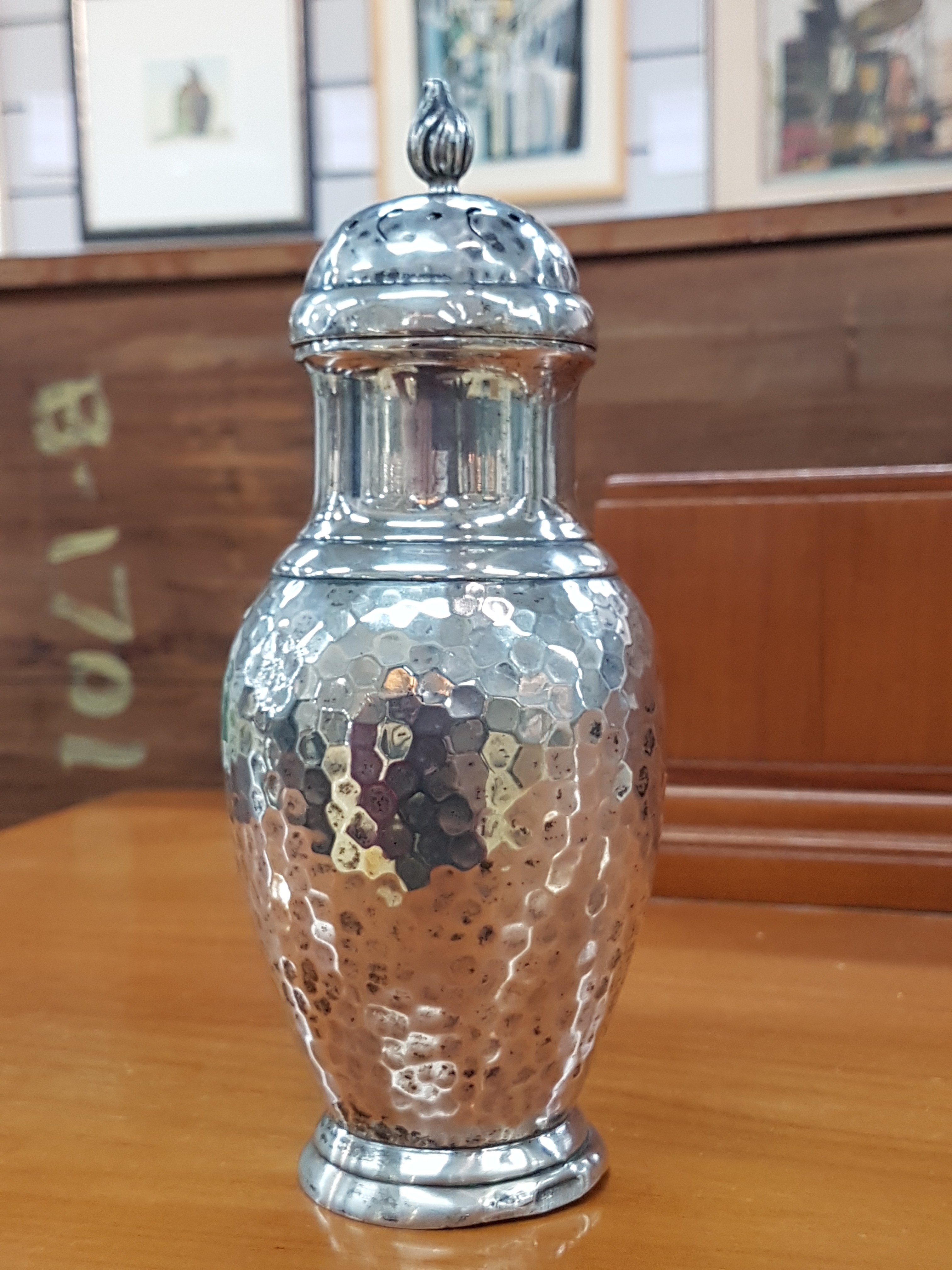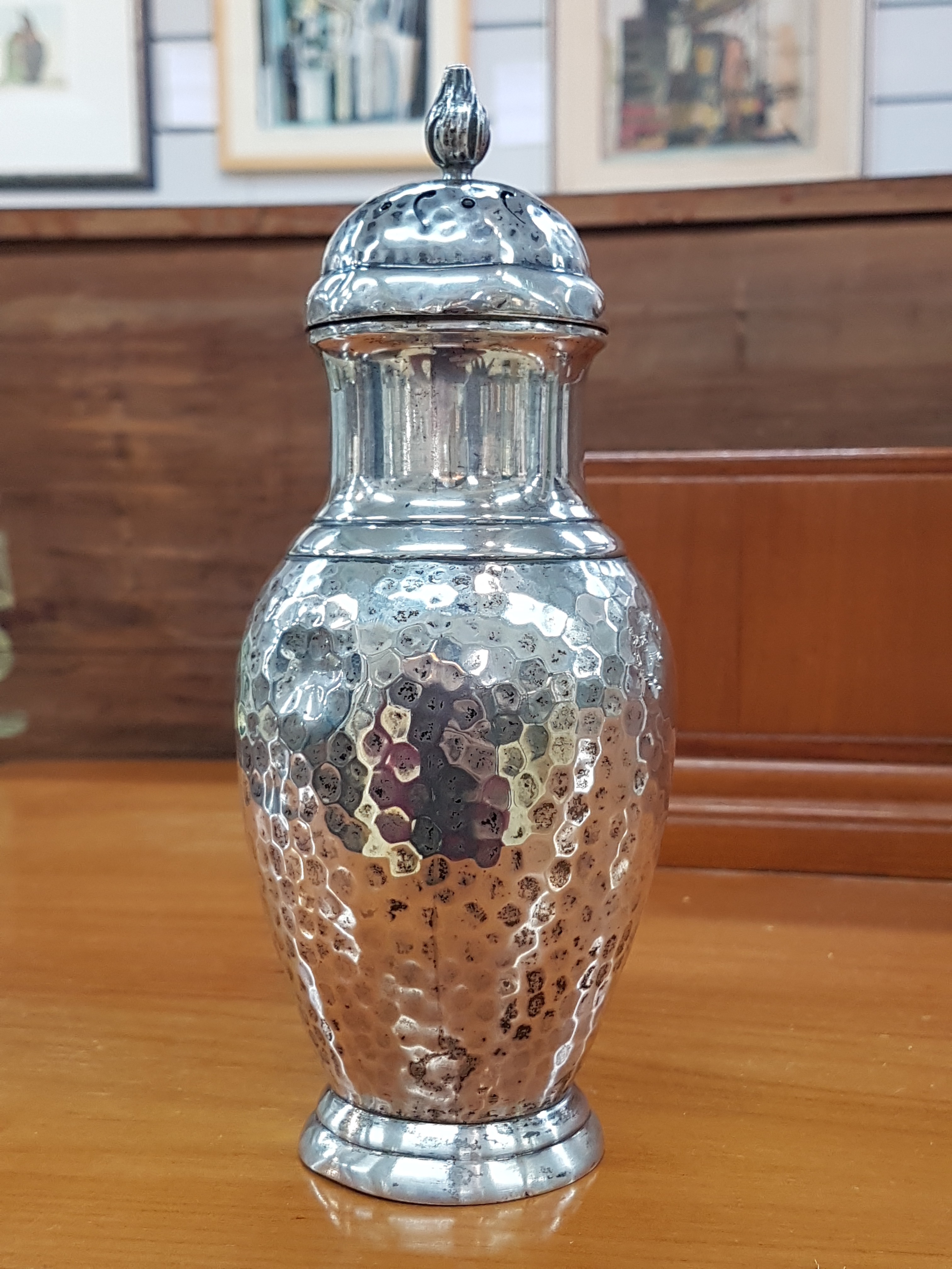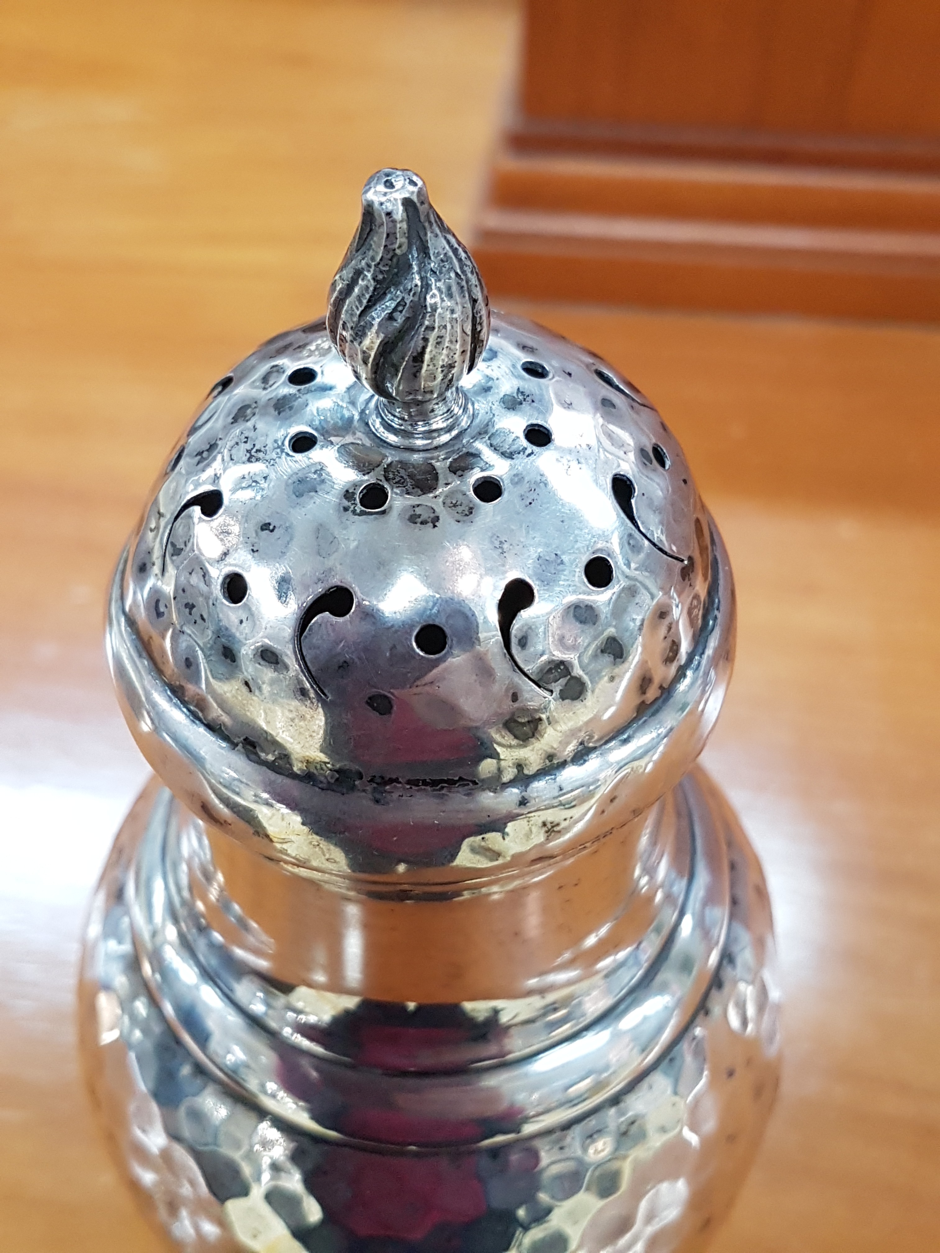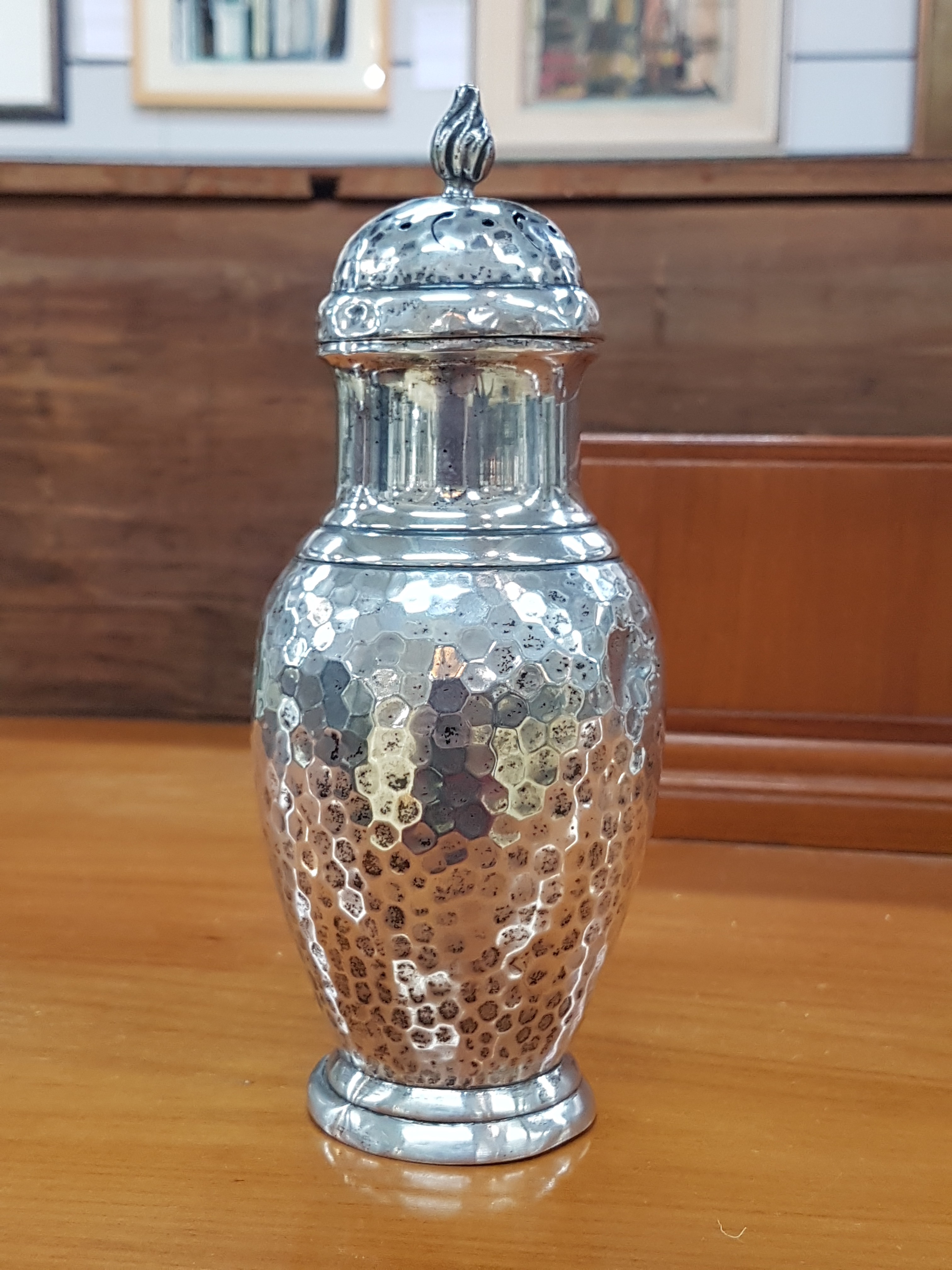 | Beschreibung | Salzstreuer aus Silber, Christian F. Heise, Kopenhagen, 1917, 228g, Hammerschlagdekor, abnehmbarer Deckel, H. 20cm |