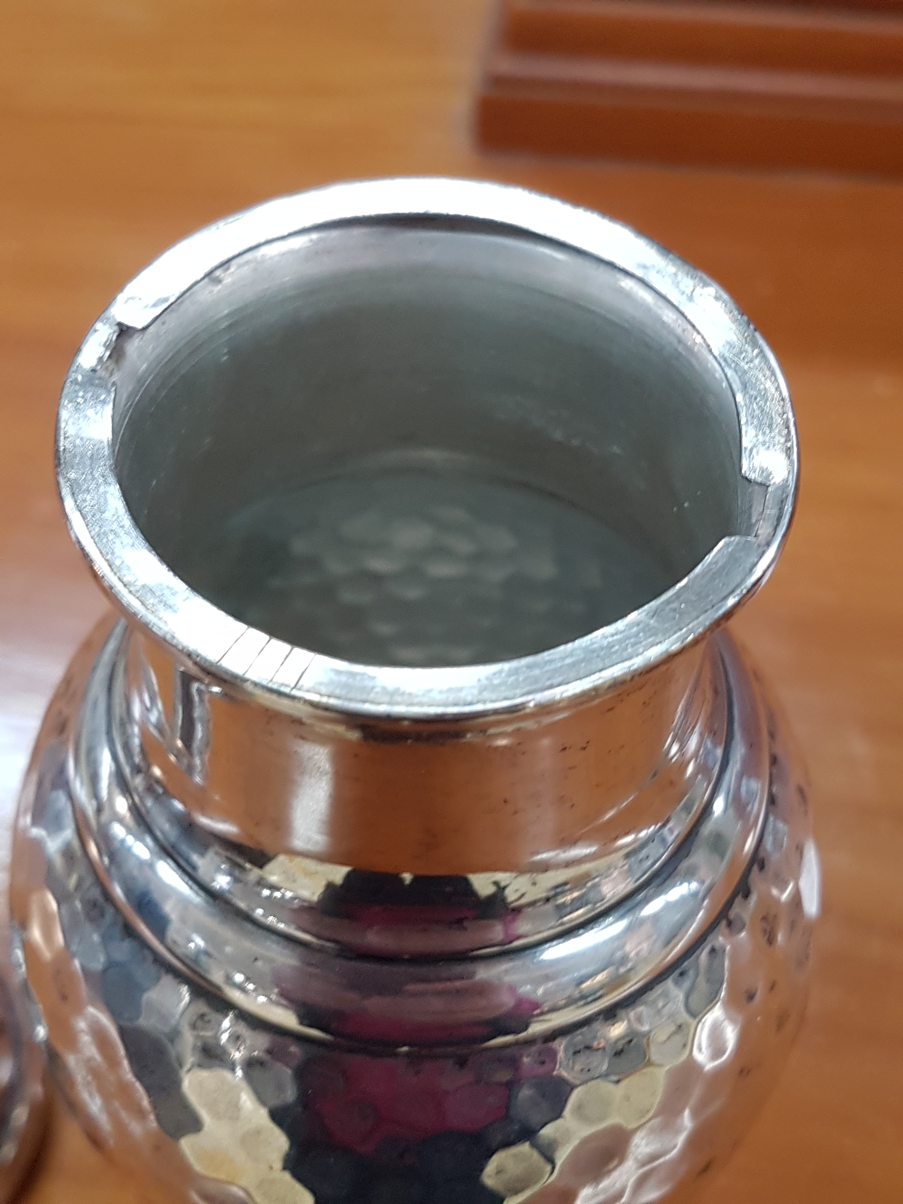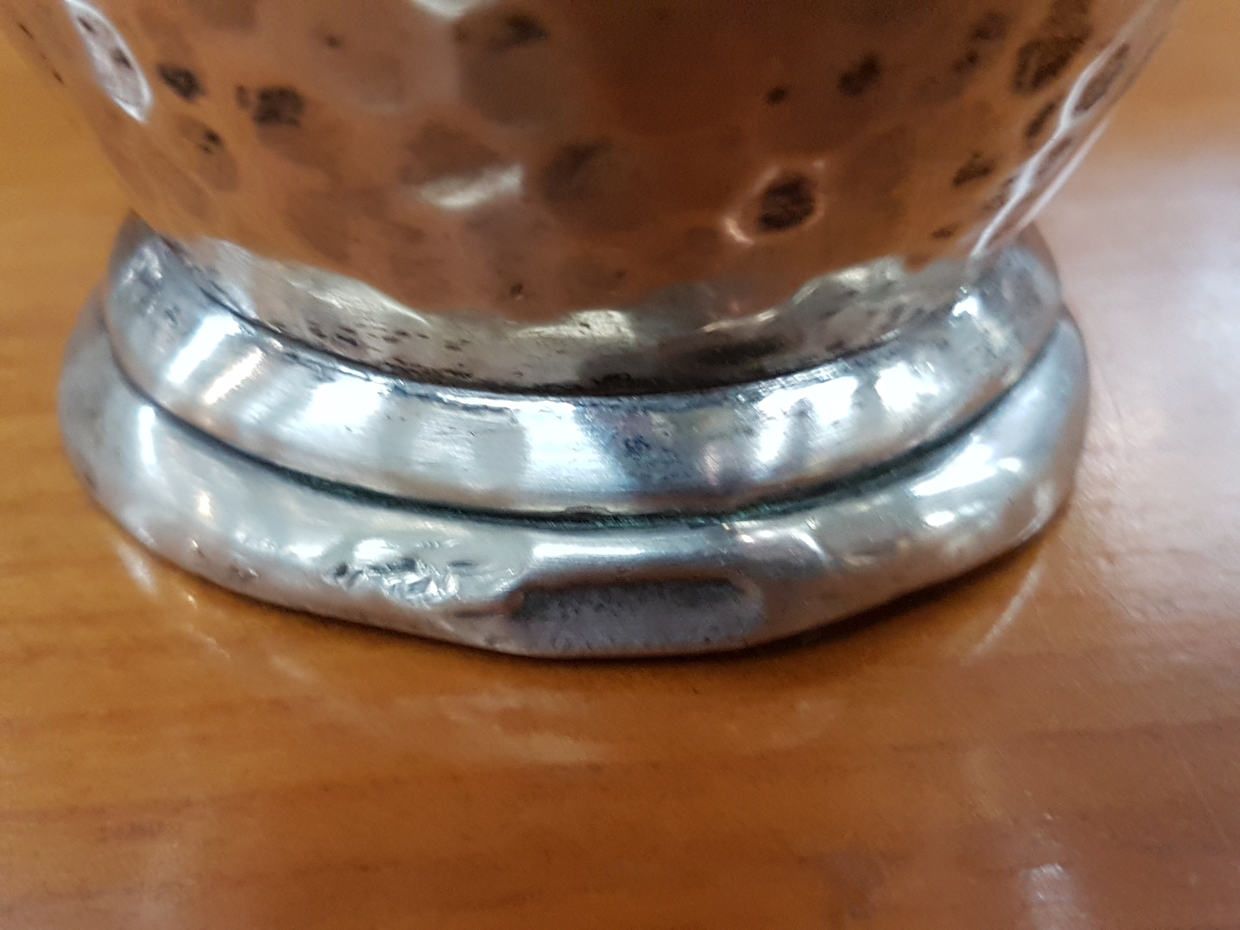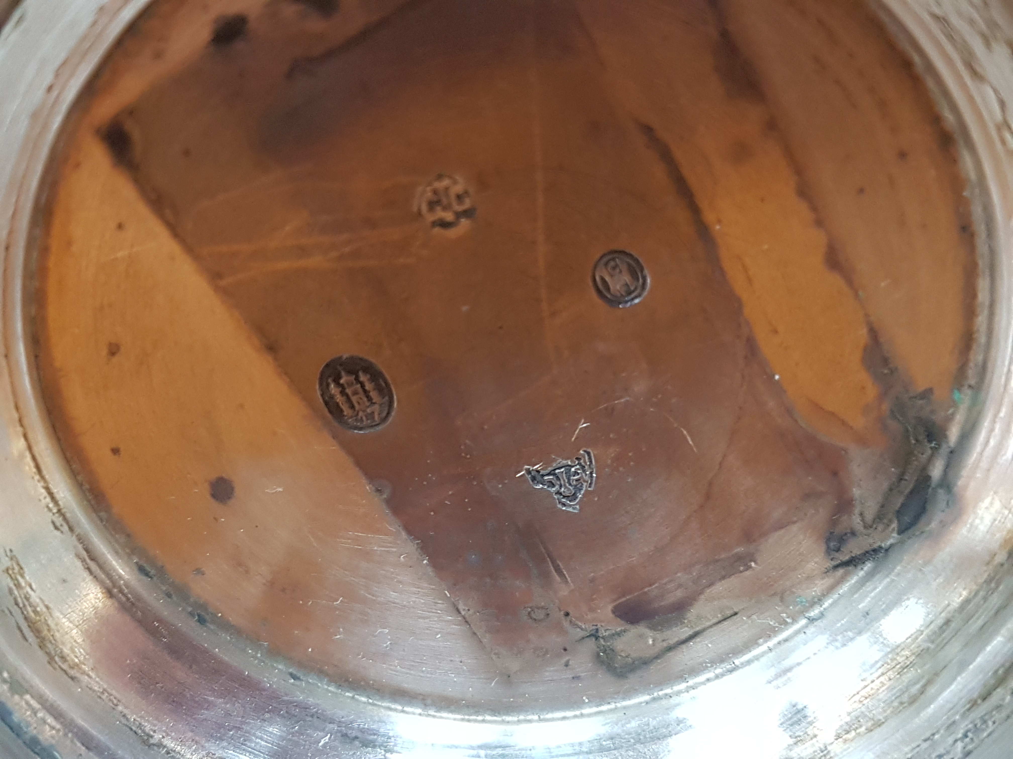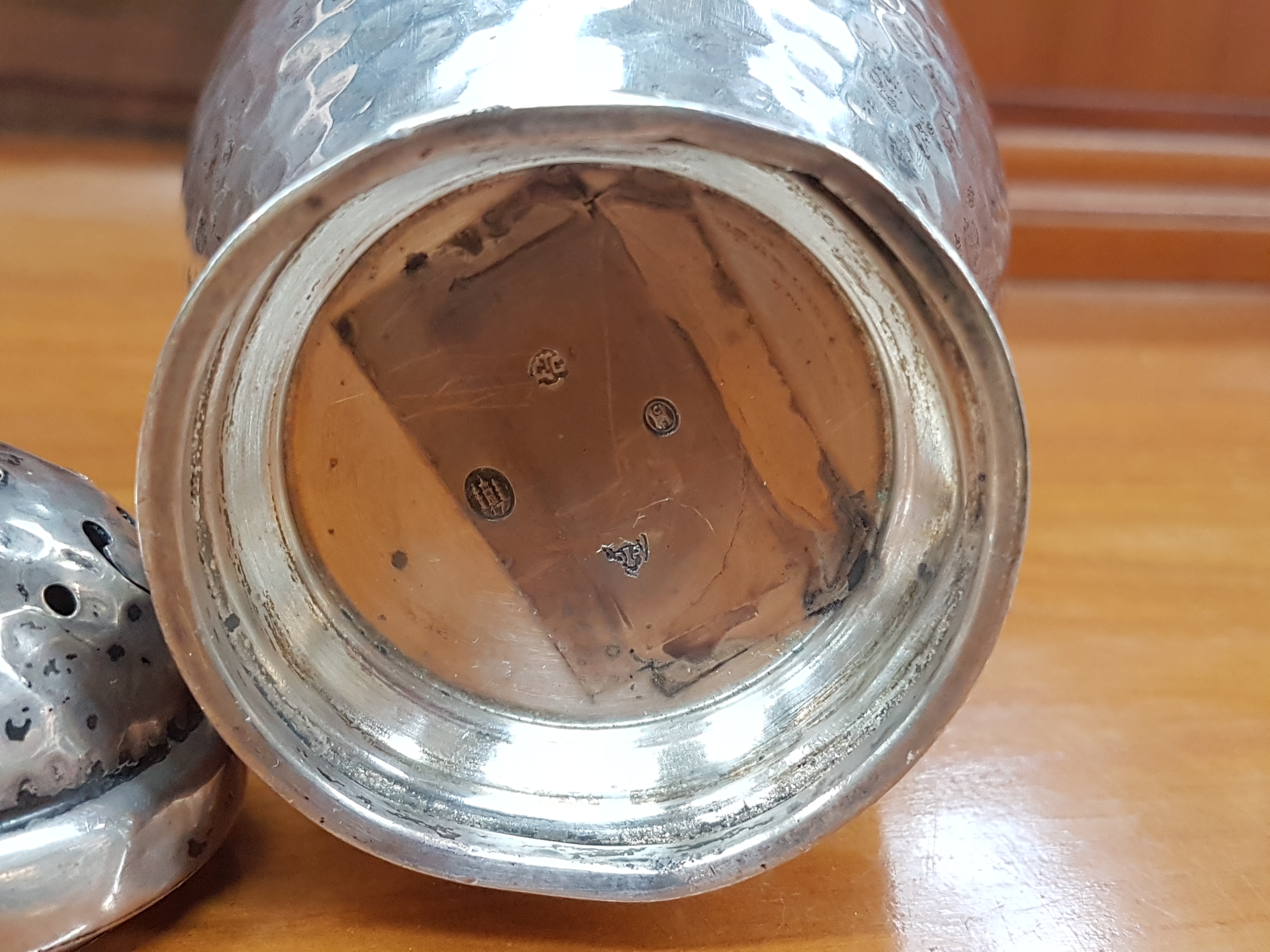 | Beschreibung | Salzstreuer aus Silber, Christian F. Heise, Kopenhagen, 1917, 228g, Hammerschlagdekor, abnehmbarer Deckel, H. 20cm |