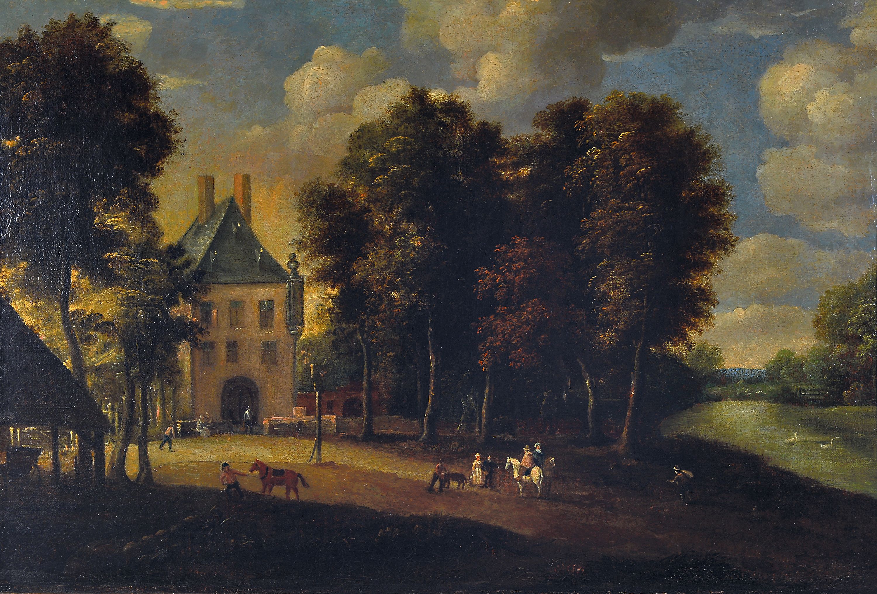 einem herrschaftlichen Haus mit Baumbestand, Öl/Lwd, rest., doubl., unsign., ca.