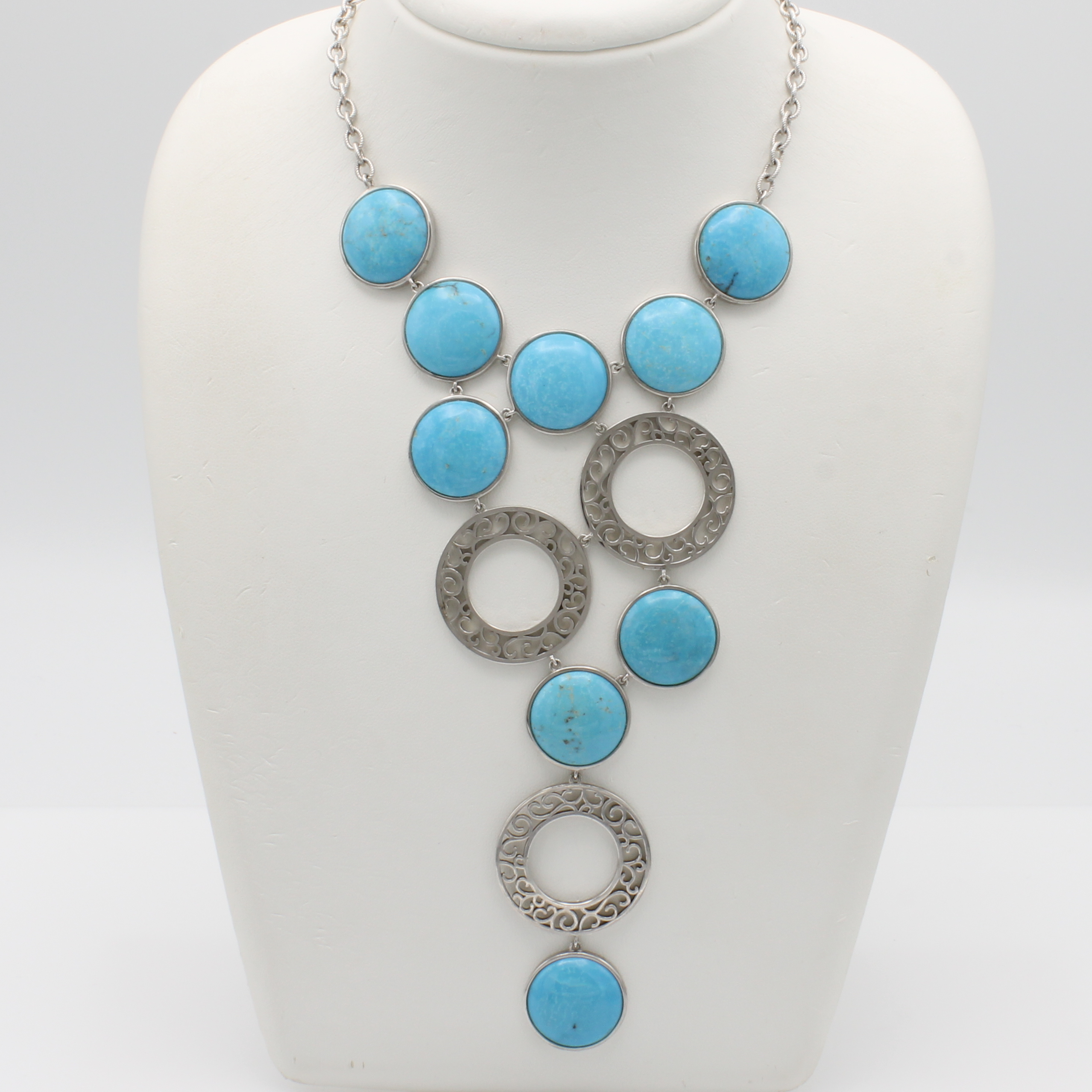 Langes Collier mit Türkisen, 925er Silber, geriefte Gliederkette, runde Türkisscheiben,