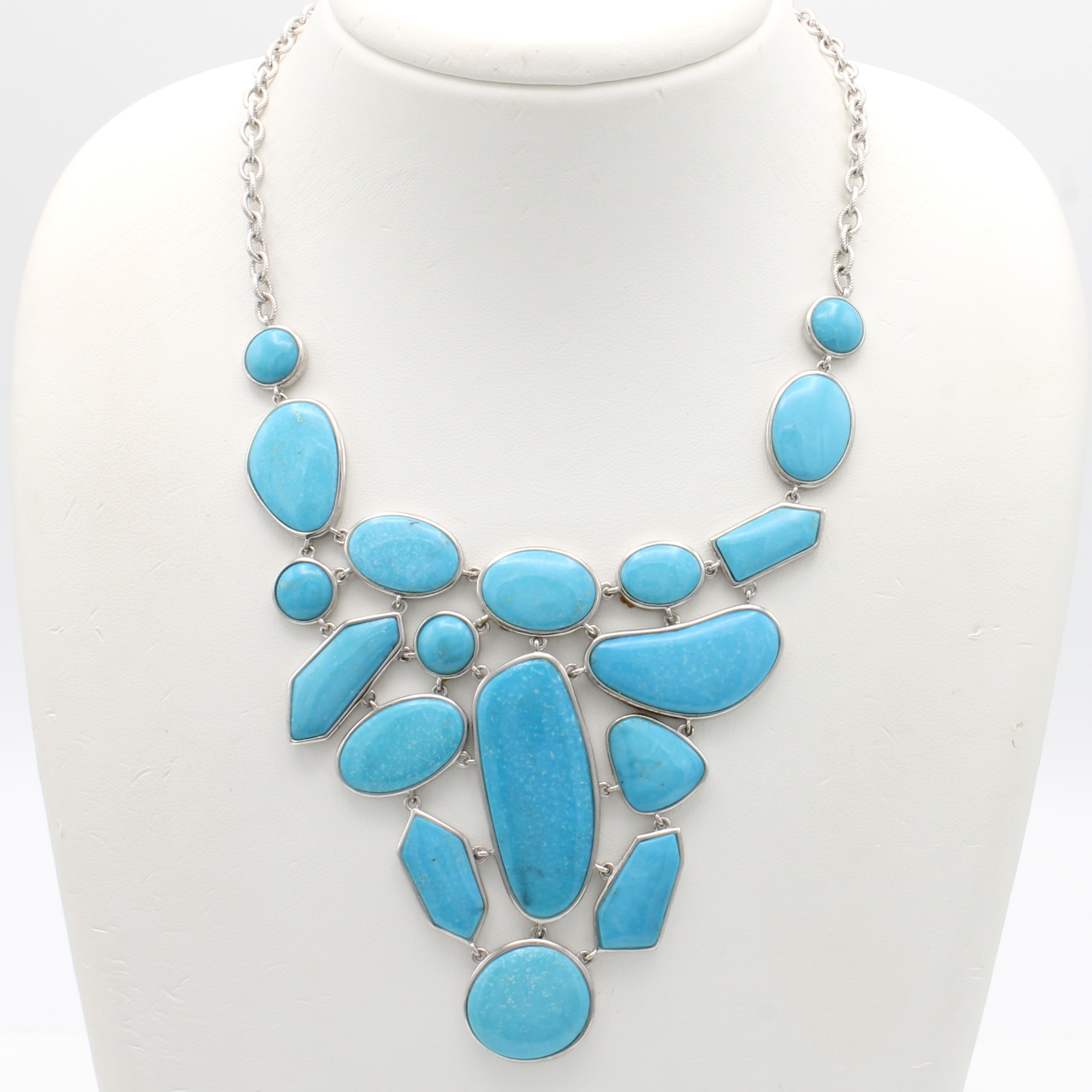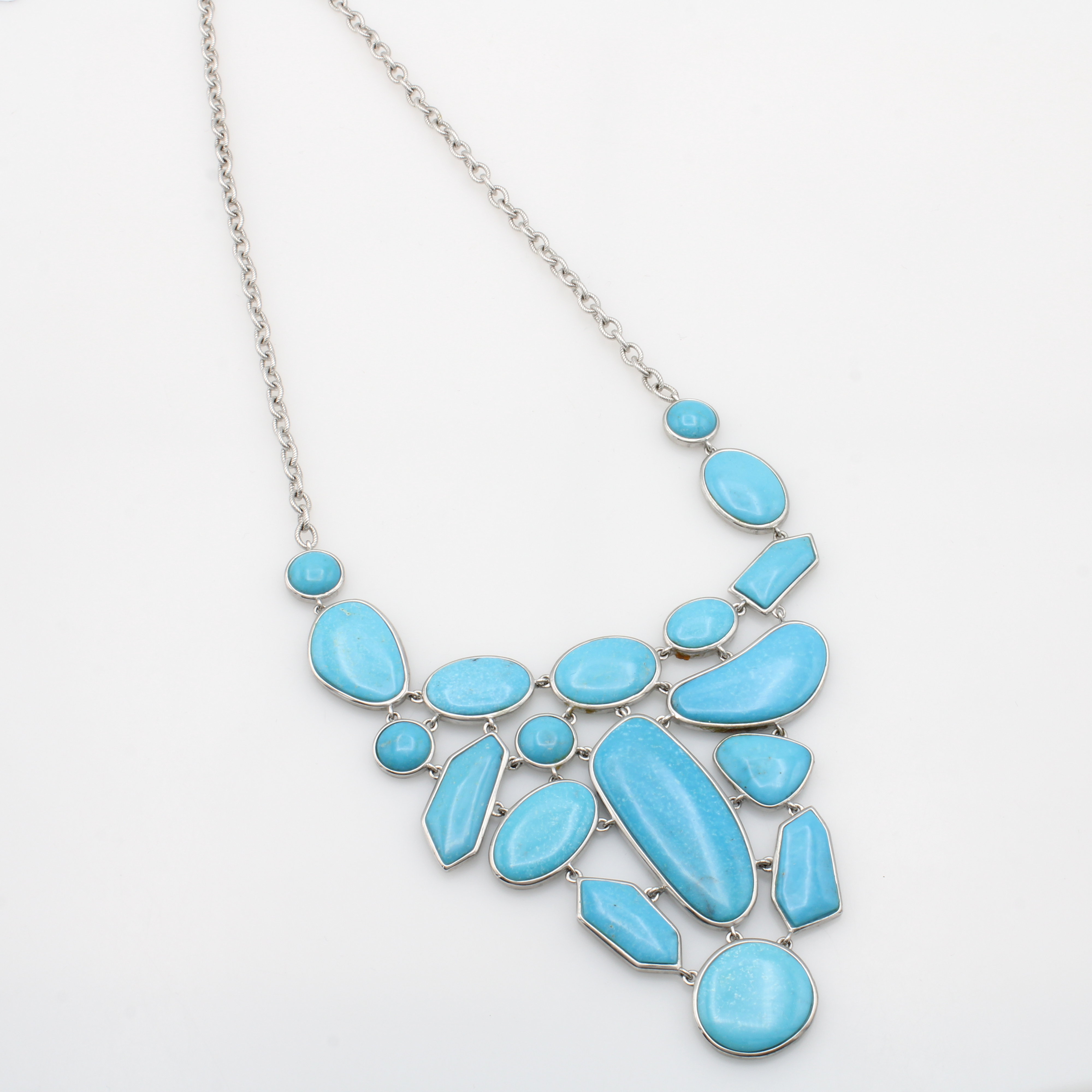 Collier mit Türkisen, 925er Silber, geriefte Gliederkette, Türkisscheiben in versch. Formen, in L. ca. 45, 48 u. 50 cm Schätzpreis: 1400, - EUR