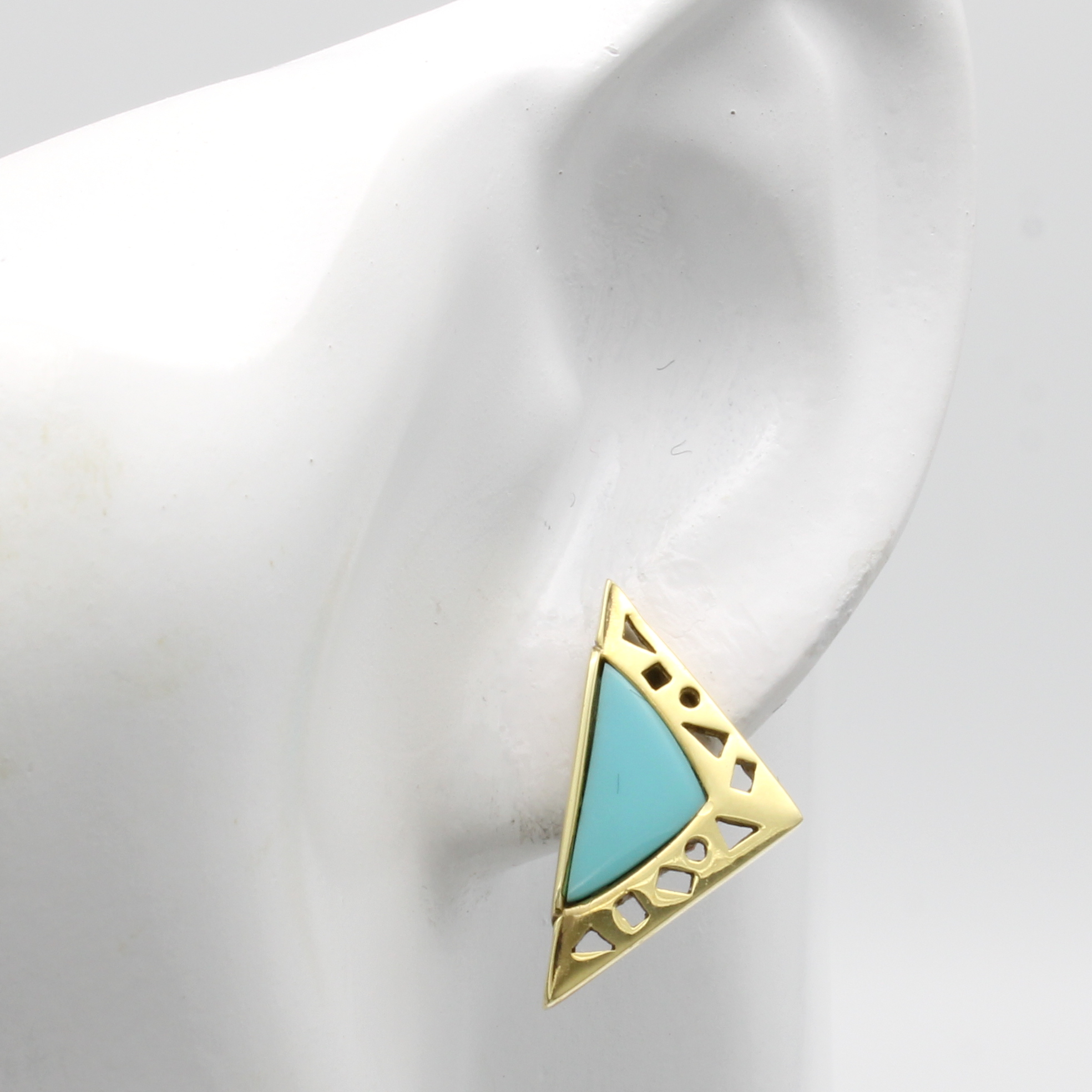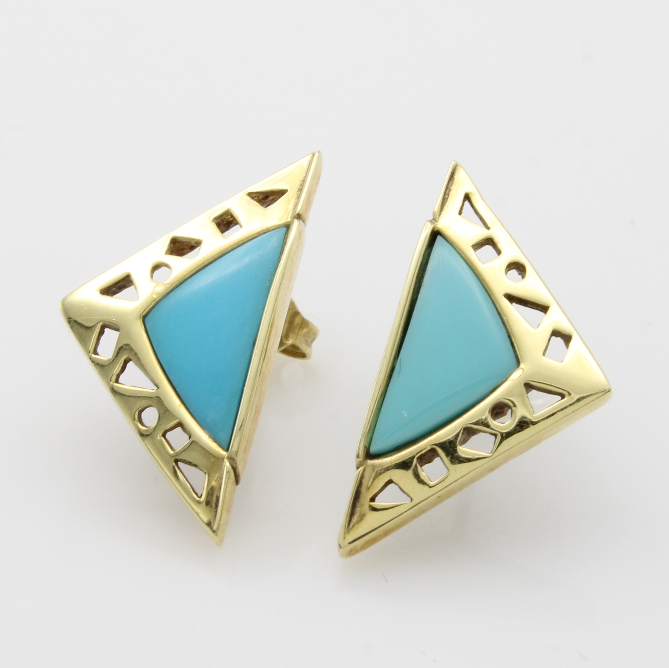 Paar Ohrstecker mit Türkisen, GG 585/000, dreieckige, durchbrochene Form Schätzpreis: 580, - EUR