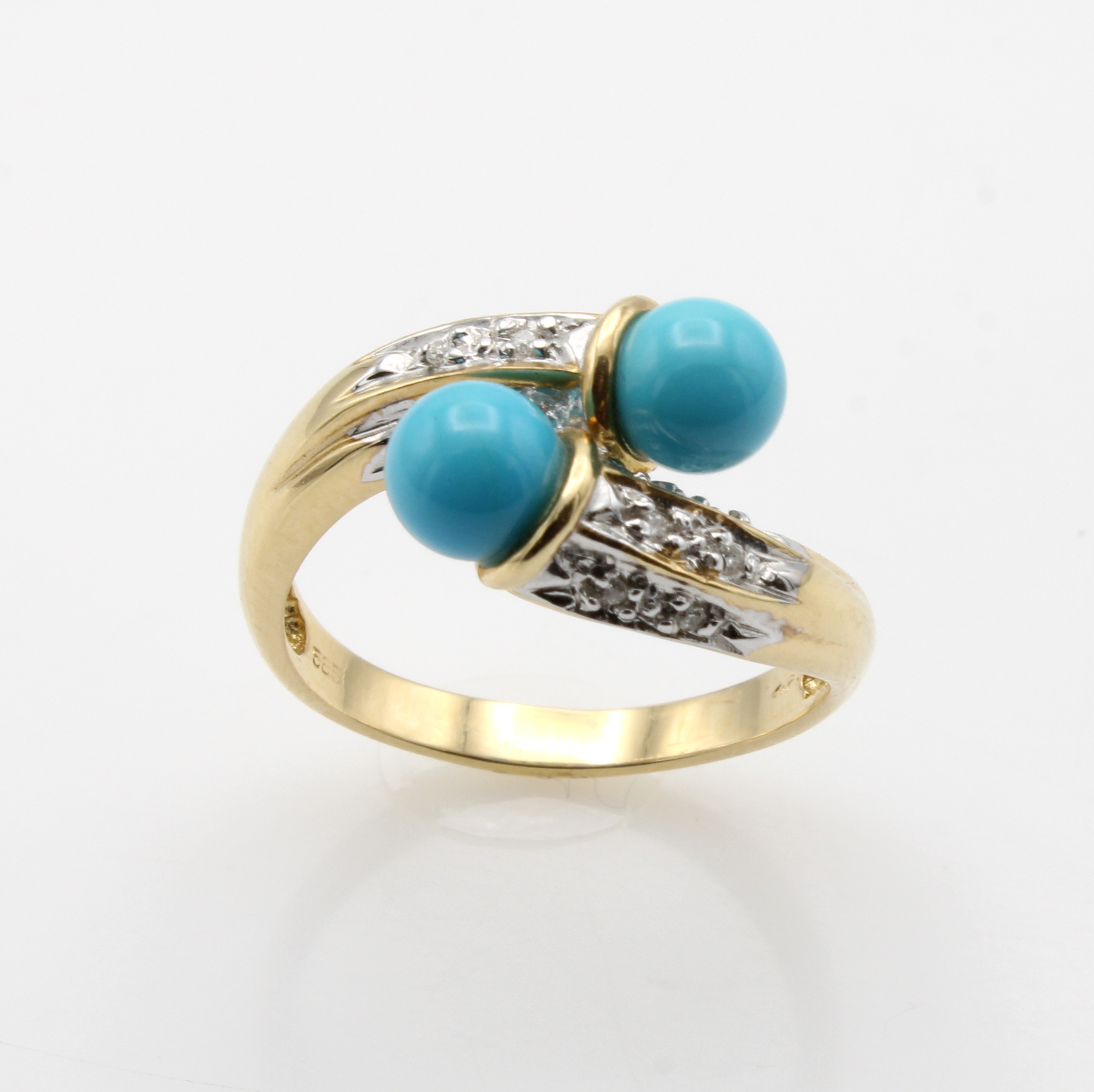 Ring mit Türkisen und Brillanten, GG 585/000, versetzt gearb., 2 Türkiskugeln ca. 5.5 mm, Brill. zus. ca. 0.48 ct Weiß/si, RW ca. 56 Schätzpreis: 680, - EUR