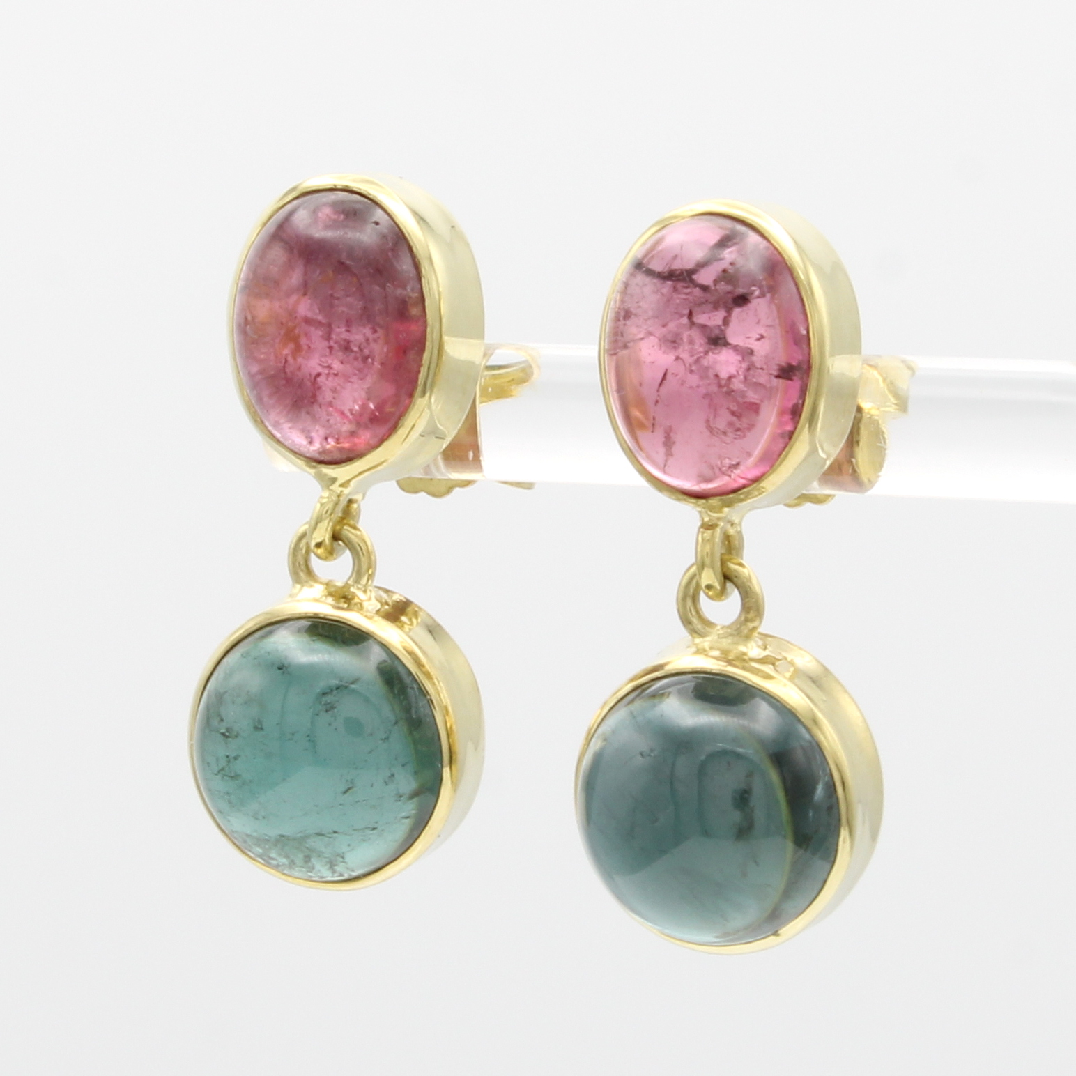 Paar Ohrstecker mit Turmalinen, GG 585/000, 2 ovale, rosa u. 2 runde, grüne Turmalin- cabochons zus. ca. 14.3 ct, Abhängungen bewegl. Schätzpreis: 2500, - EUR