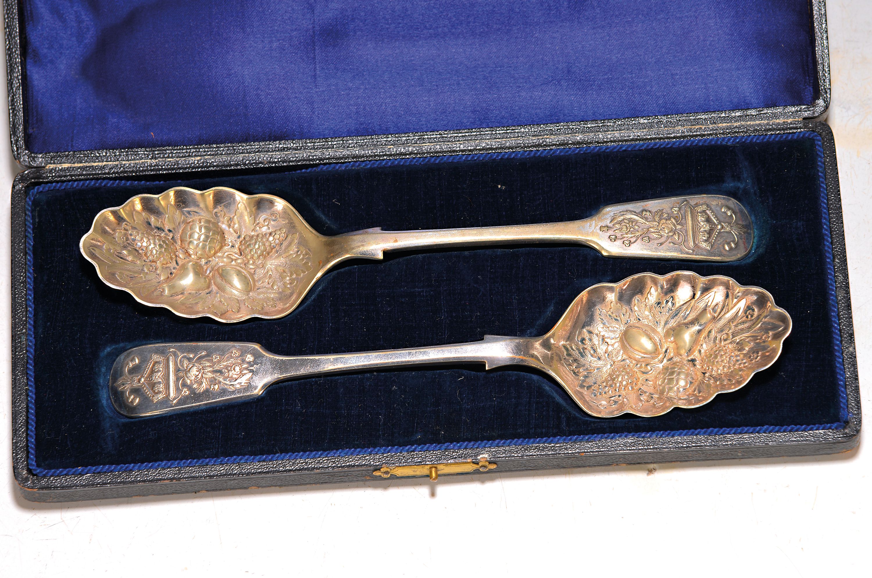 Paar Vorlegelöffel, Schottland, 19.Jh., versilbert, Meistermarke JB & S, Reliefdekor