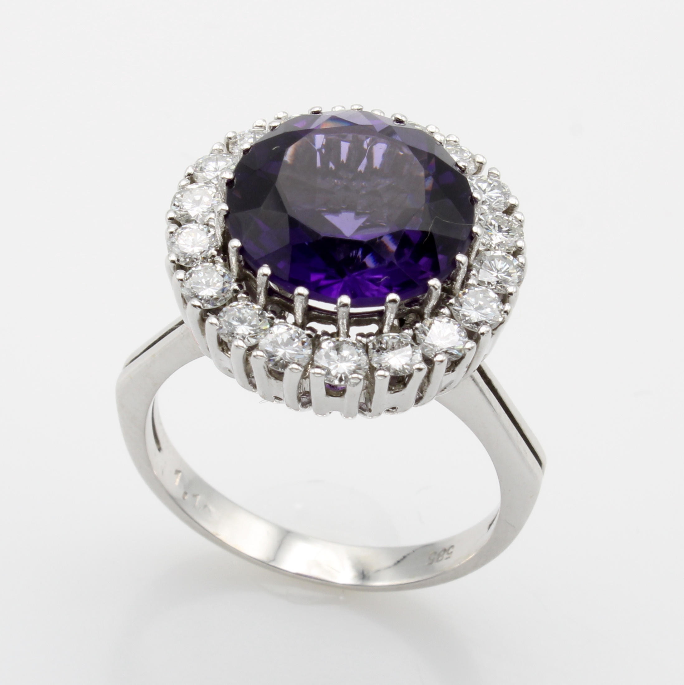 Ring mit Amethyst und Brillanten, WG 585/000, Amethyst ca. 6 ct umgeben v. Brill. zus. ca. 1.1 ct feines Weiß/vs-si, RW ca. 59 Schätzpreis: 6580, - EUR