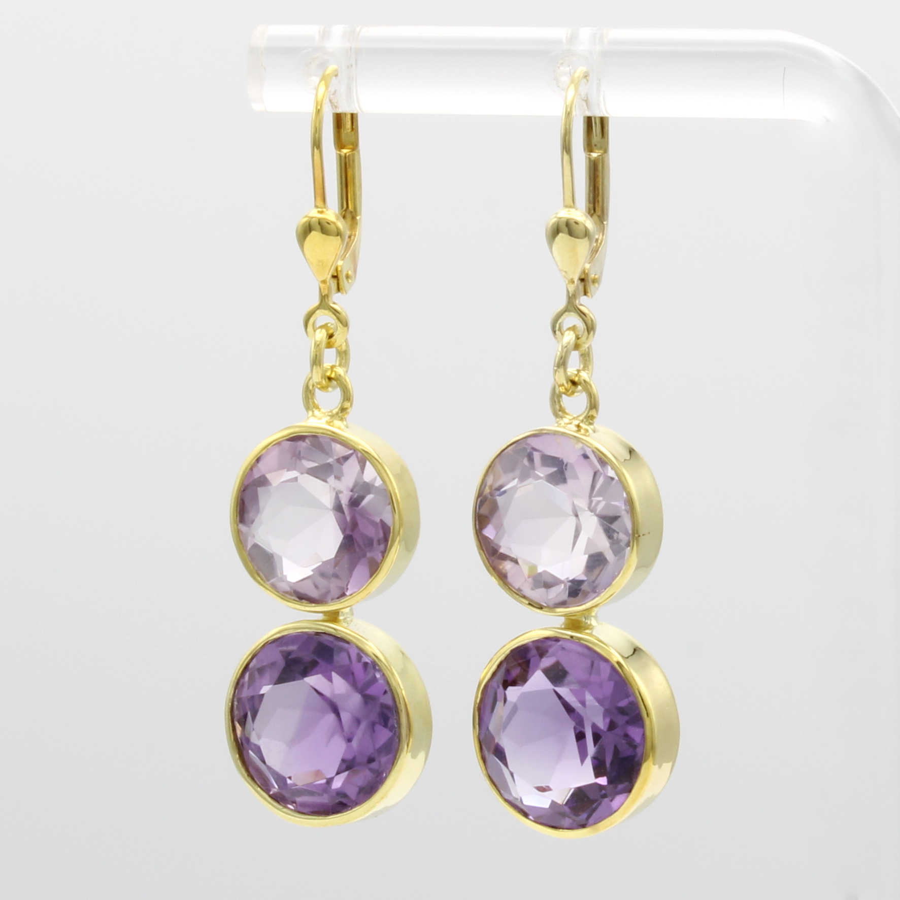 Paar Ohrgehänge mit Amethysten, GG 585/000, 4 runde Amethyste in versch. Farbtönen zus. ca. 16 ct, glatte Fassungen Schätzpreis: 2350, - EUR