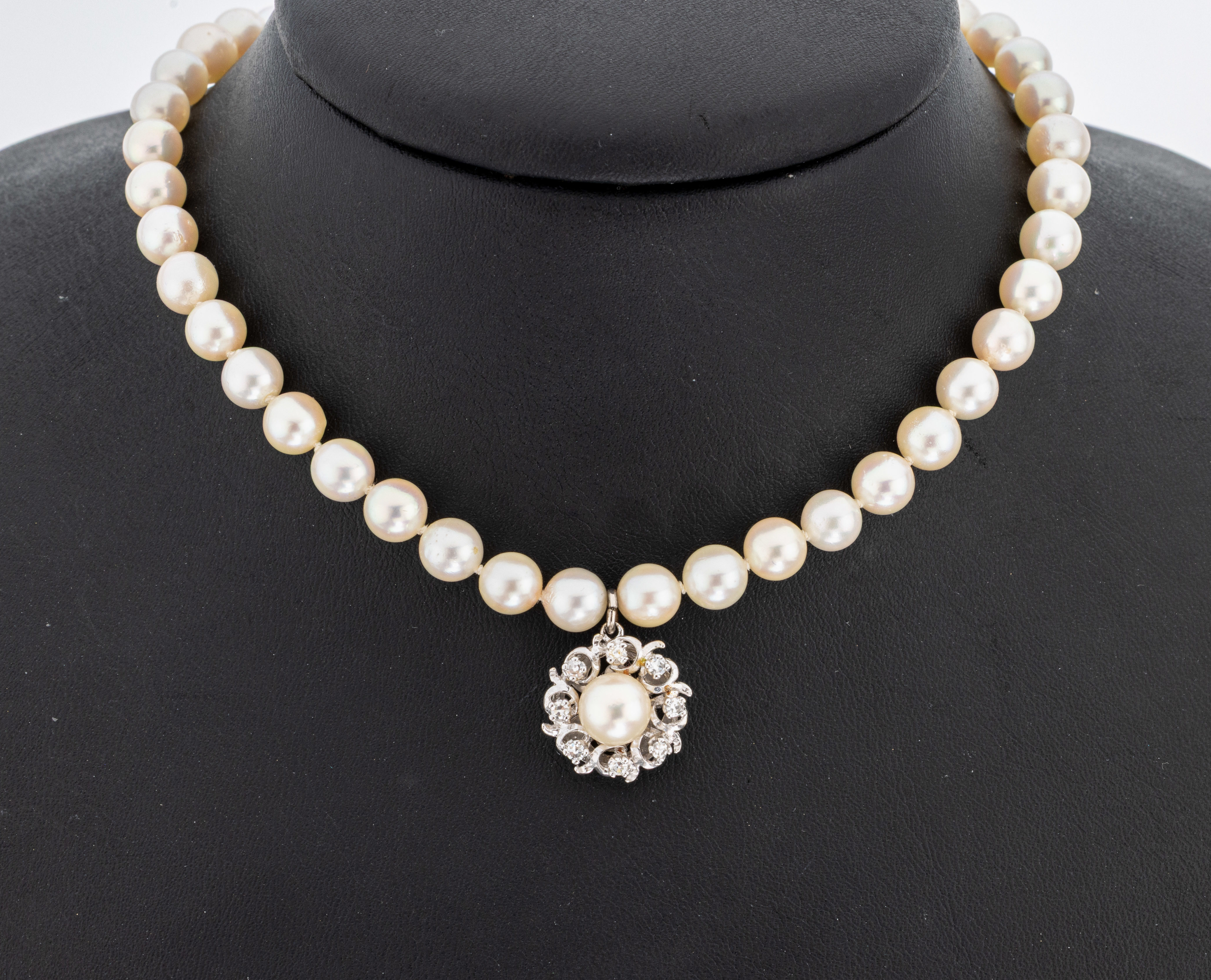 Perl-Collier mit 14 kt Gold Perl-Diamant -Mittelteil, WG 585/000, Zuchtperlen, D.
