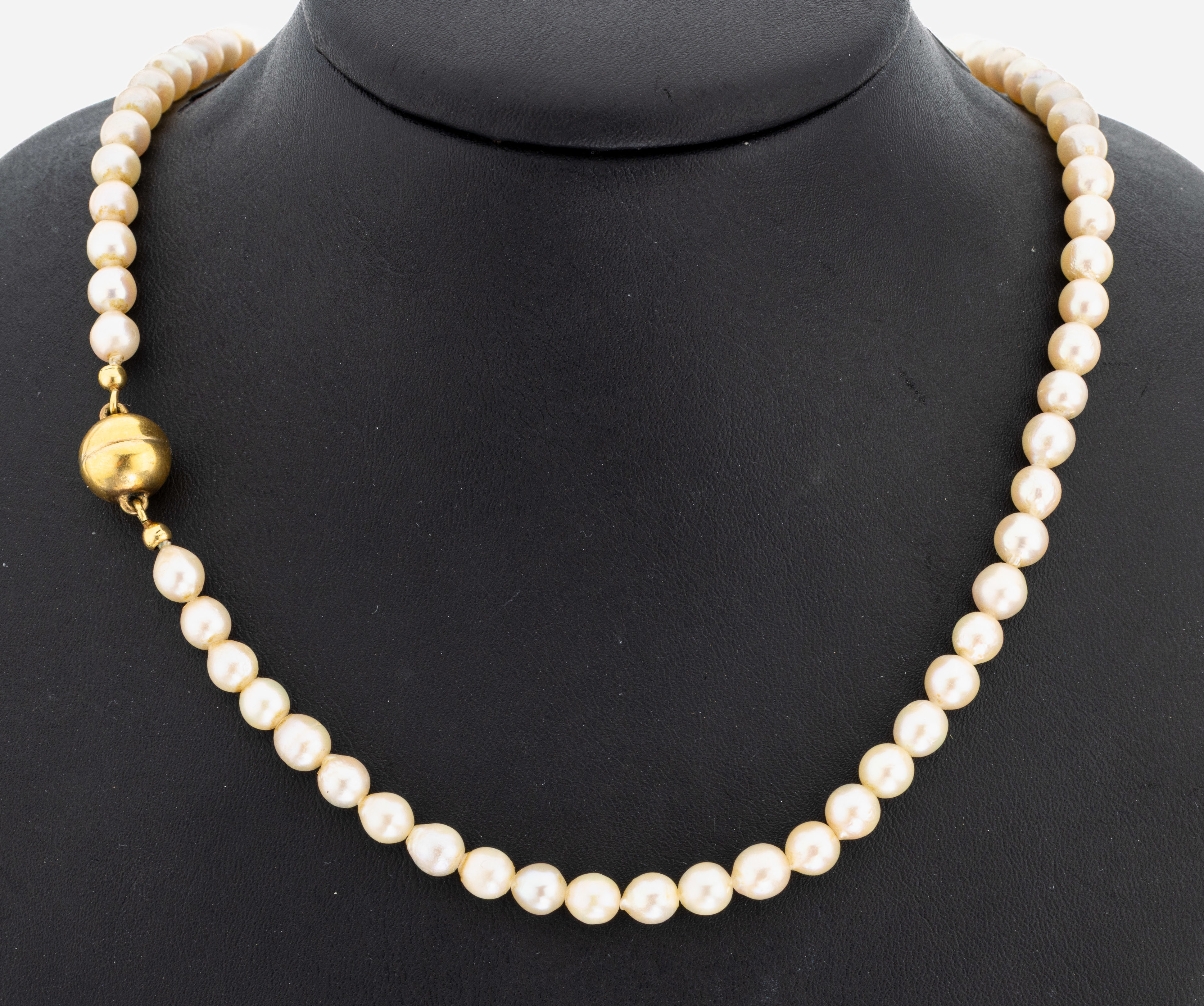 Perl-Collier, Zuchtperlen, D. ca. 6-7 mm, unrund, L. ca. 48 cm, Magnetschließe 925er