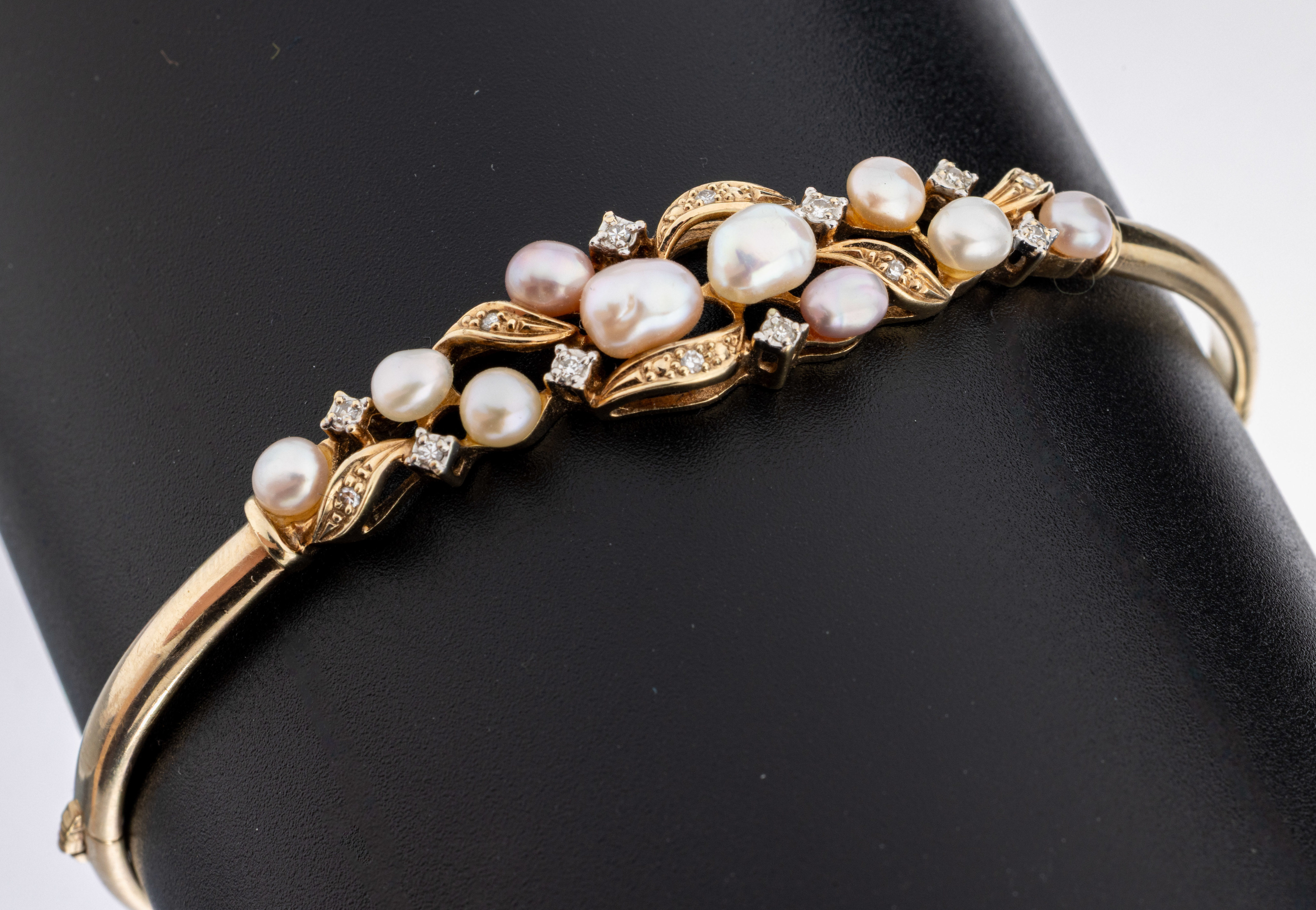 14 kt Gold Perl-Diamant-Armreif, GG 585/000, 10 unrunde Zuchtperlen in versch. Größen
