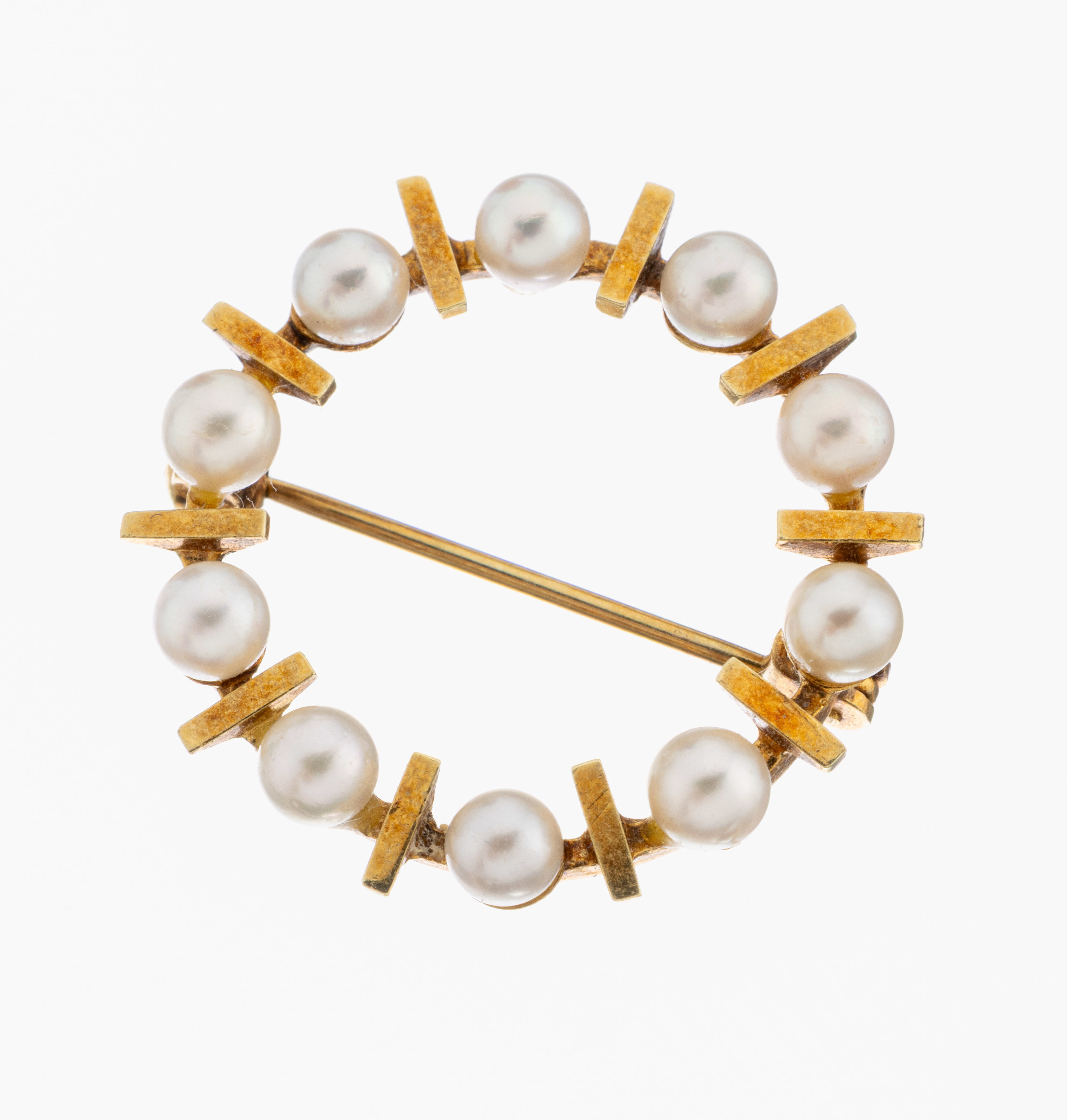 14 kt Gold Perl-Brosche, GG 585/000, Kreis,10 Zuchtperlen, D. ca. 3.6 mm, D. ca.