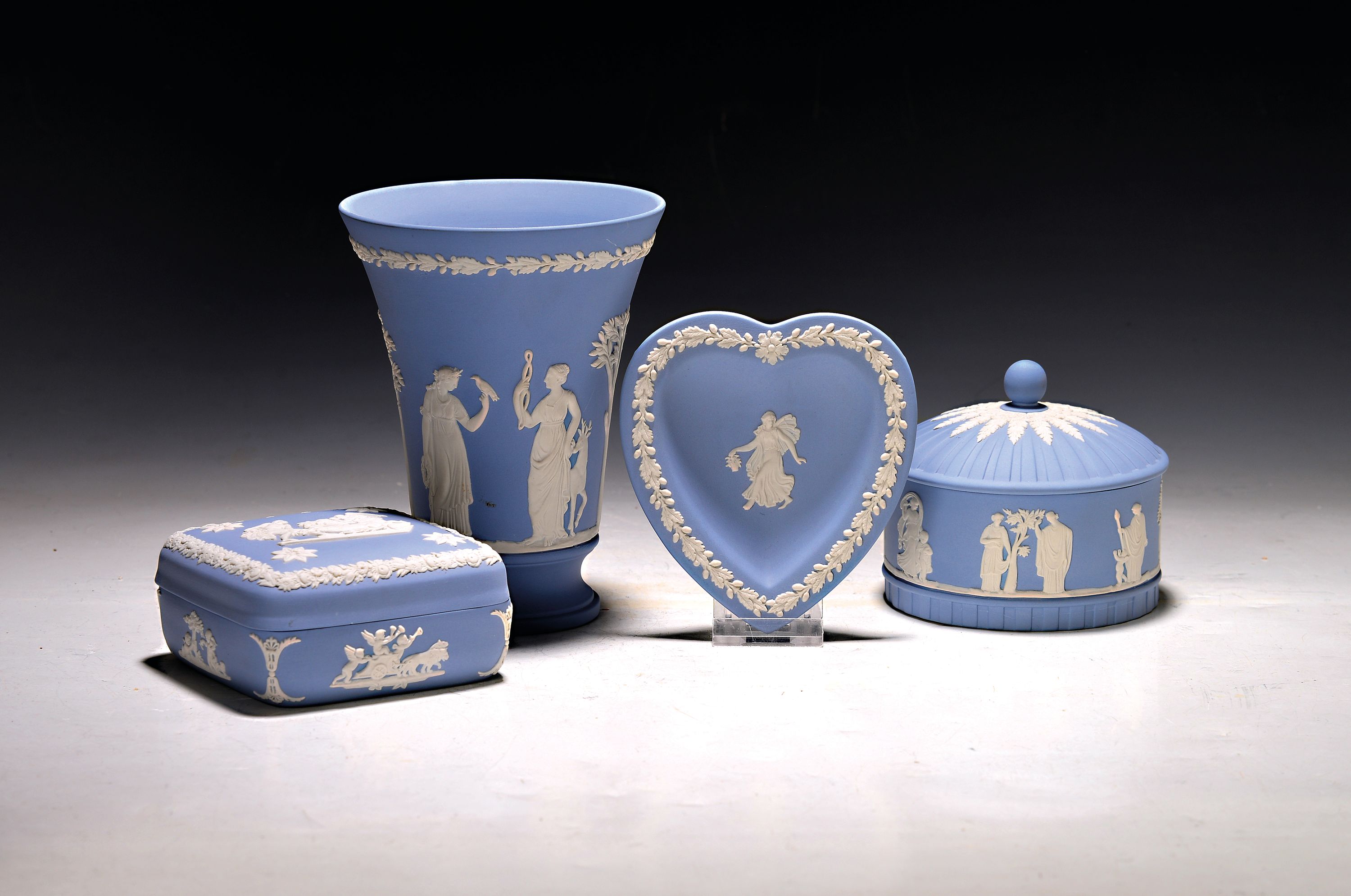 4 Teile Porzellan, Wedgwood England, 20. Jh., sog. Jasper Ware, blaues Biskuitporzellan