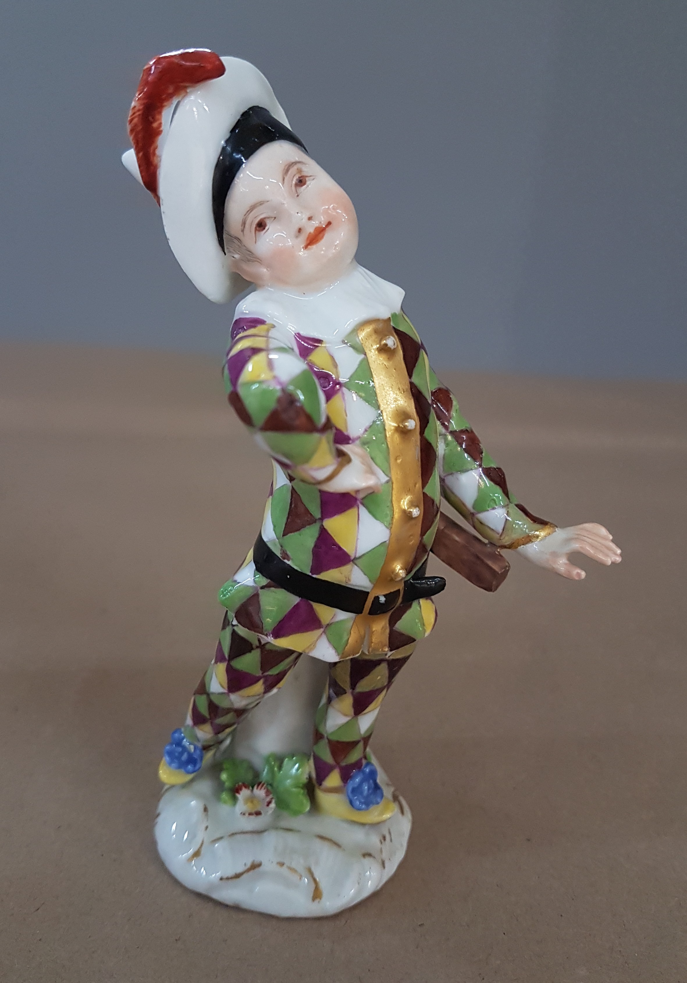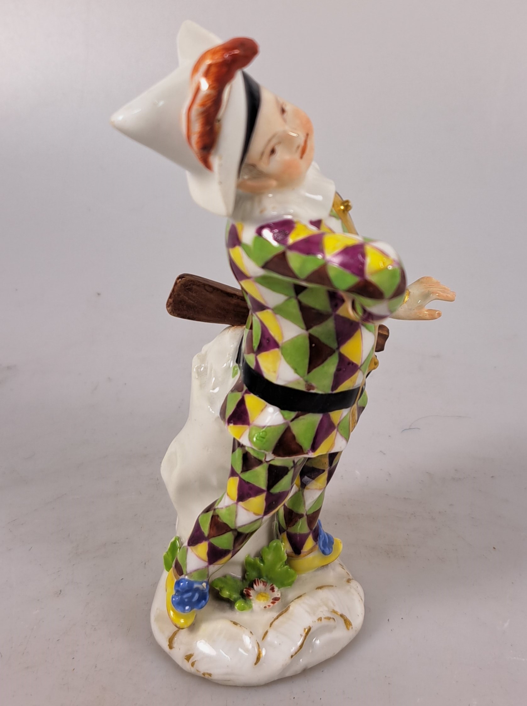 Porzellanfigur, Meissen, um 1750, kleiner Harlekin, Porzellan, polychrom bemalt, Goldstaffage, restauriert, Reste von Reste von Schwertermarke auf Fladensockel, H. ca. 12.5 cm