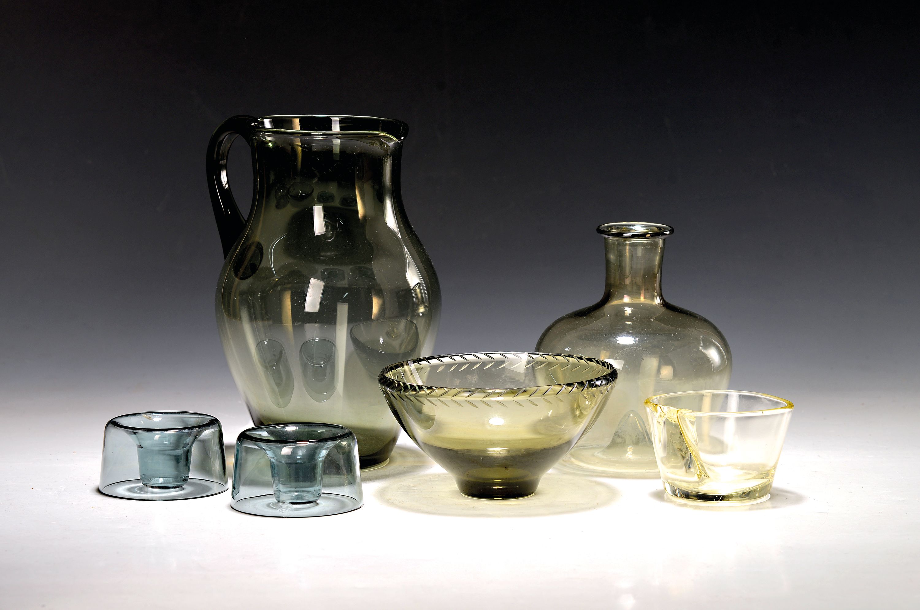 6 Glasobjekte, Entw. Wilhelm Wagenfeld (1900-1990) für WMF, 1960er-Jahre, rauchgrün