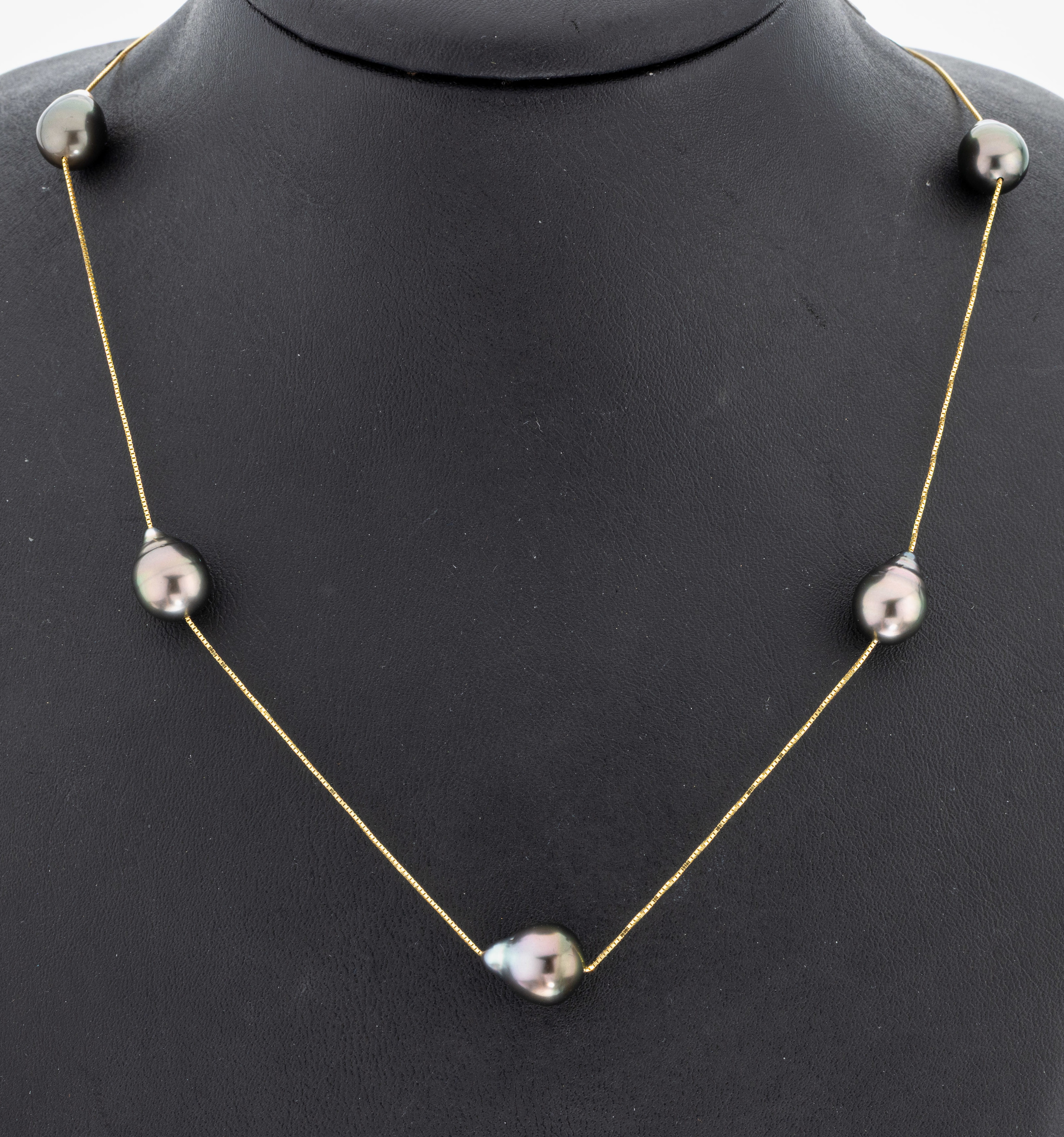14 kt Gold Perl-Collier, GG 585/000, 5 unrunde Tahitizuchtperlen, D. ca. 9.1 mm,
