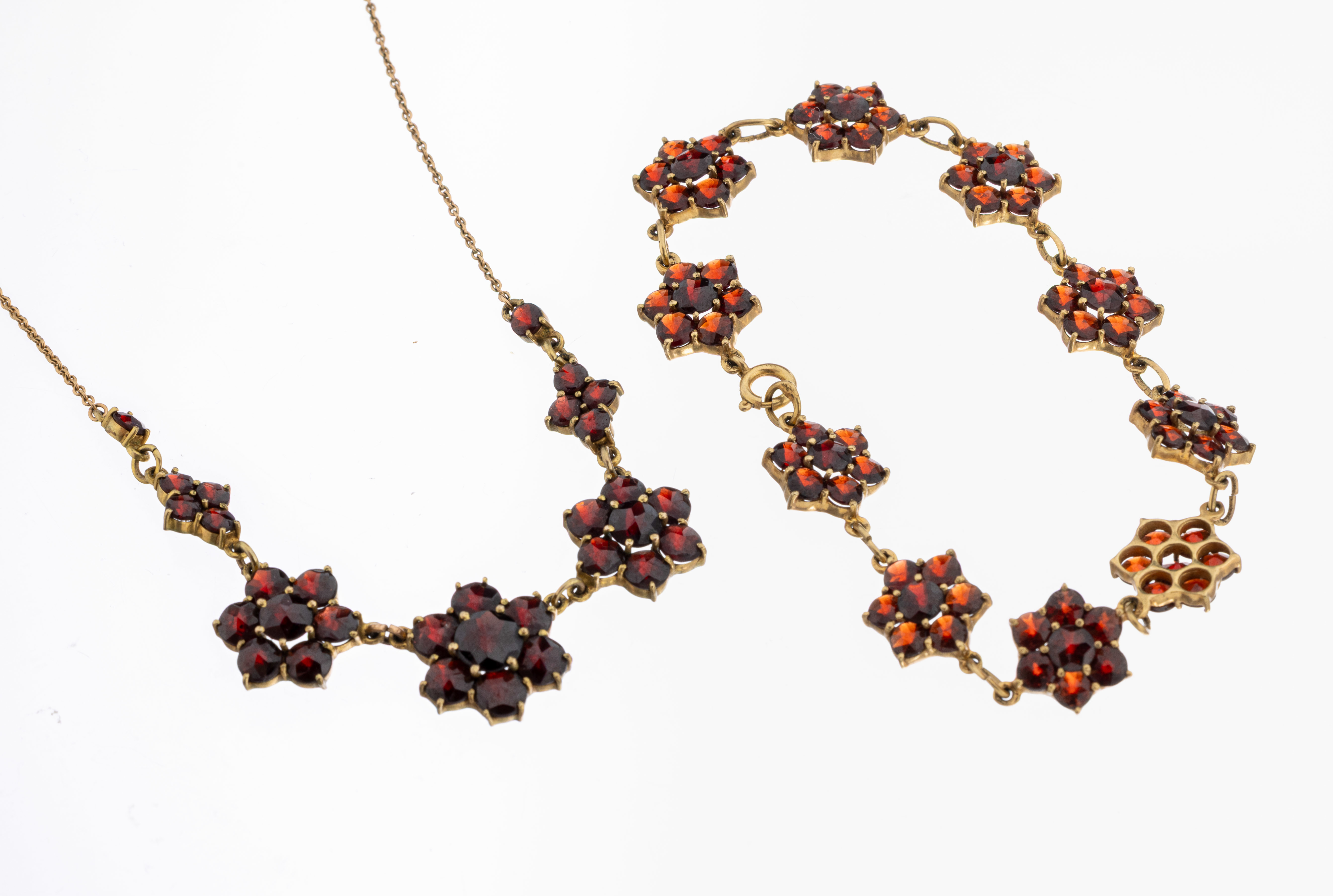 8 kt Gold Granat-Schmuckset, GG 333/000, best, aus: 1 Armband, L. ca. 20 cm, Federringschließe,