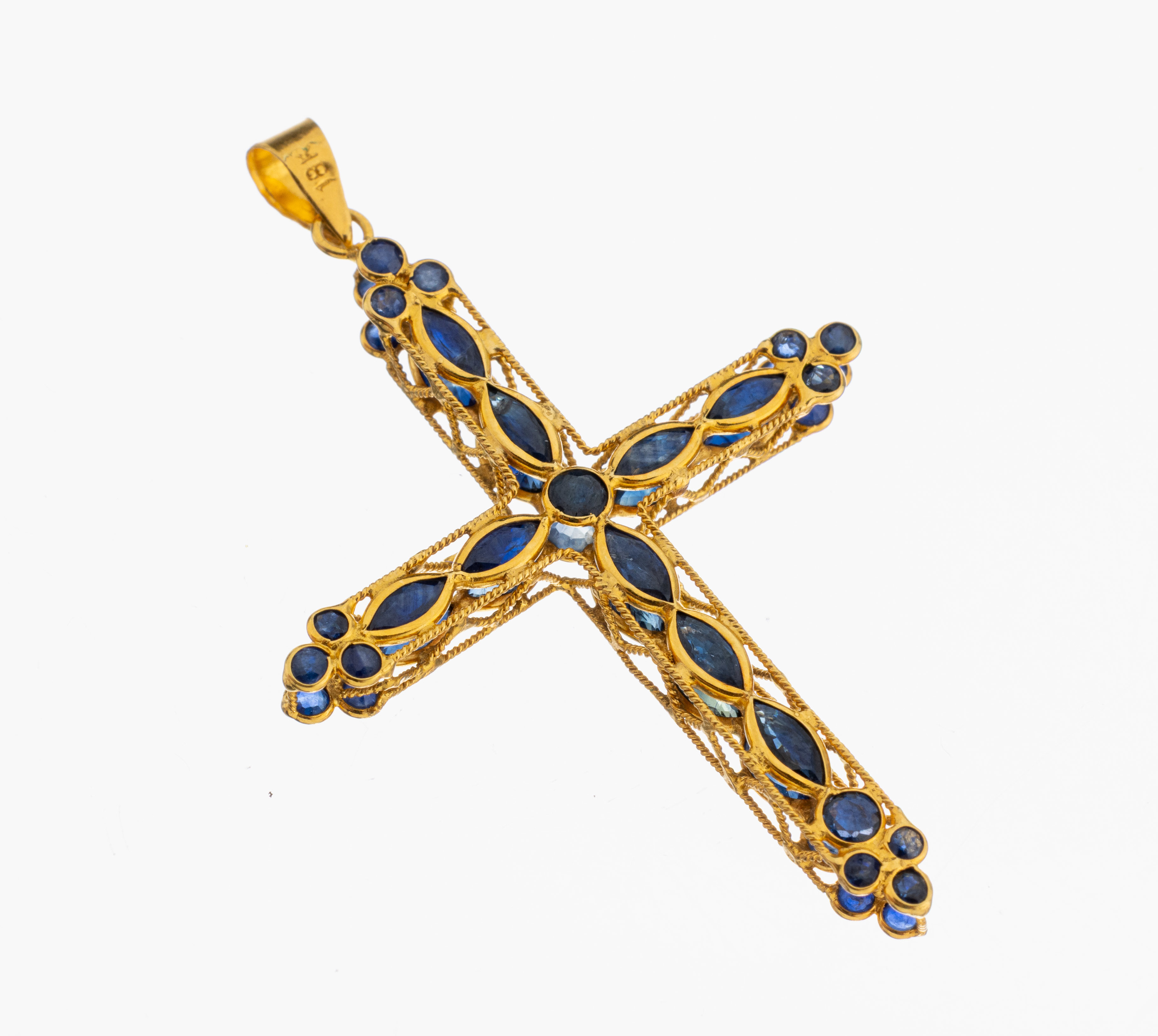 18 kt Gold Saphir-Kreuzanhänger, GG 750/000, filigrane Ausführung, 28 rundfacett.