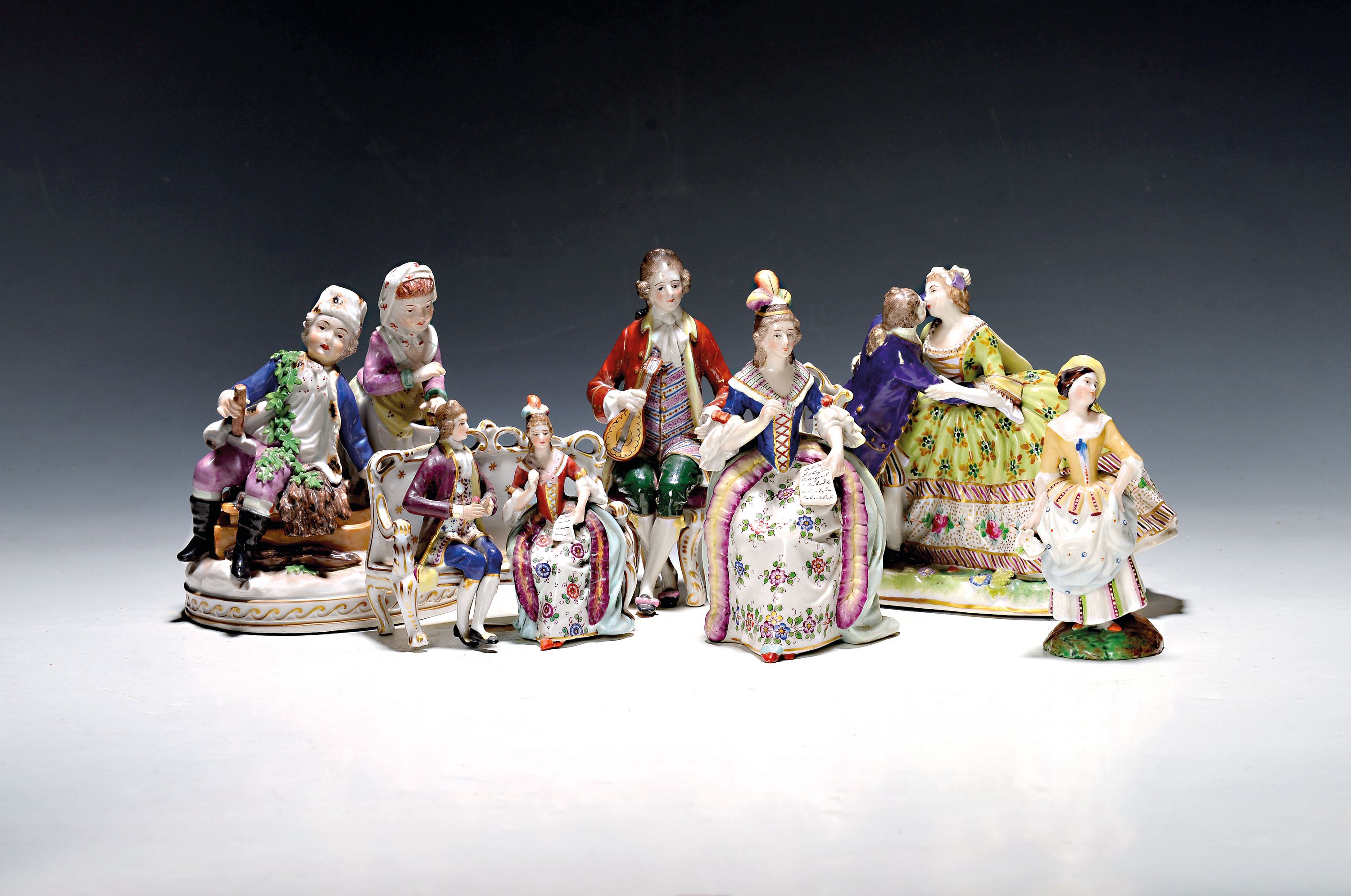 approx. 16 x 14 cm; Couple sitting on a bench, rest., approx. 11 x 11 x 6 cm; 2 gallant