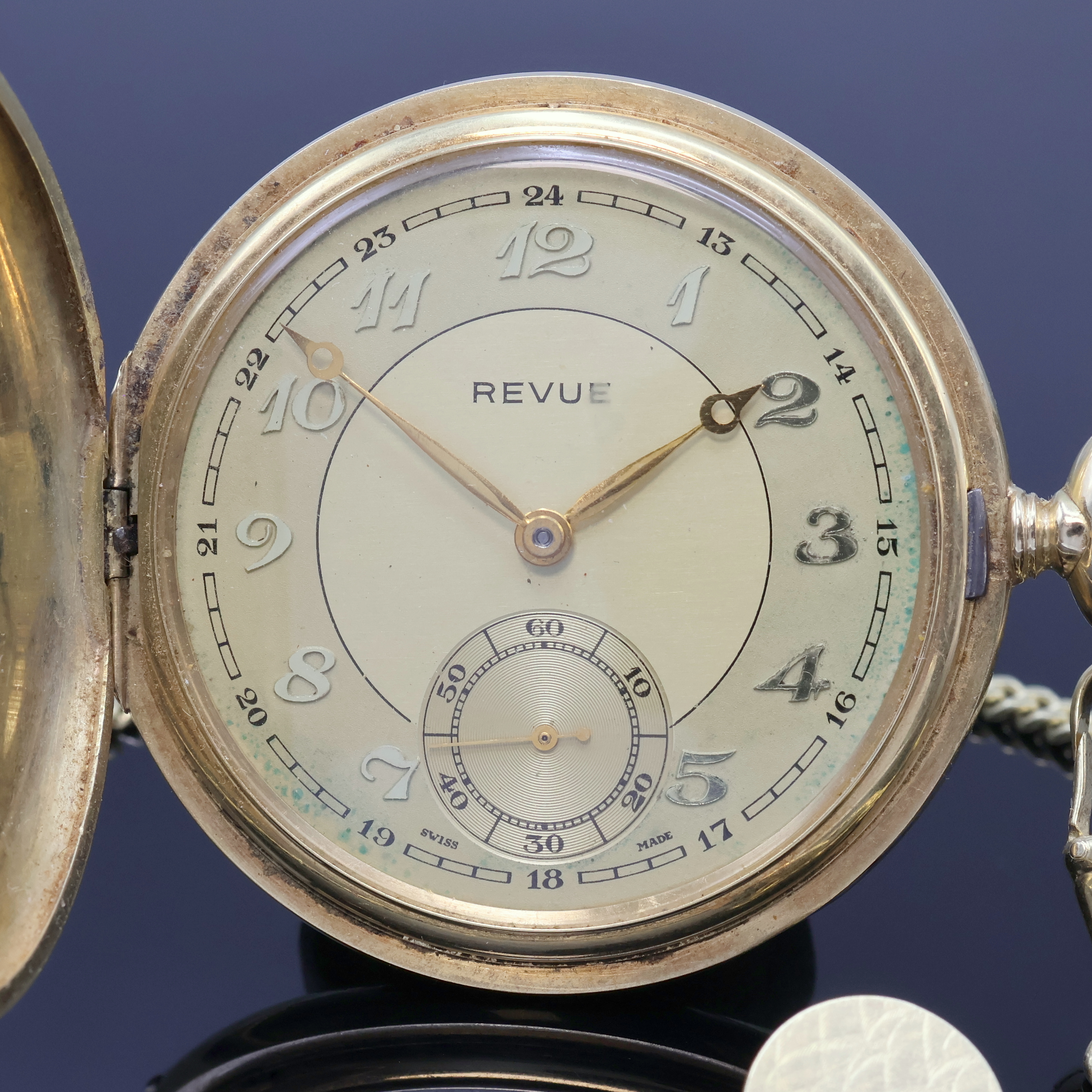REVUE 14k yellow gold hunting cased pocket watch with 14k yellow gold chain, Switzerland