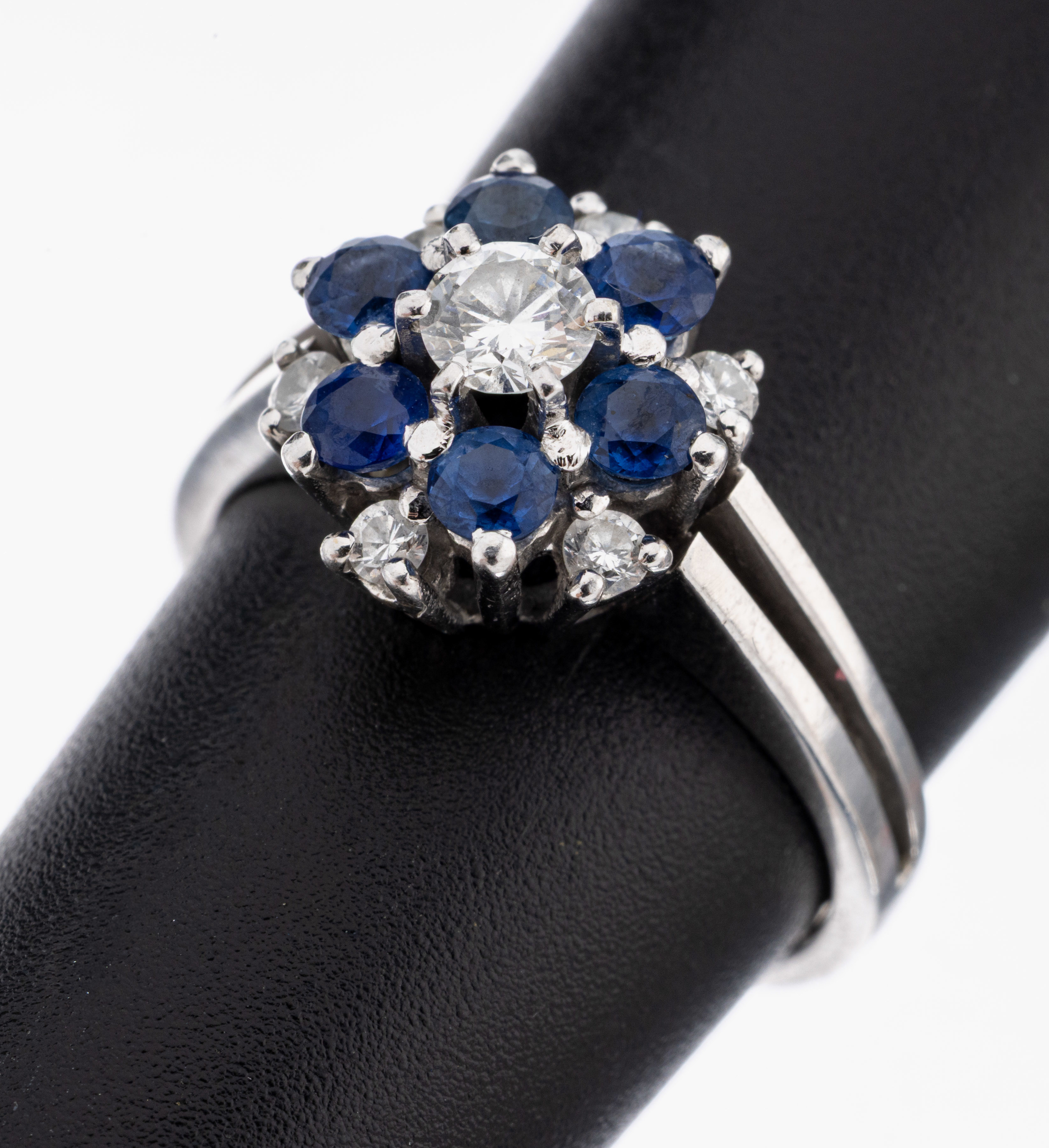 14 kt Gold Saphir-Brillant-Ring, WG 585/000, blütenf. Ringkopf, 6 rundfacett. Saphire