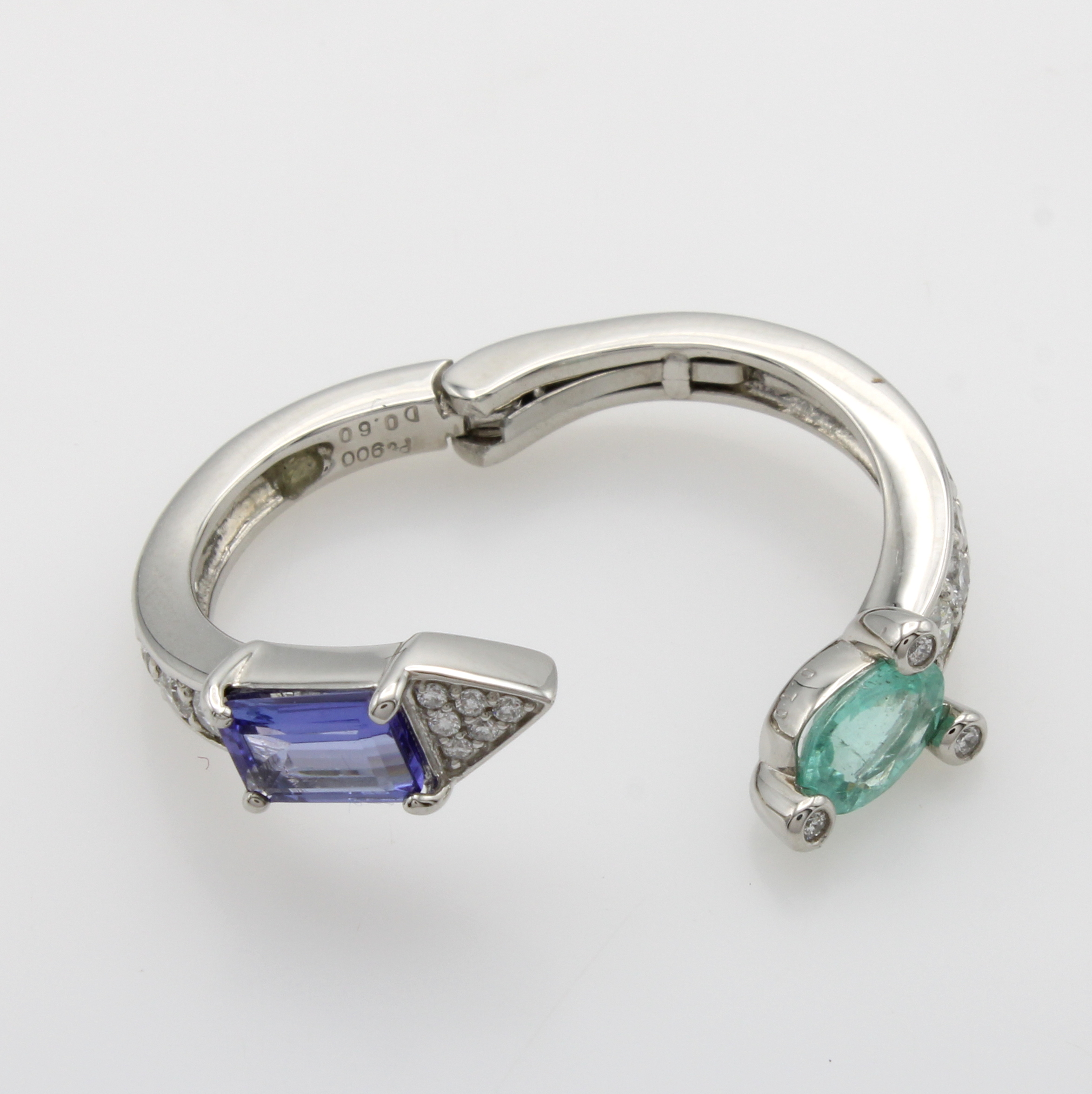 Ring mit Farbsteinen und Brillanten, Platin 900/000, ovaler Paraibaturmalin ca. 0.70 ct, Tansanitbaguette ca. 0.86 ct, Brill. zus. ca. 0.60 ct feines Weiß/vs, mit Klappscharnier fürleichteres Tragen, RW ca. 54 Schätzpreis: 4580, - EUR