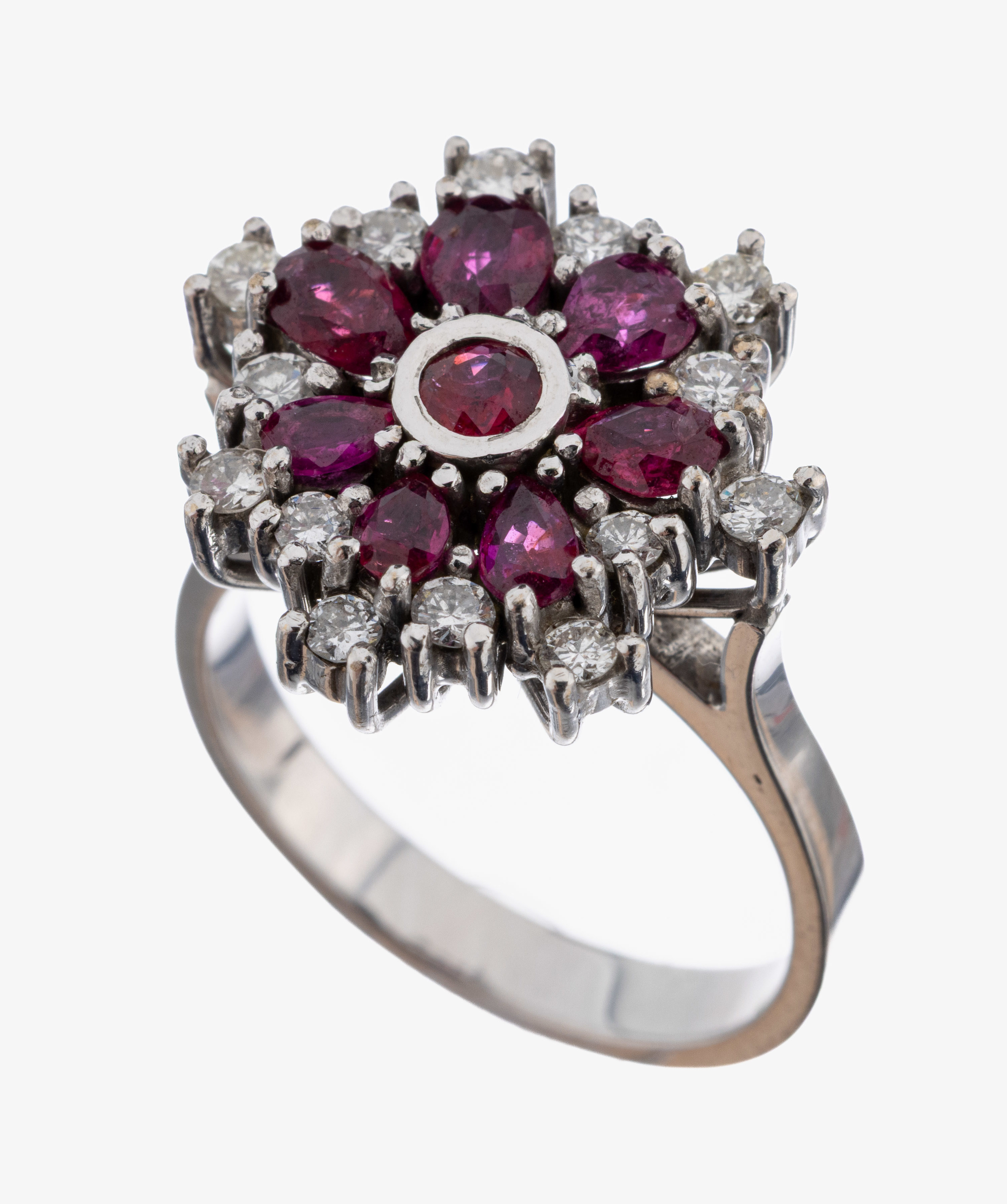 18 kt Gold Rubin-Brillant-Ring, WG 750/000,1 rundfacett. Rubin und 7 facett. Rubintropfenzus.