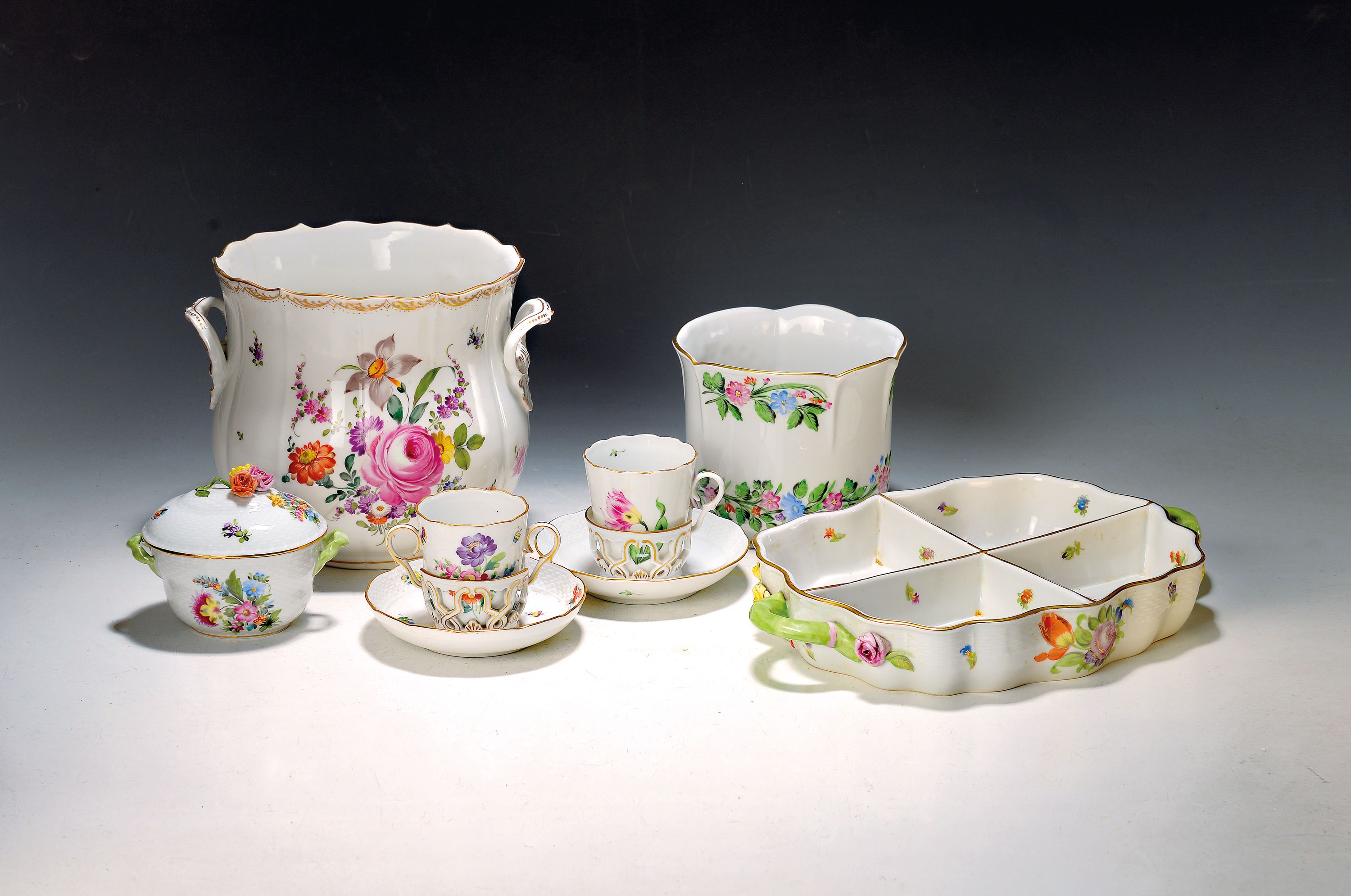 6 Teile Herend und einen Blumentopf, 20. Jh., zwei Schokoladentassen mit aufwendigen