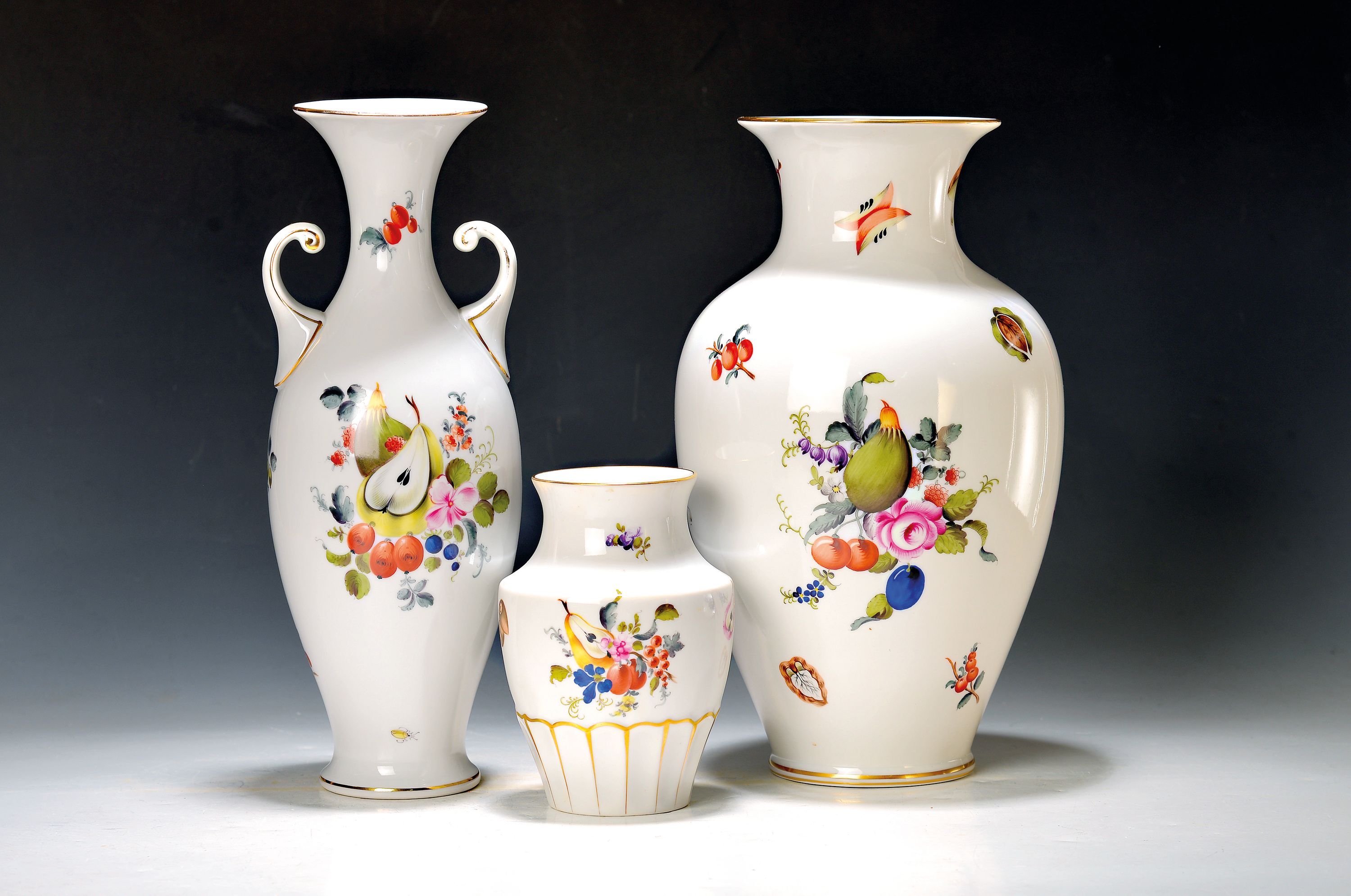 Drei Vasen Herend, 20. Jh., Porzellan, Früchtedekor, Doppelhenkelvase H. 33.5 cm