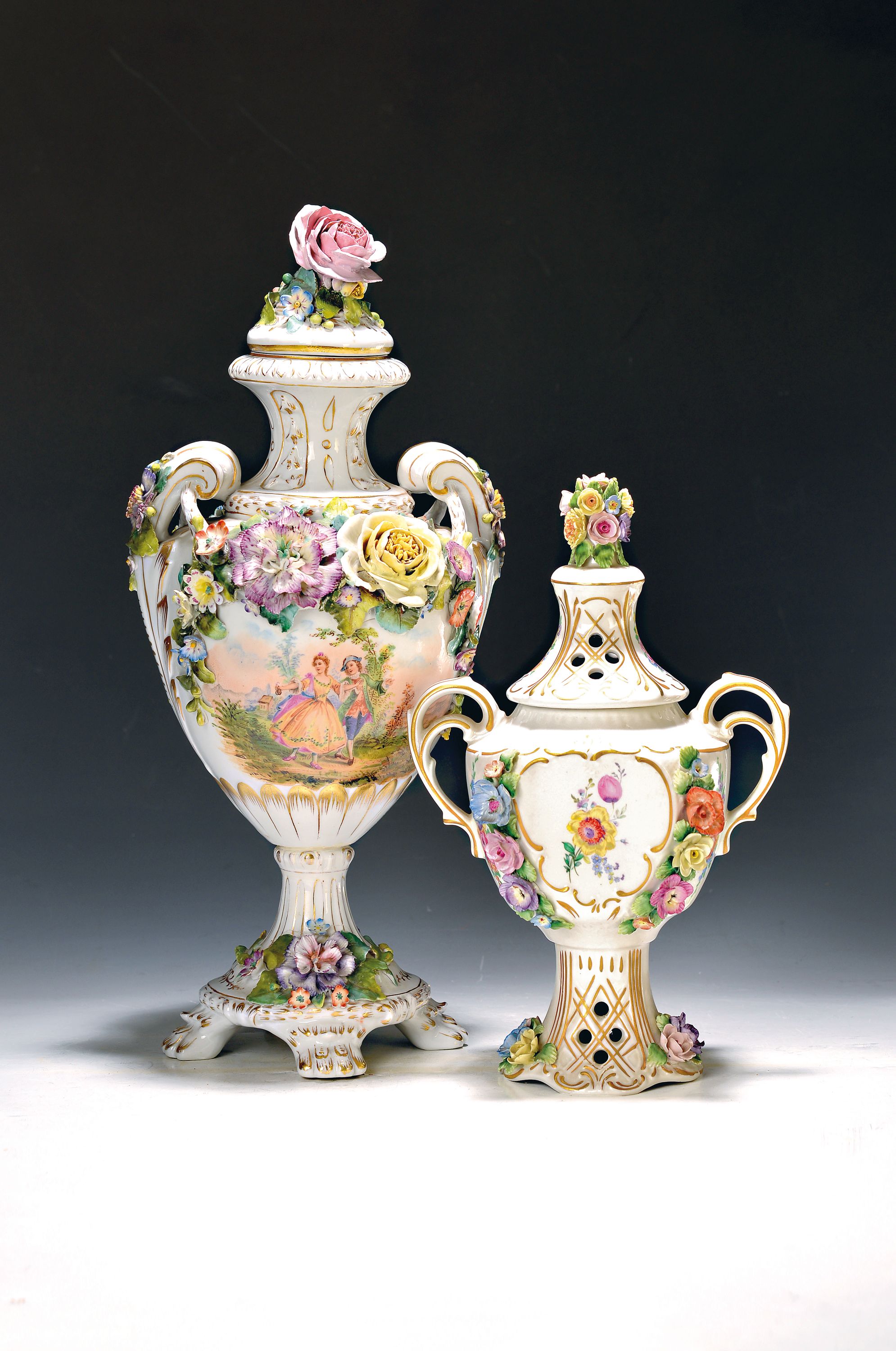 Zwei Deckelvasen, 20. Jh., Porzellan, a. Bindeschildmarke, applizierter Blütendekor,