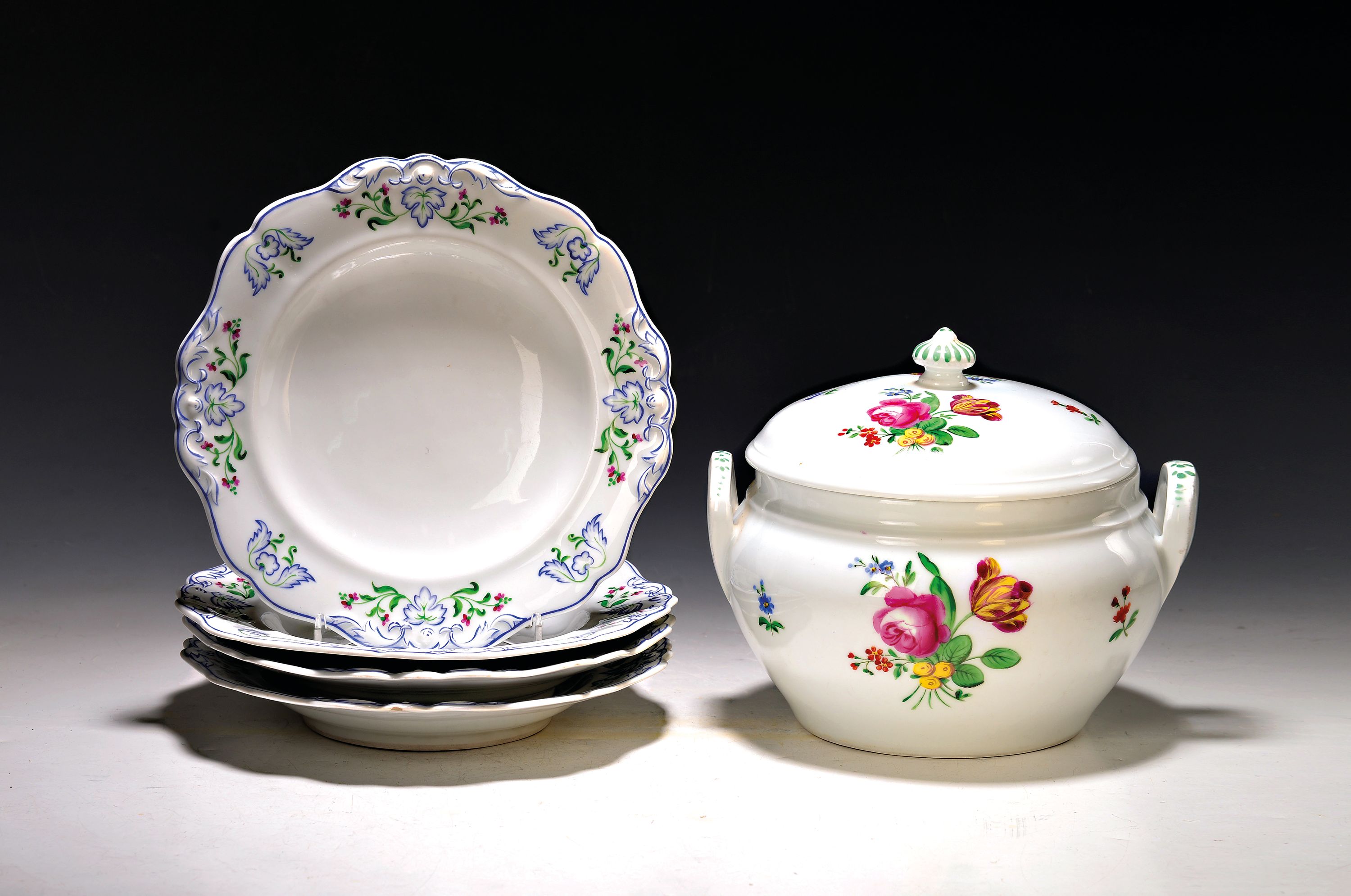 Bindenschildmarke, bemalt, D. 23 cm, zwei Teller l. besch., Deckelschüssel mit Blumenmalerei,