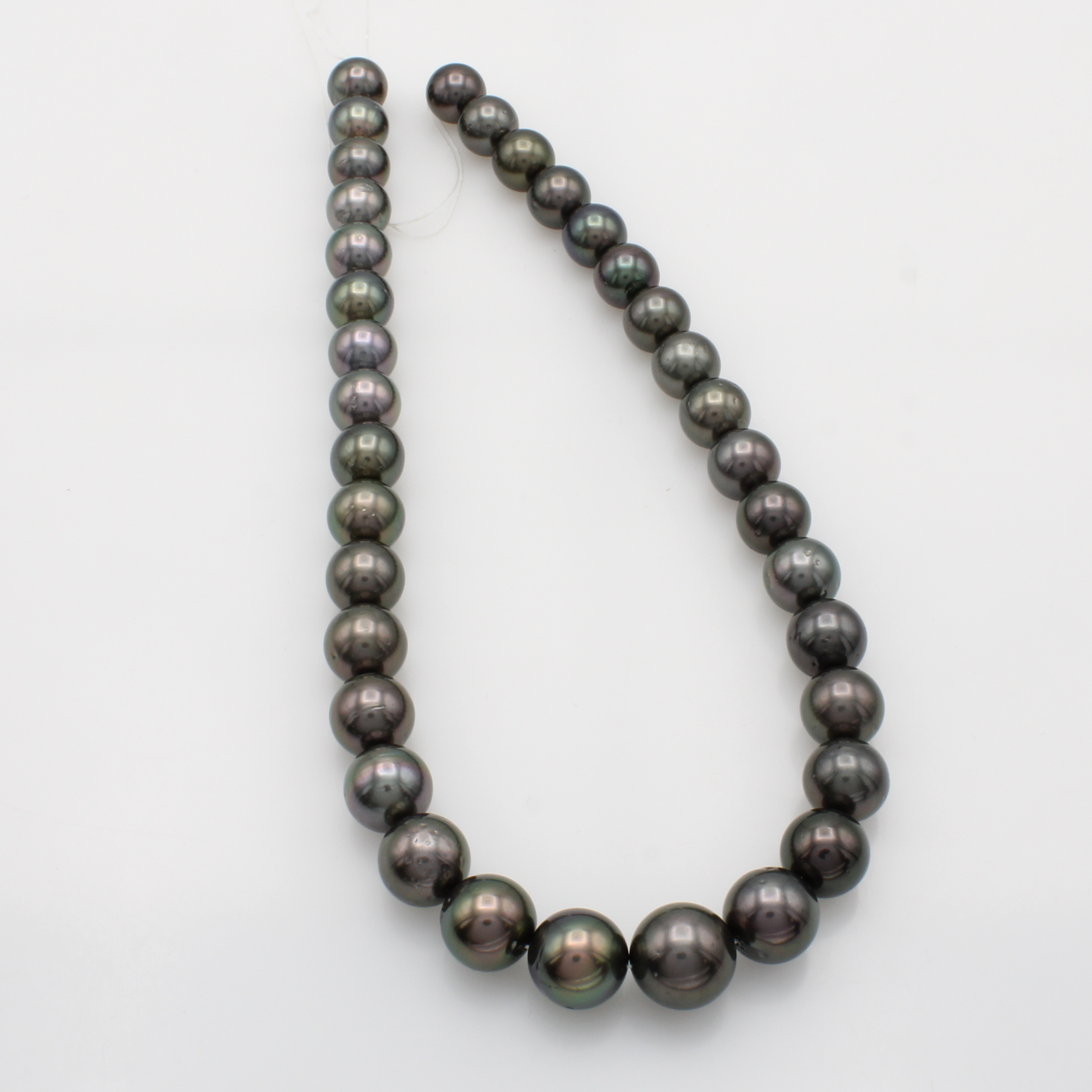 Tahitizuchtperlenstrang, fast schwarze Perlen im l. Verlauf v. 11-13 mm mit glänzendem Lüster, L. ca. 41 cm Schätzpreis: 6000, - EUR