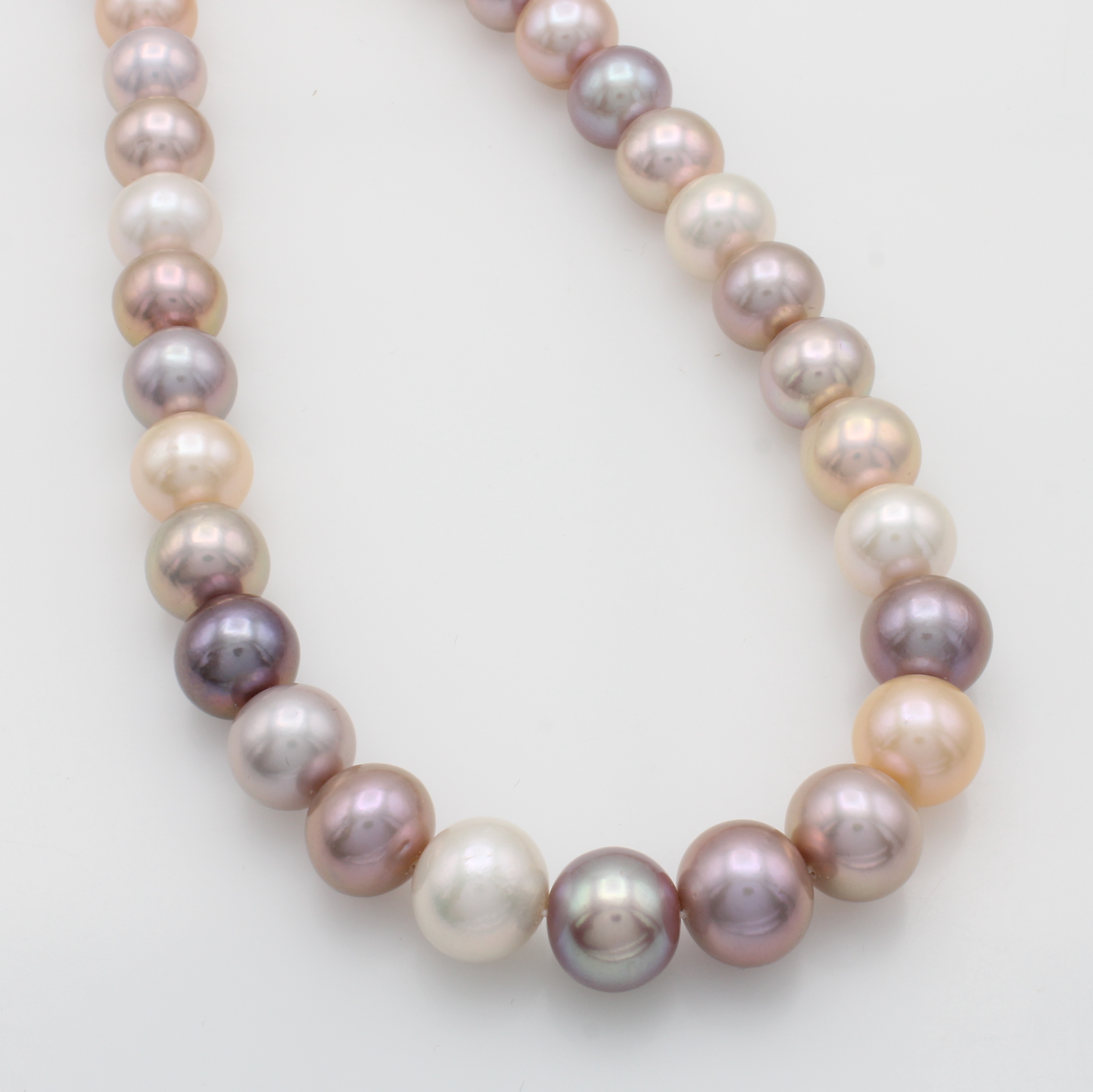Süßwasserzuchtperlenstrang, sog. Mingperlen, aprikot-, rosé-, fliederf. u. weiße Perlen im Verlauf v. 12-14 mm, L. ca. 40.5 cm Schätzpreis: 2000, - EUR