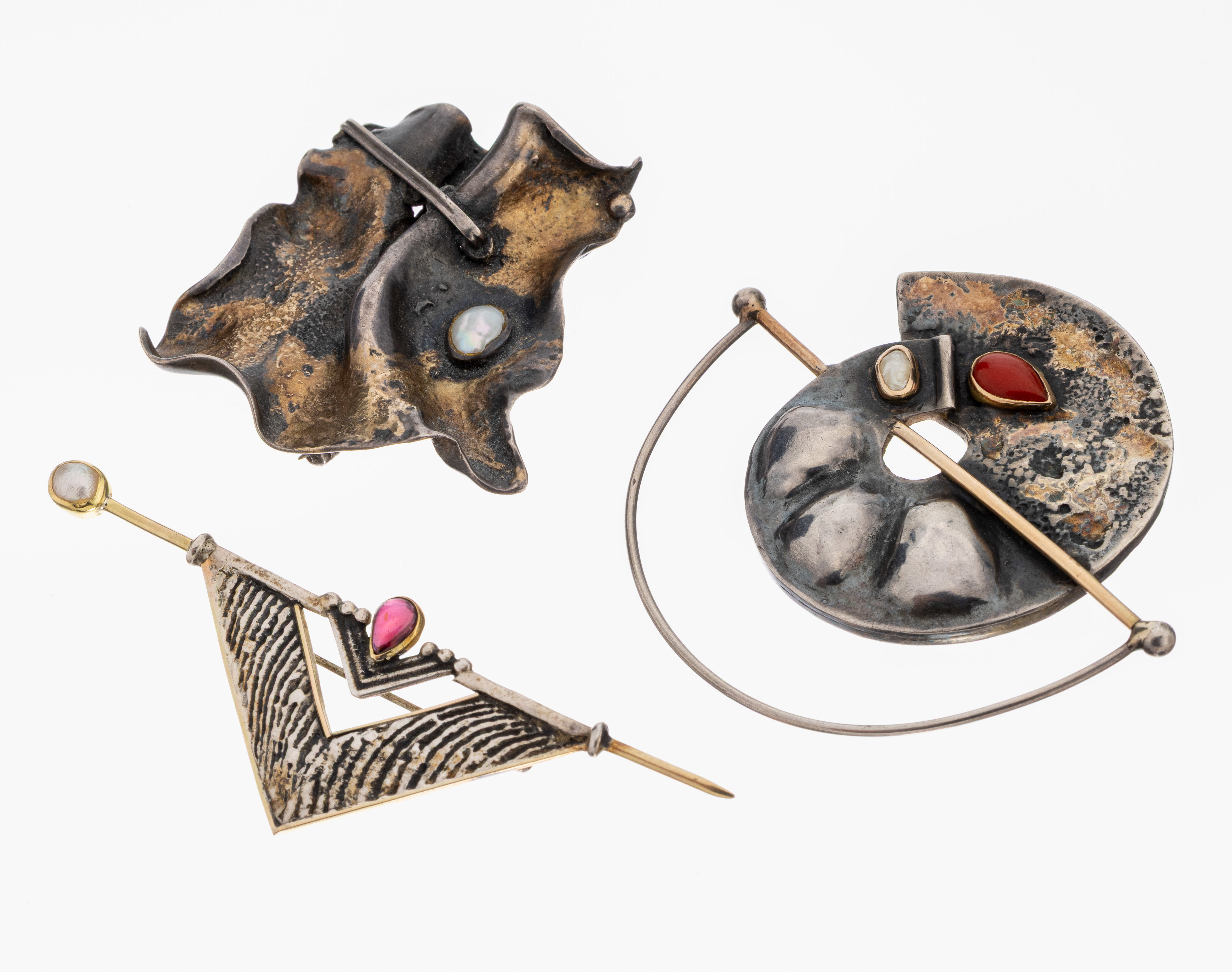 Konvolut 3 Designer Broschen, 925er Silber und GG 585/000, 1 x dreieckige Grundform,