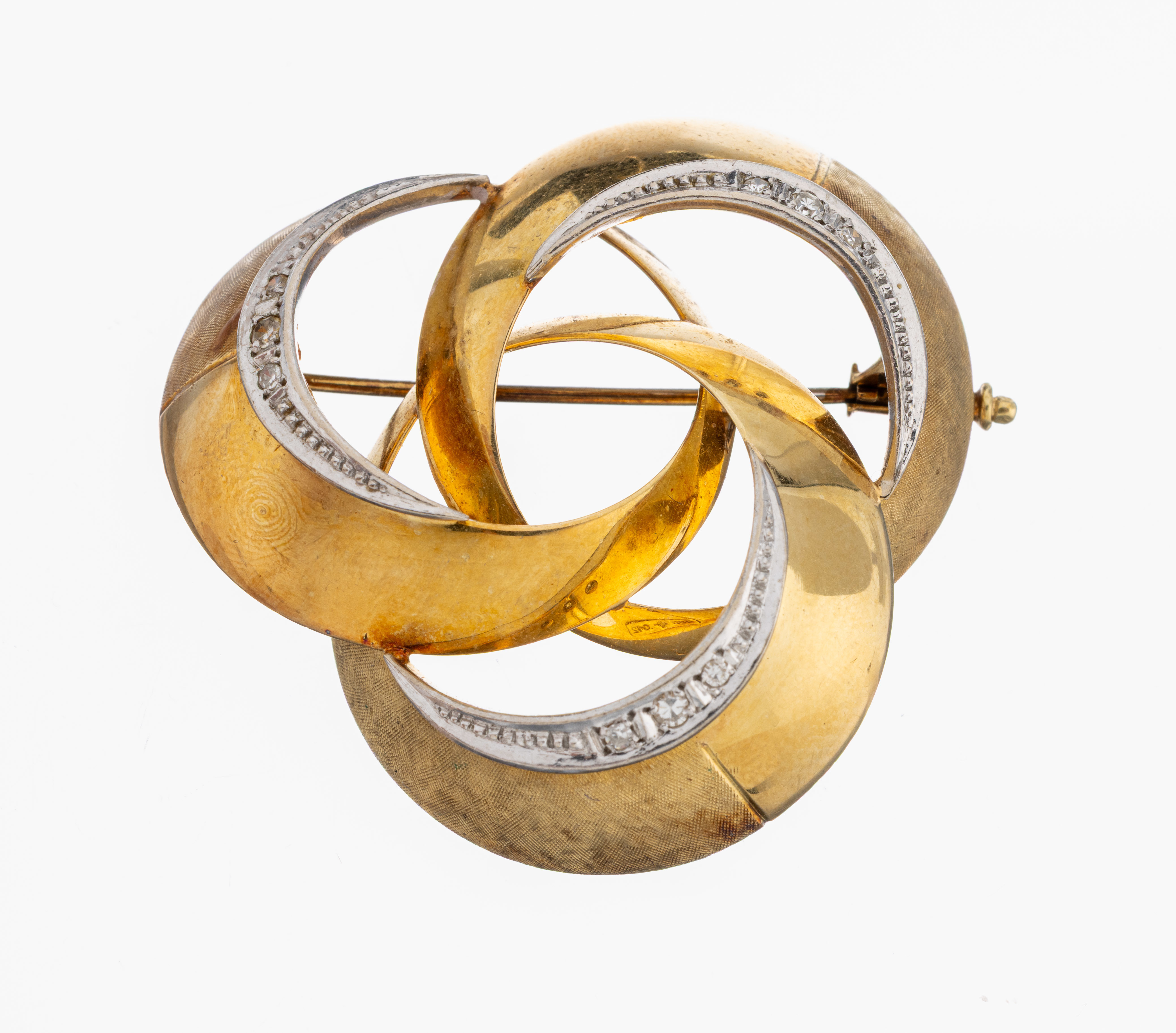 14 kt Gold Diamant-Brosche, GG/WG 585/000, part. sat., geschwungenes Design, 9 8/8-