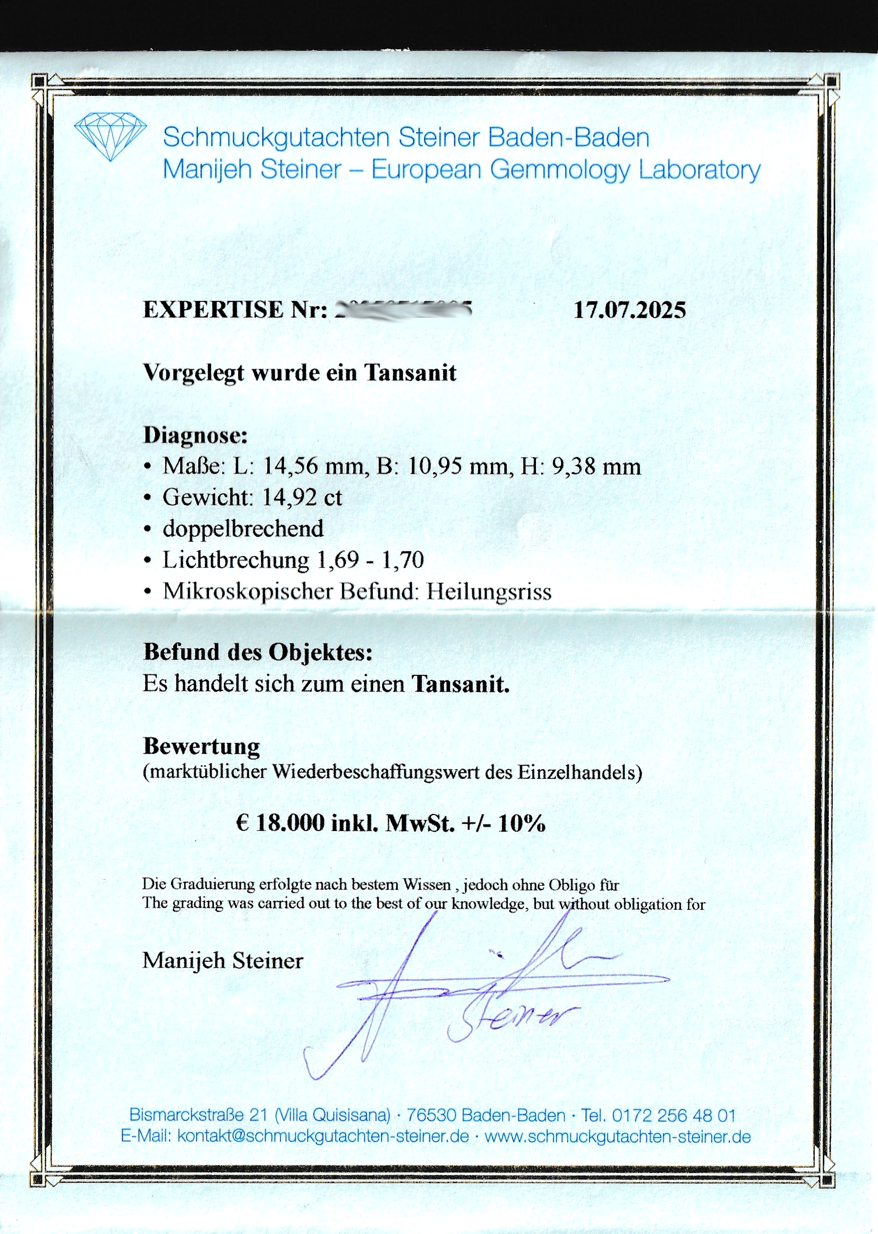 Loser facett. Tansanit, 14.92 ct, ca. 14.56 x 10.95 x 9.38 mm, Wertgutachten über 18000.- EUR anbei
