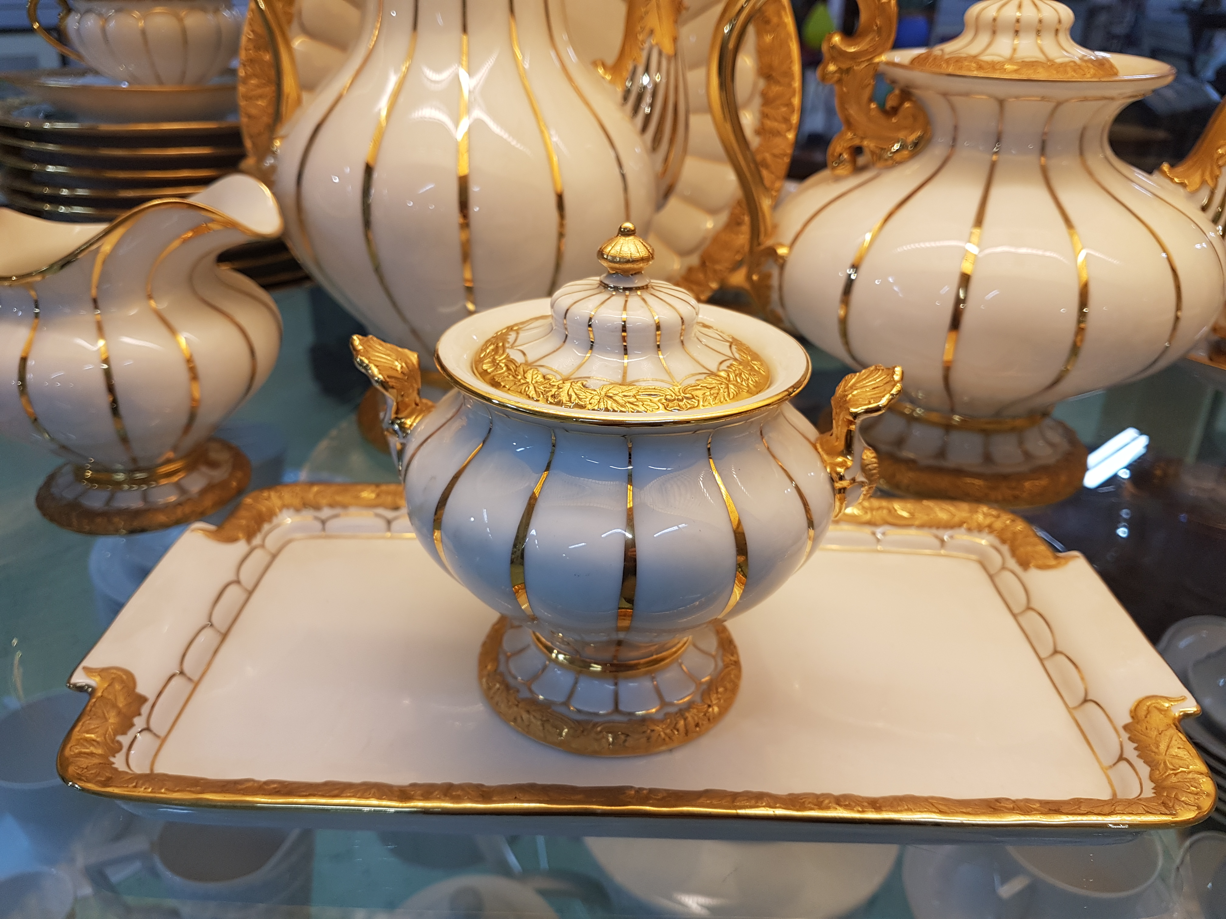 Teekanne (am Standring min. best.), Sahnegießer und Zuckerdose, rechteckiges Tablett,