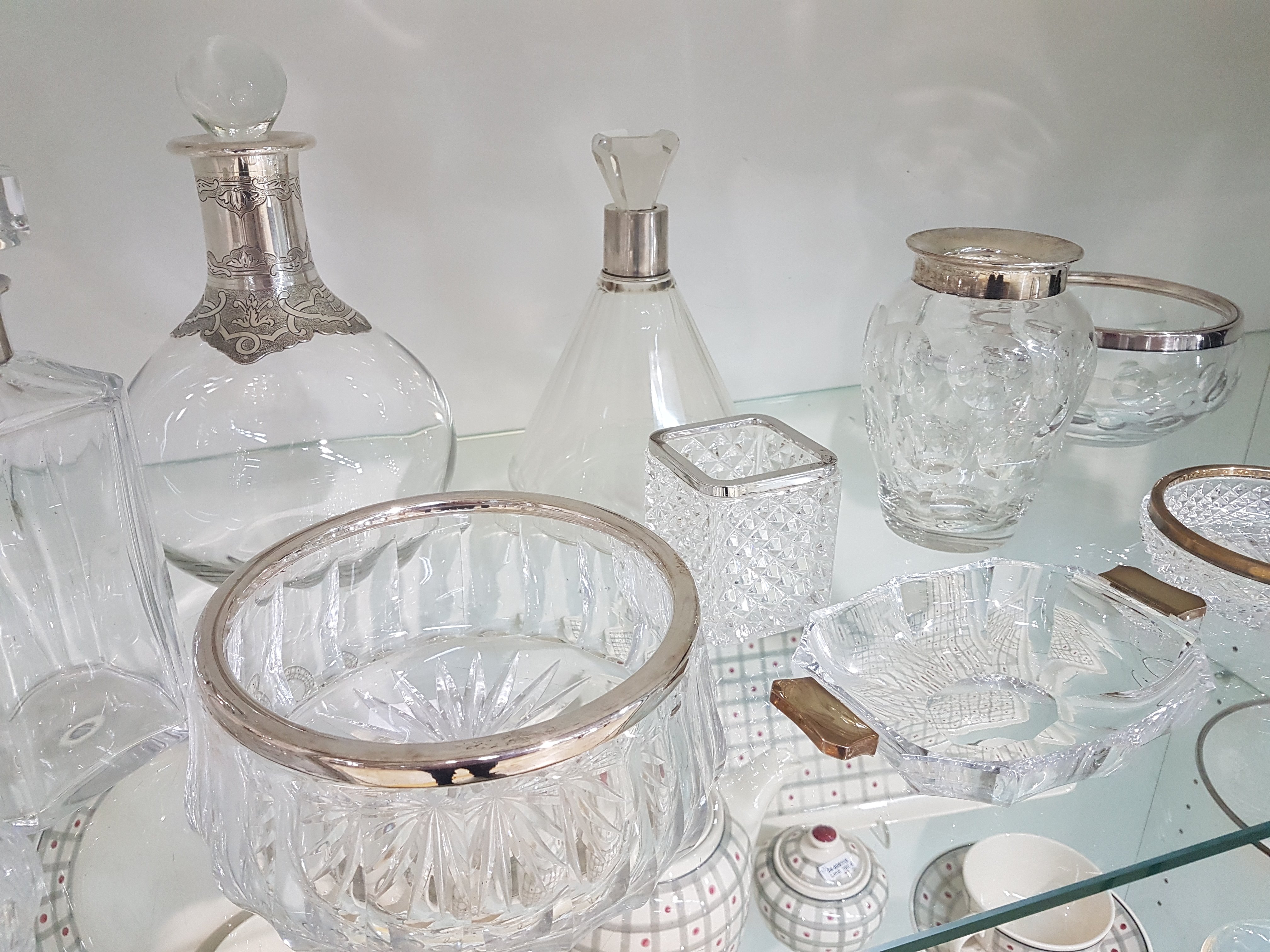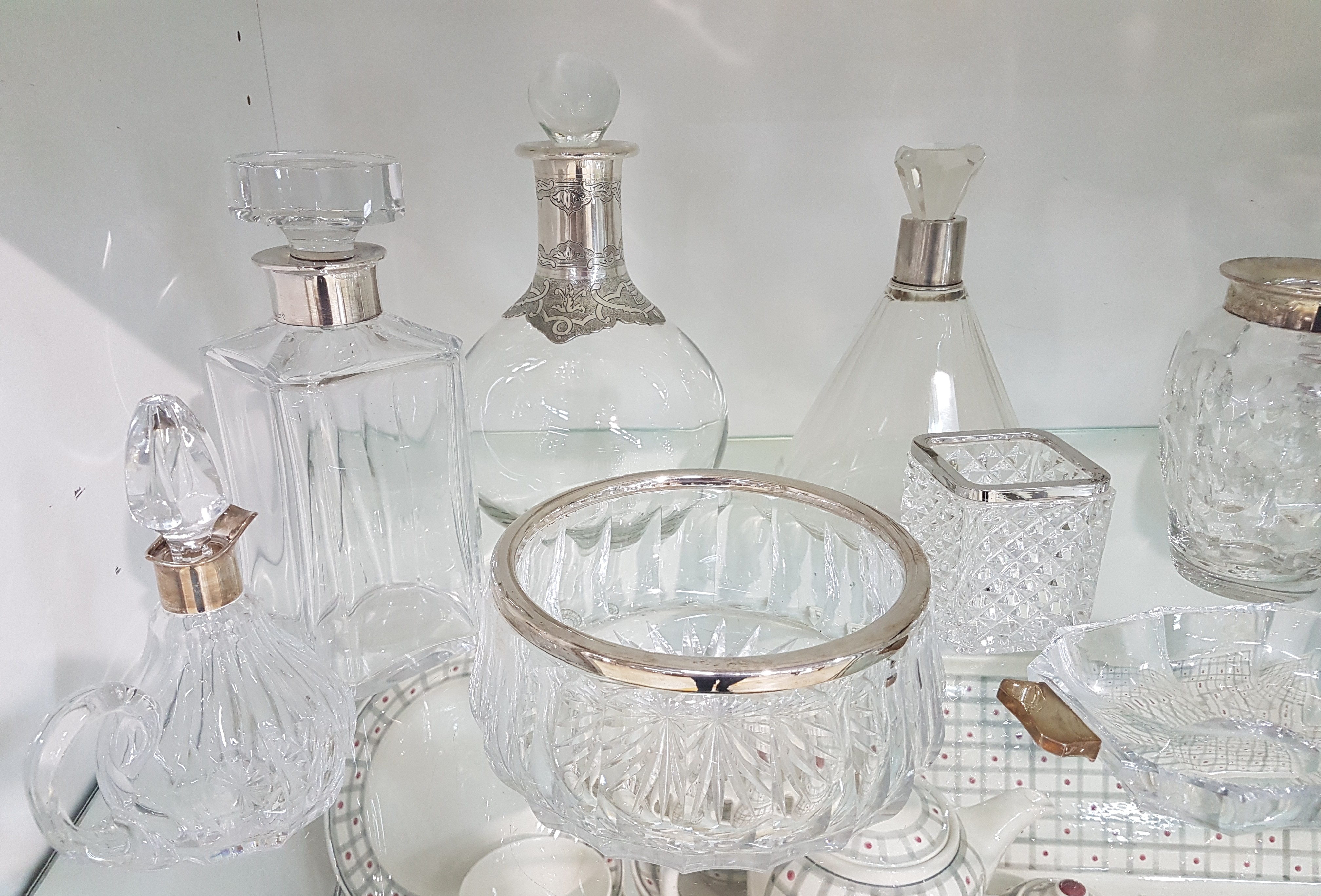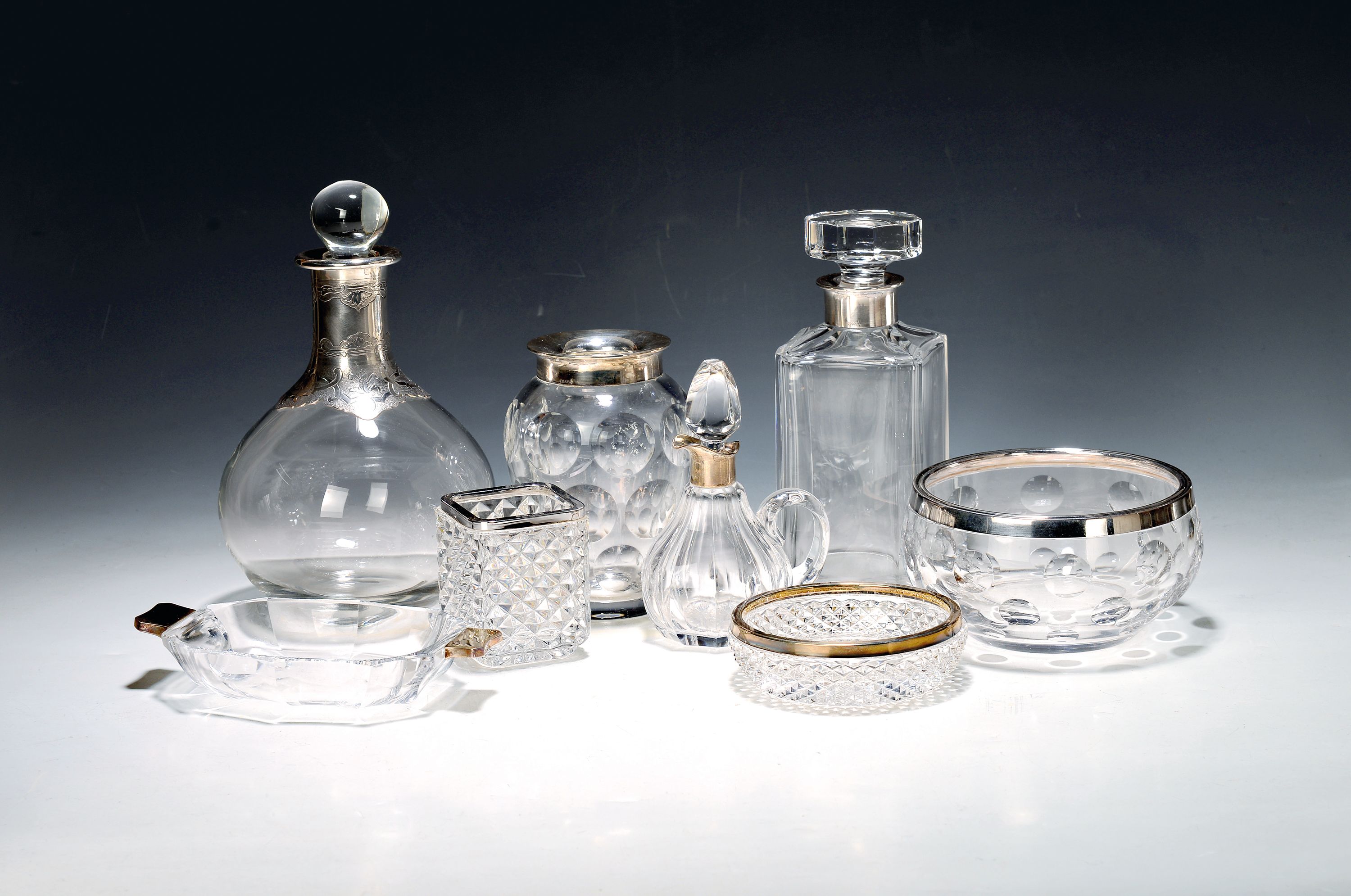 10 pieces of crystal glass with silver fittings, German, 20th century, colorless glass, mostly faceted, edges or handles in 800 silver, various sizes