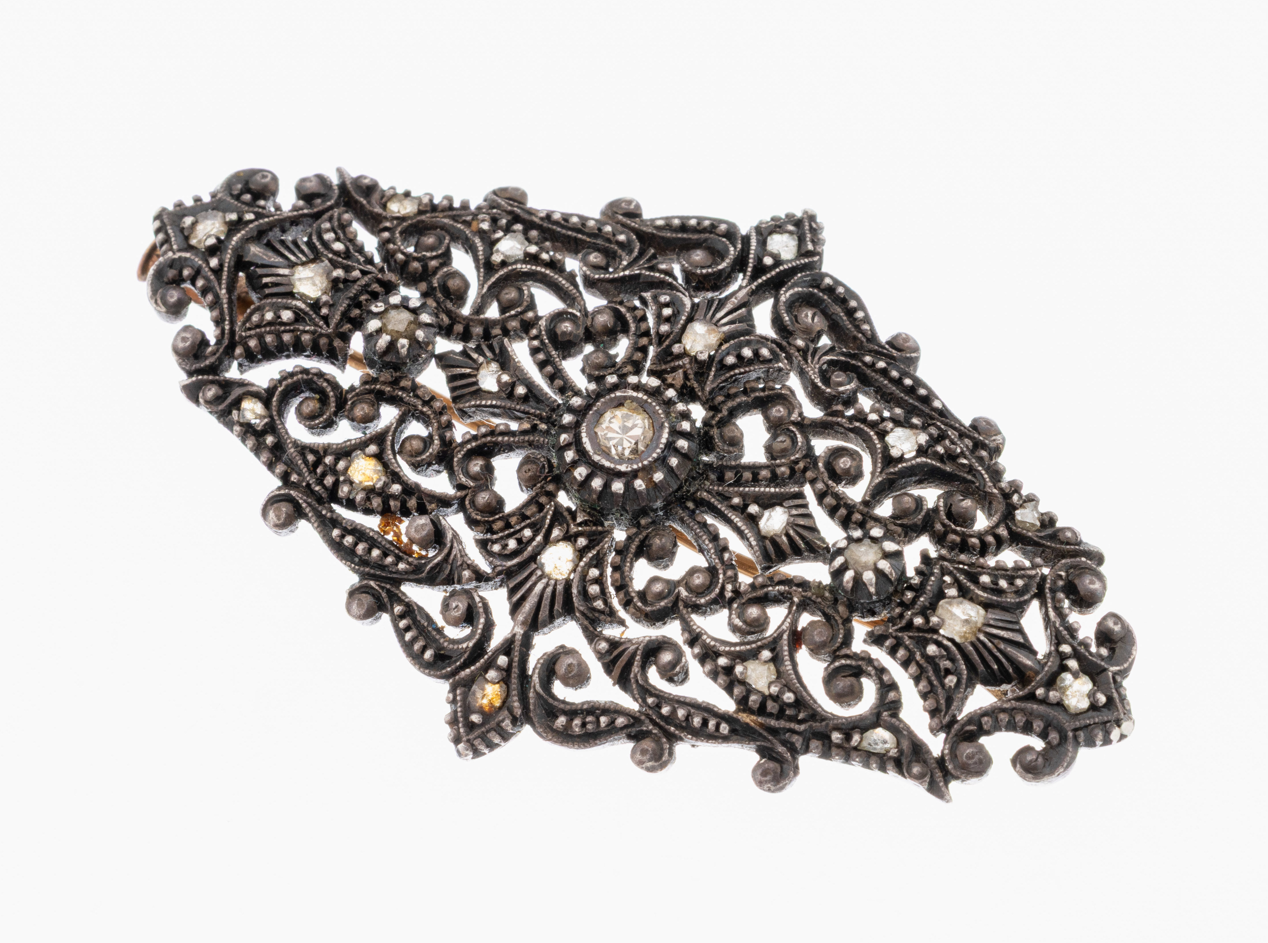 18 kt Gold und Silber Diamant-Brosche, GG 750/000, schauseitig Silber, nach älterem