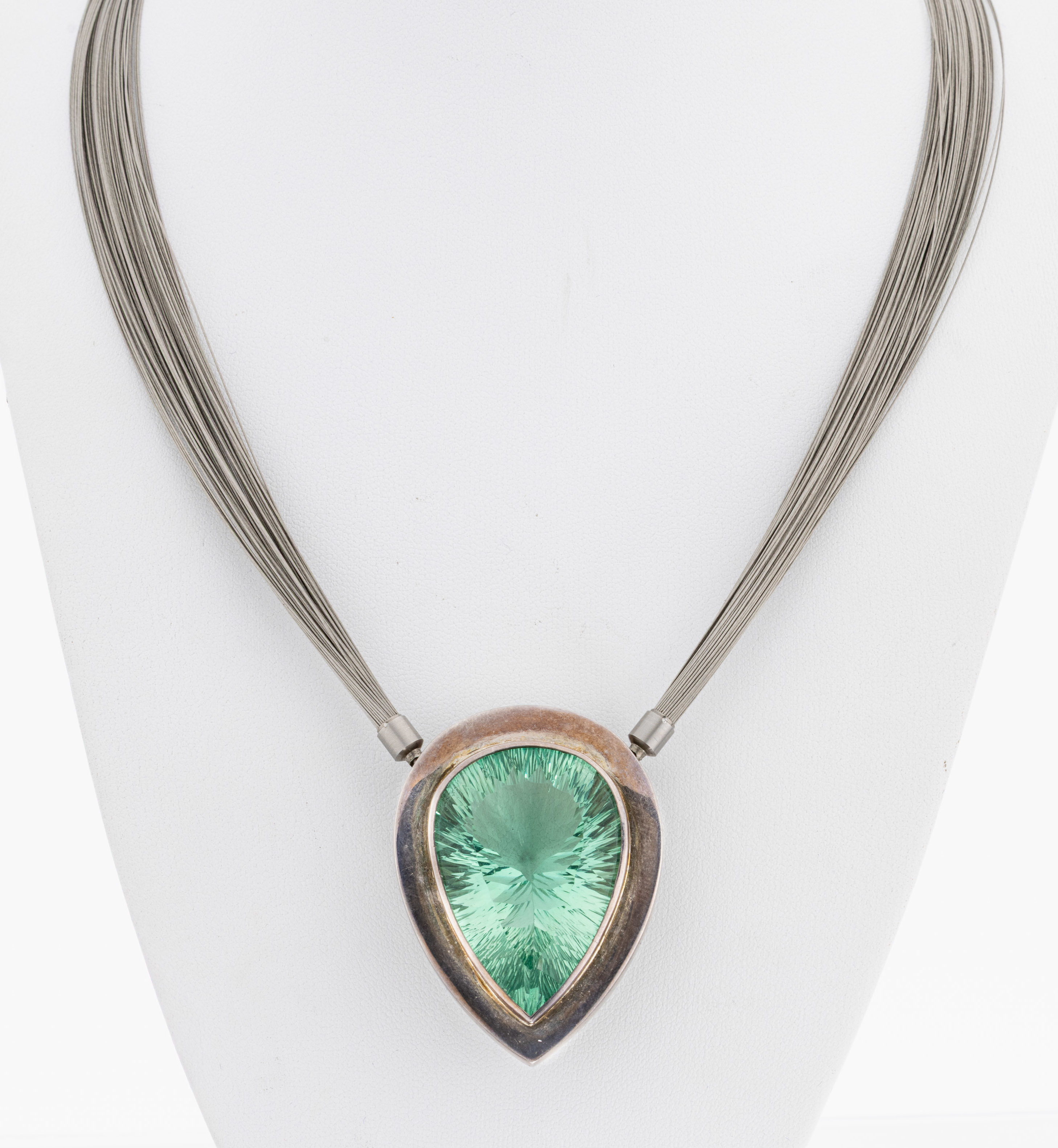 Fluorit-Anhänger, 925er Silber, facett. Fluorit-Tropfen ca. 50 ct, an mehrreihigem Stahlreif, Bajonetteschließe am Anhänger