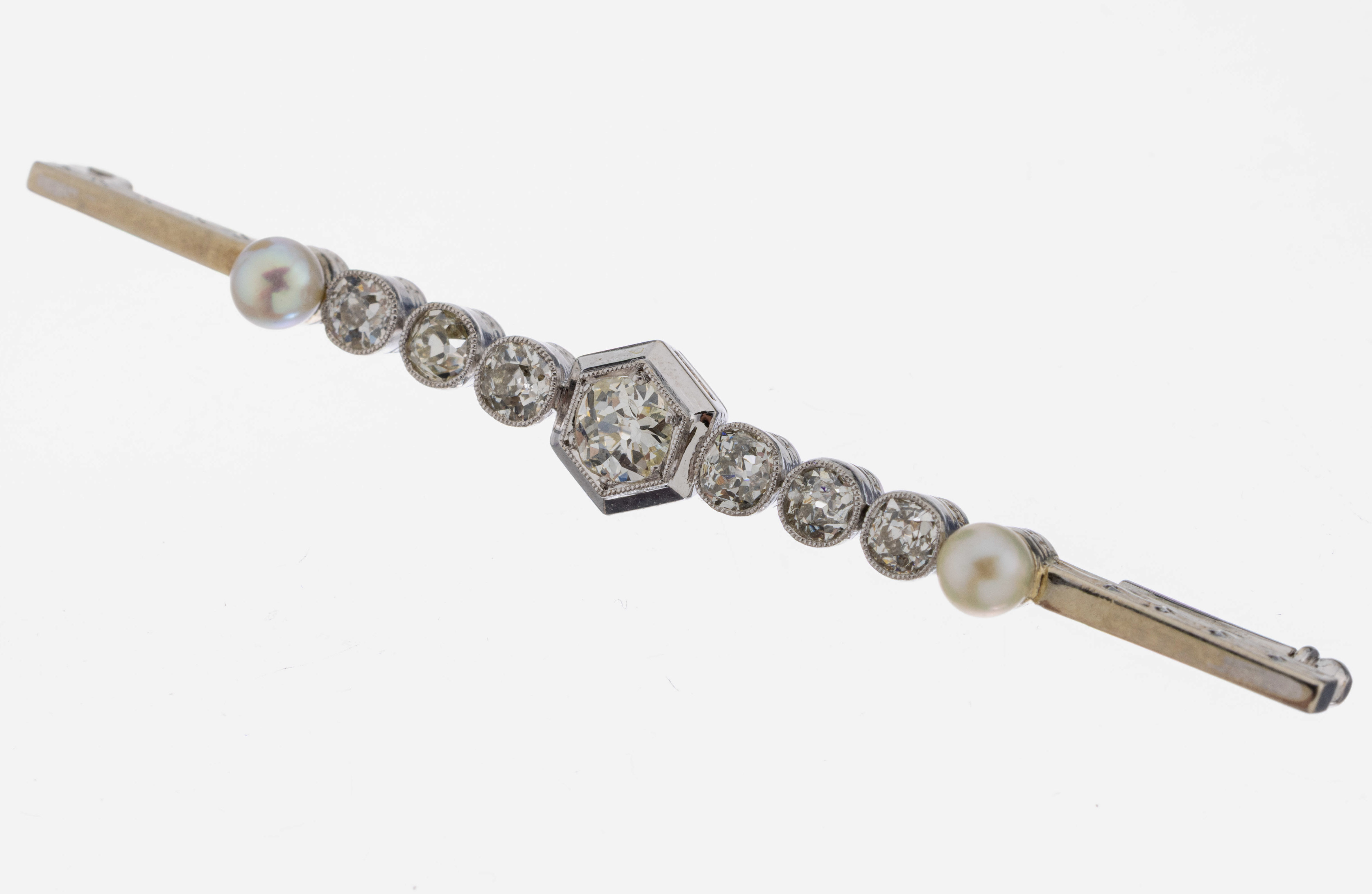 14 kt Gold Perl-Diamant-Brosche, um 1930, GG 585/000, 7 Altschliffdiamanten zus.