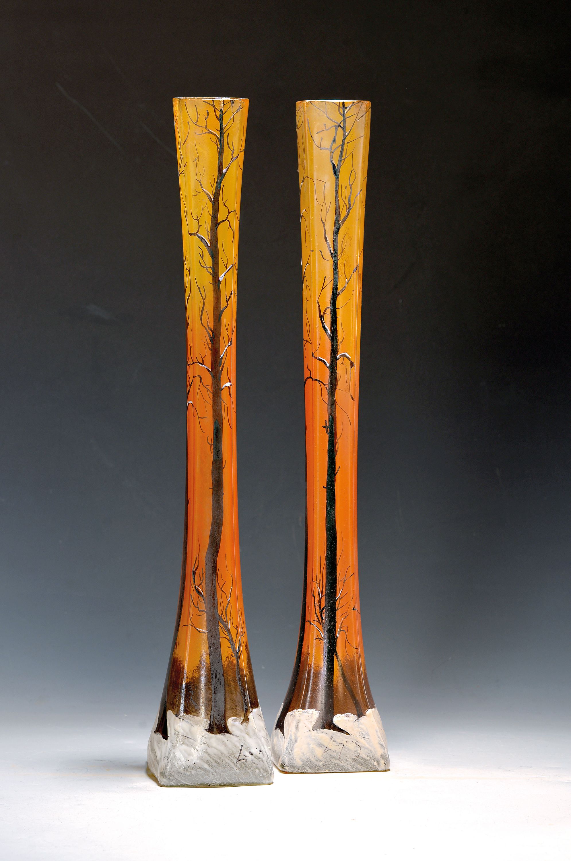 Paar Langhalsvasen, Legras Frankreich, um 1910, orange-gelb mit umlaufendem Emaildekor