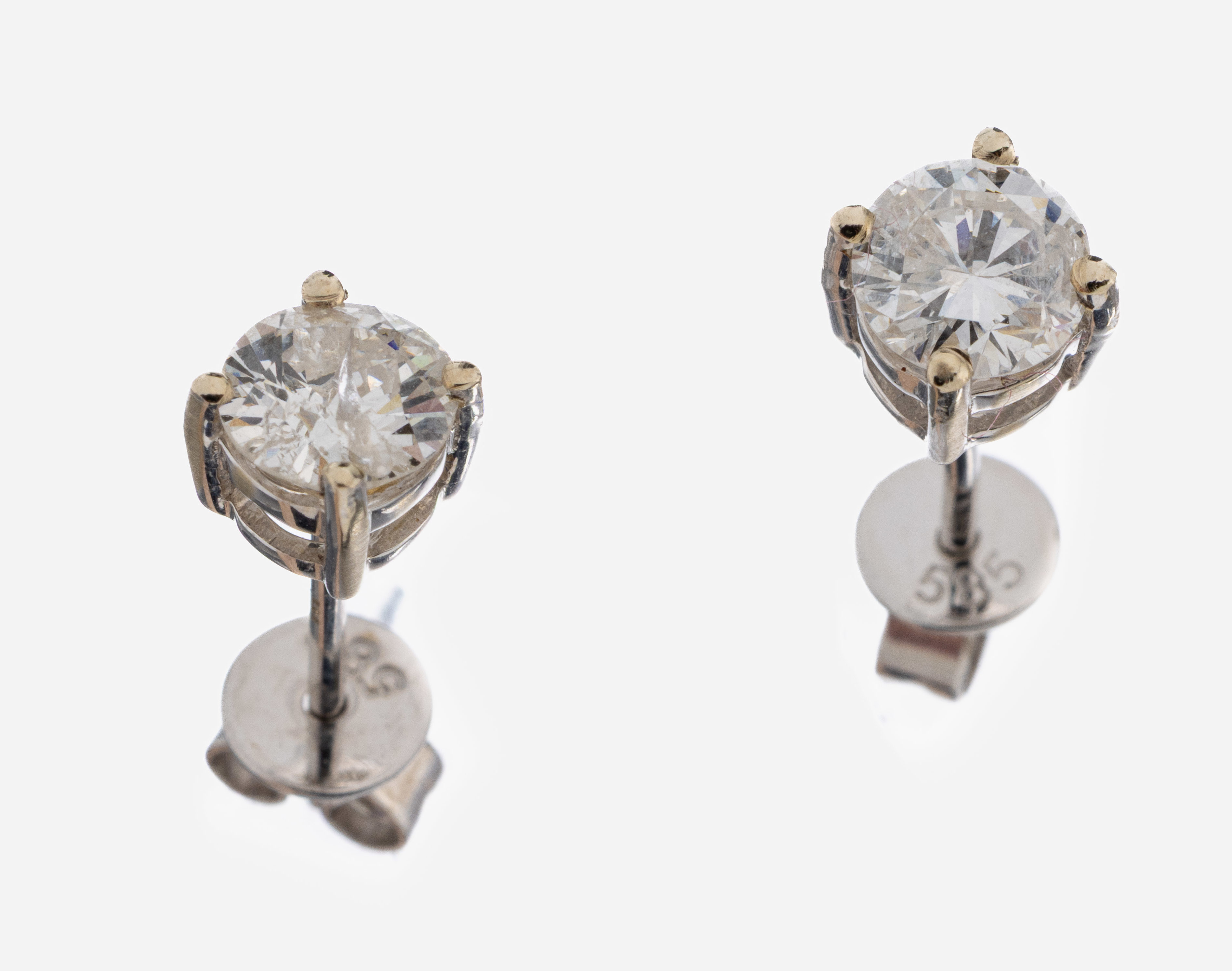 Paar 14 kt Gold Diamant-Ohrstecker, WG 585/000, 1 Brillant und 1 Altschliffdiamant zus. ca. 0.80 ct get.Weiß/p