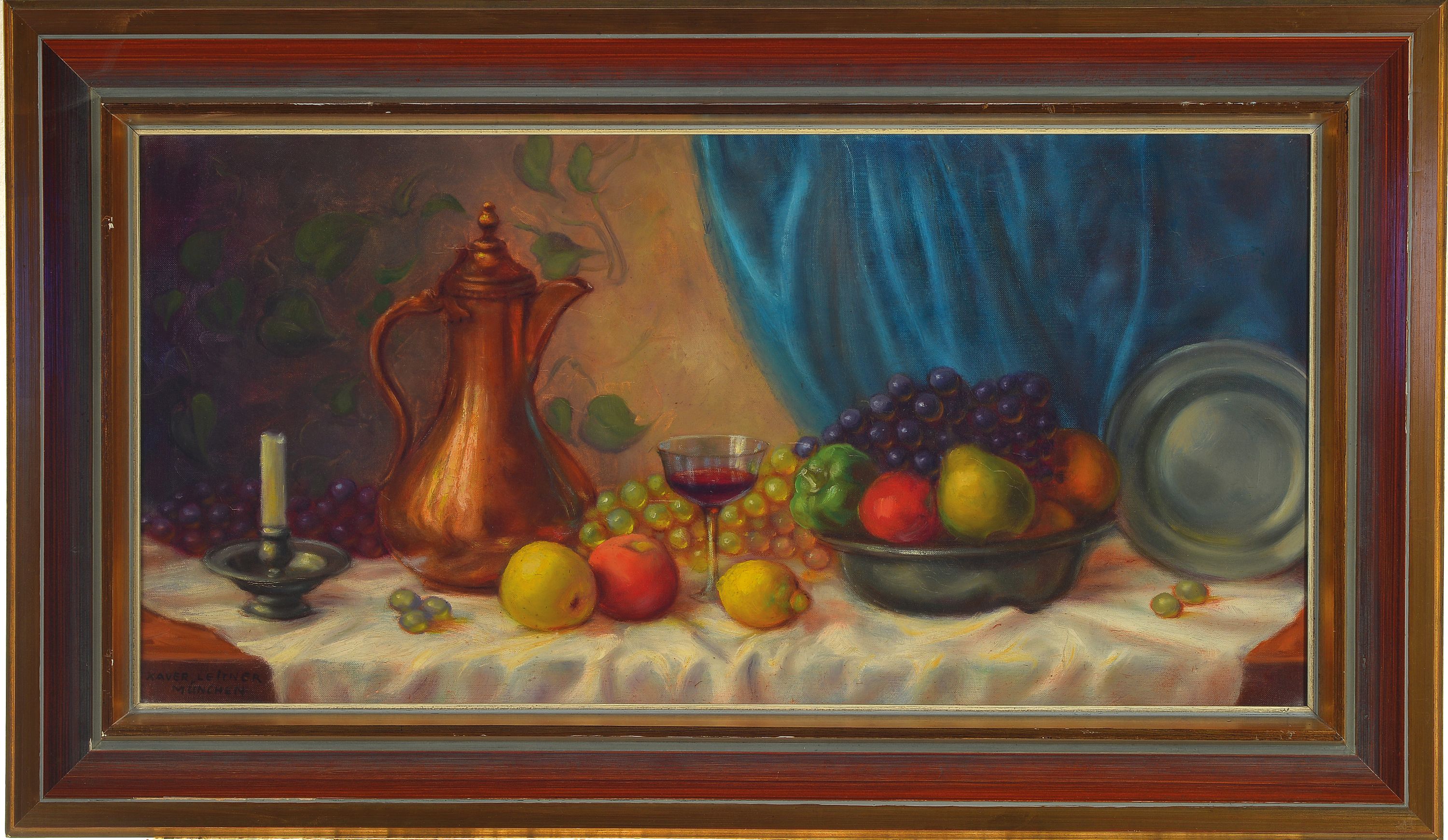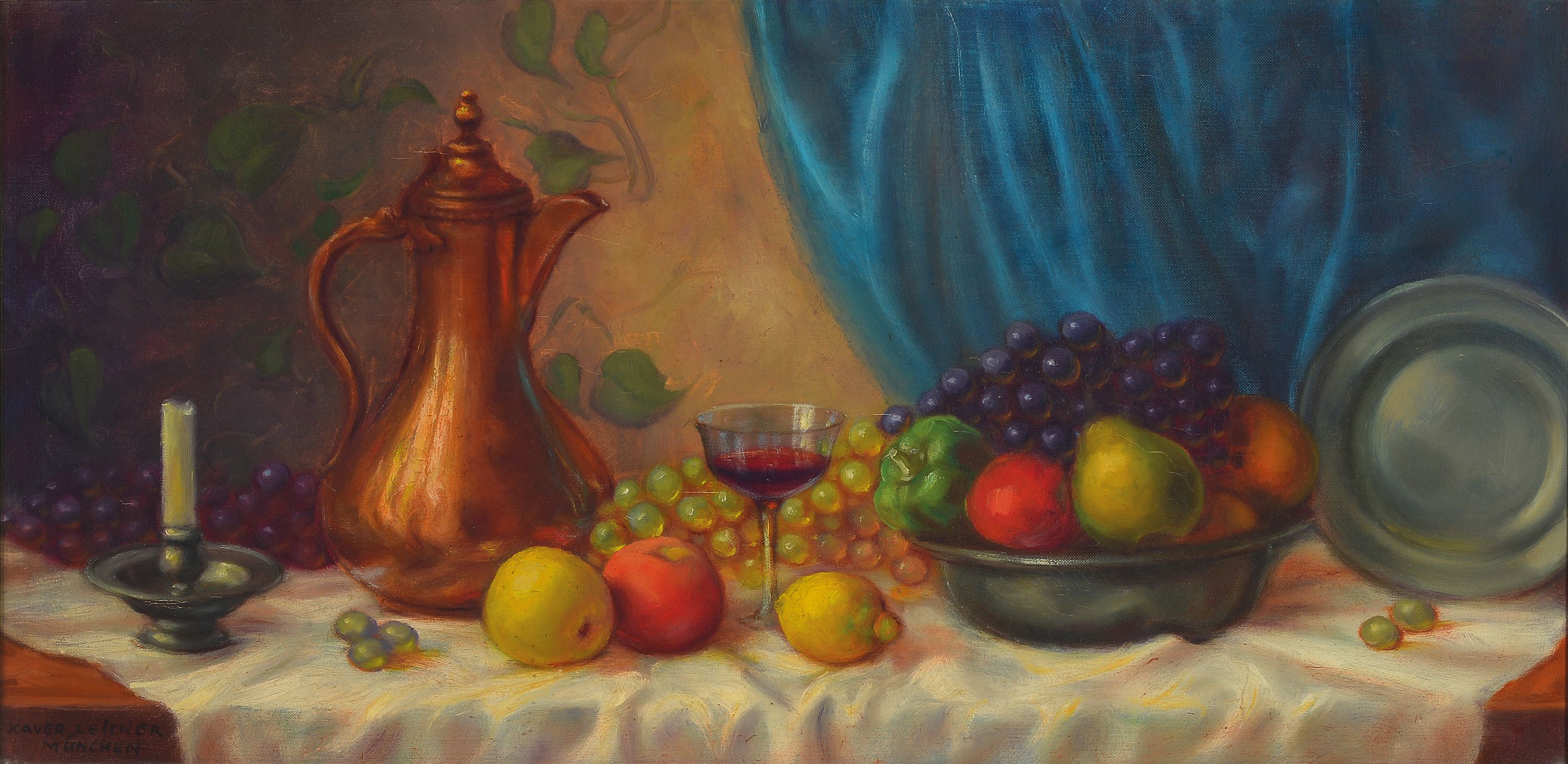 Xavier Leitner, geb.1925-?, Münchener Schule , Stillleben mit Früchten und Tafelgerät,