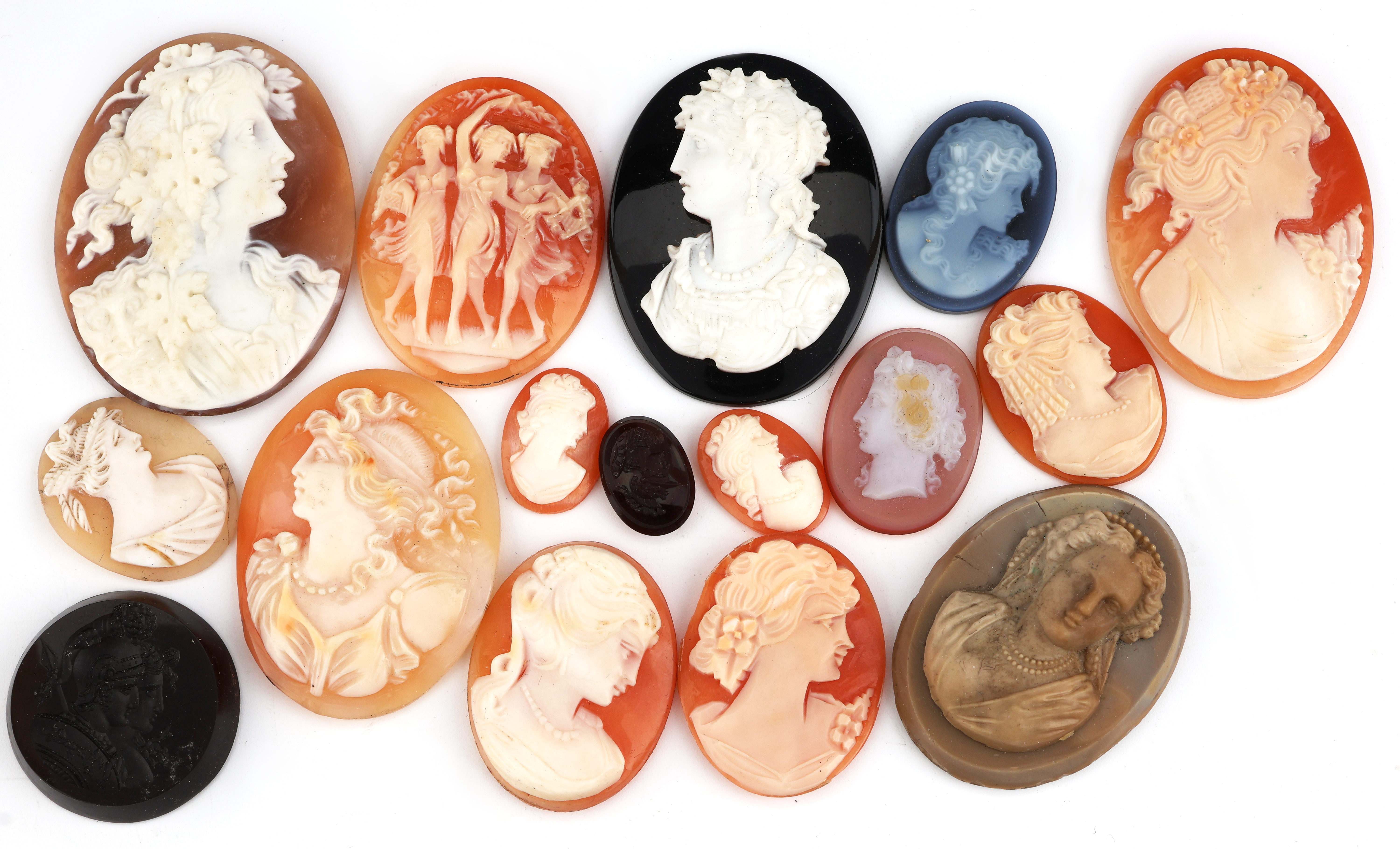 Lot 16 lose Gemmen, versch. Materialien, Muschel, Lagenstein und Achat, versch. Größen,